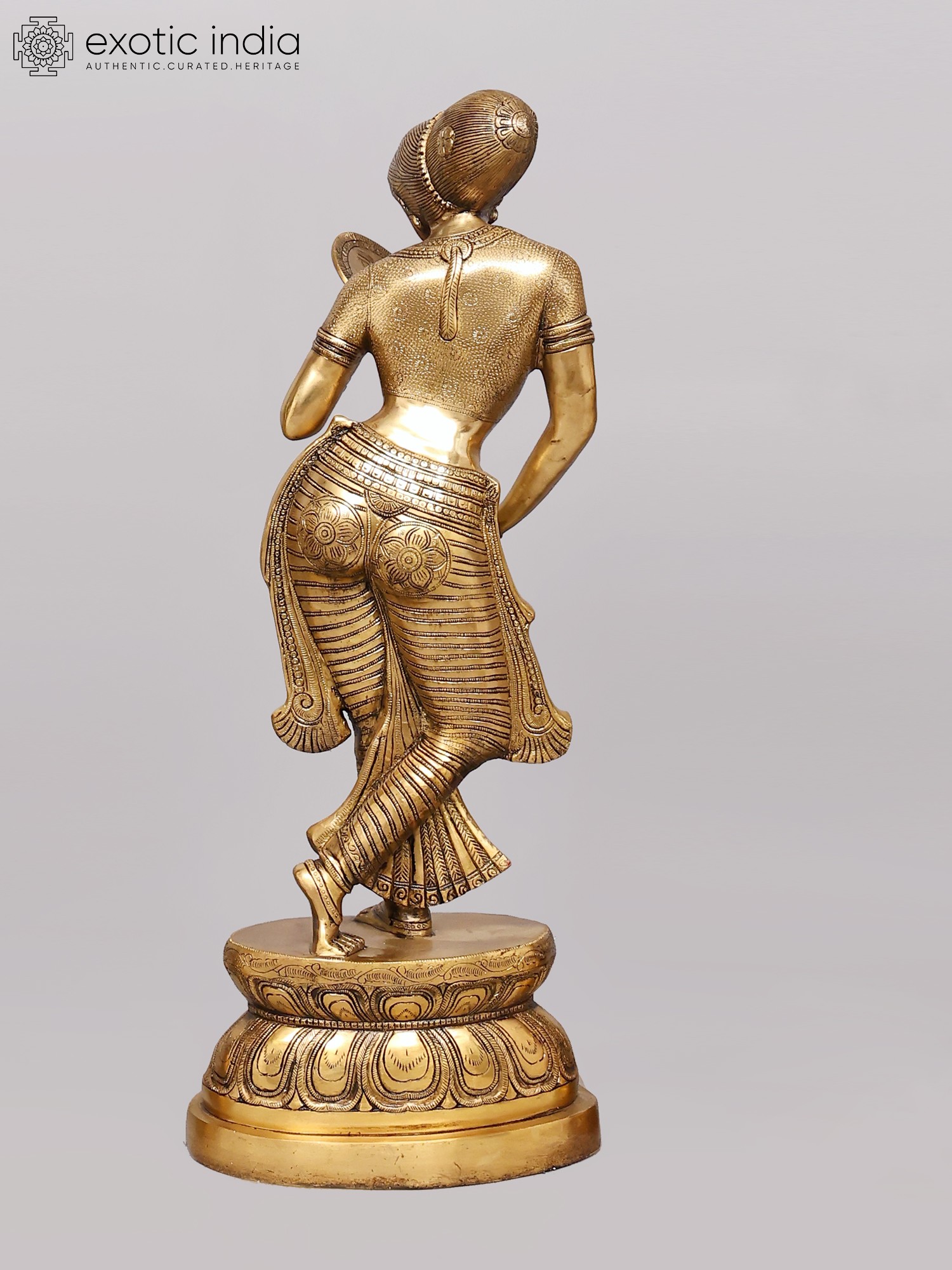 This sculpture of a lady on a high-raised multi-layered lotus pedestal entices the viewer with its mesmerized beauty and dignity.