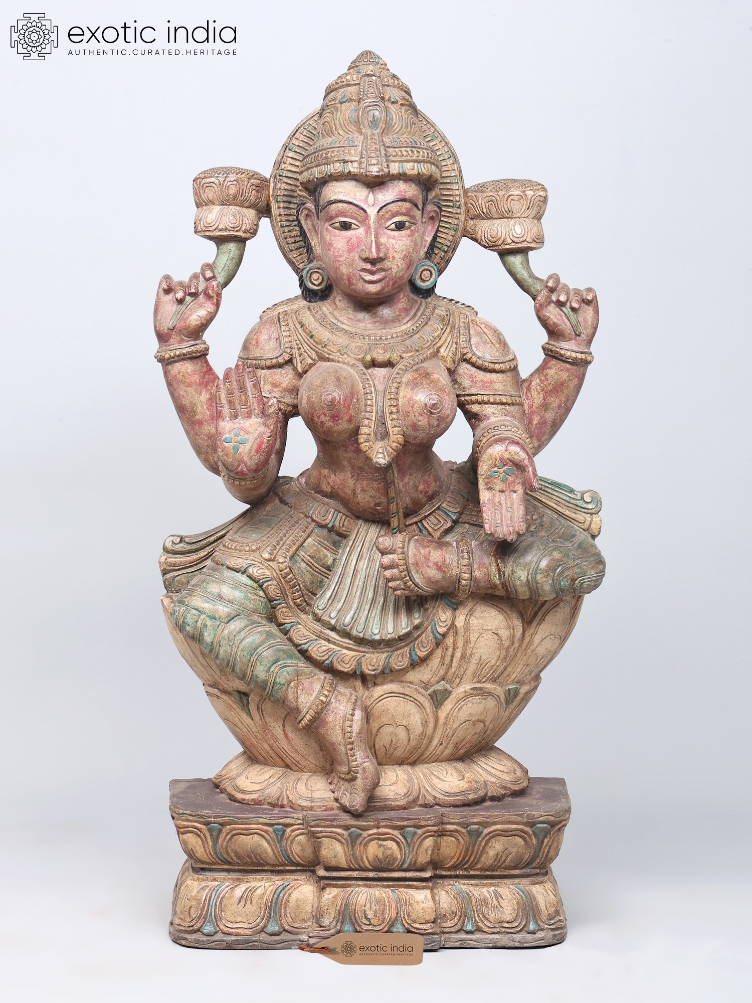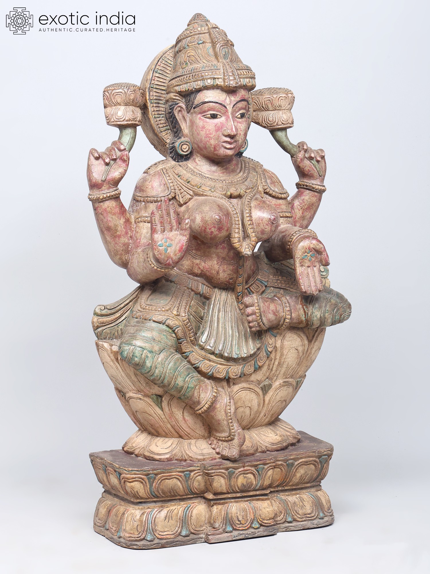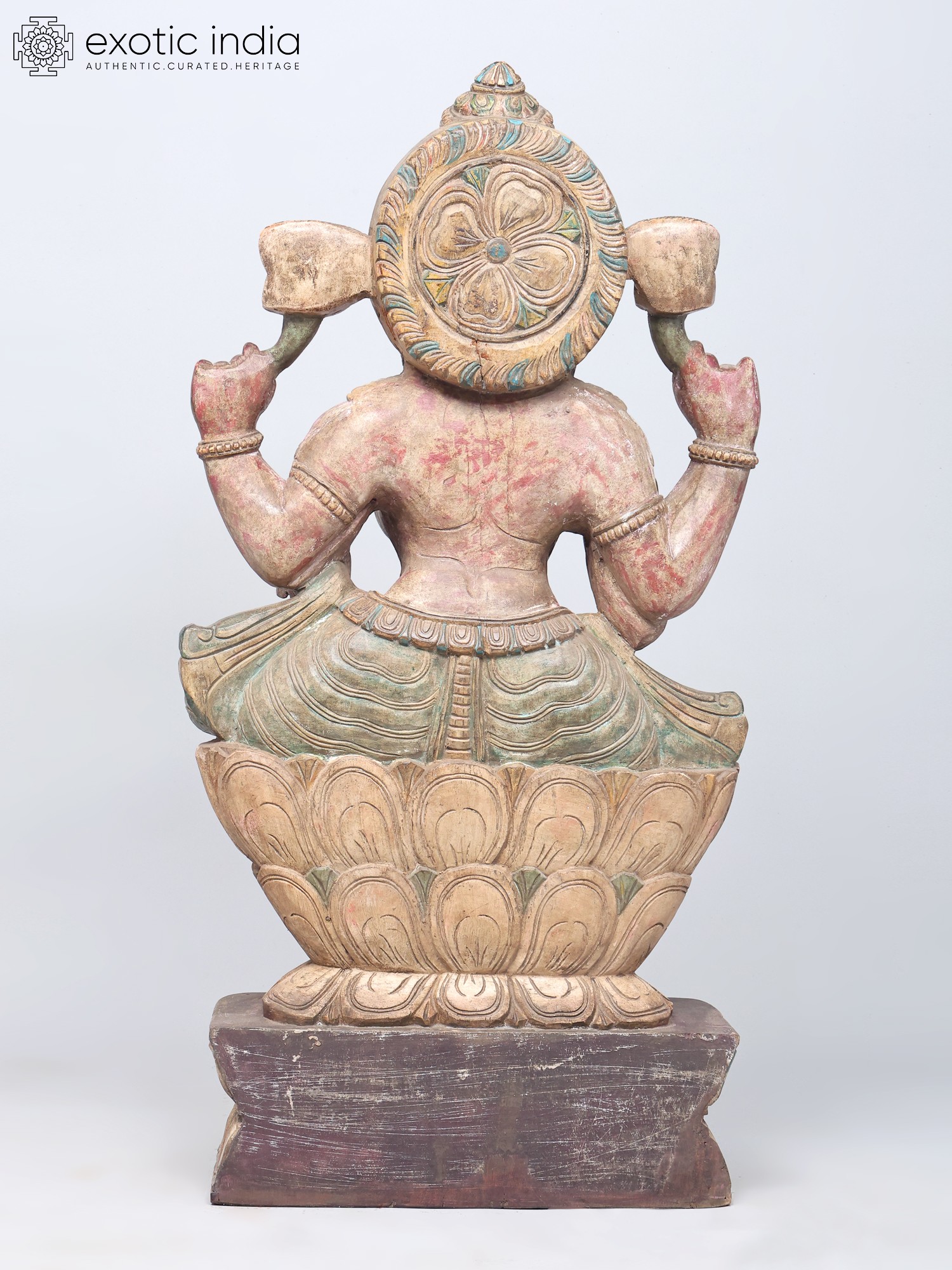 36" Large Blessing Goddess Lakshmi Seated on Lotus | Wood Carved Statue