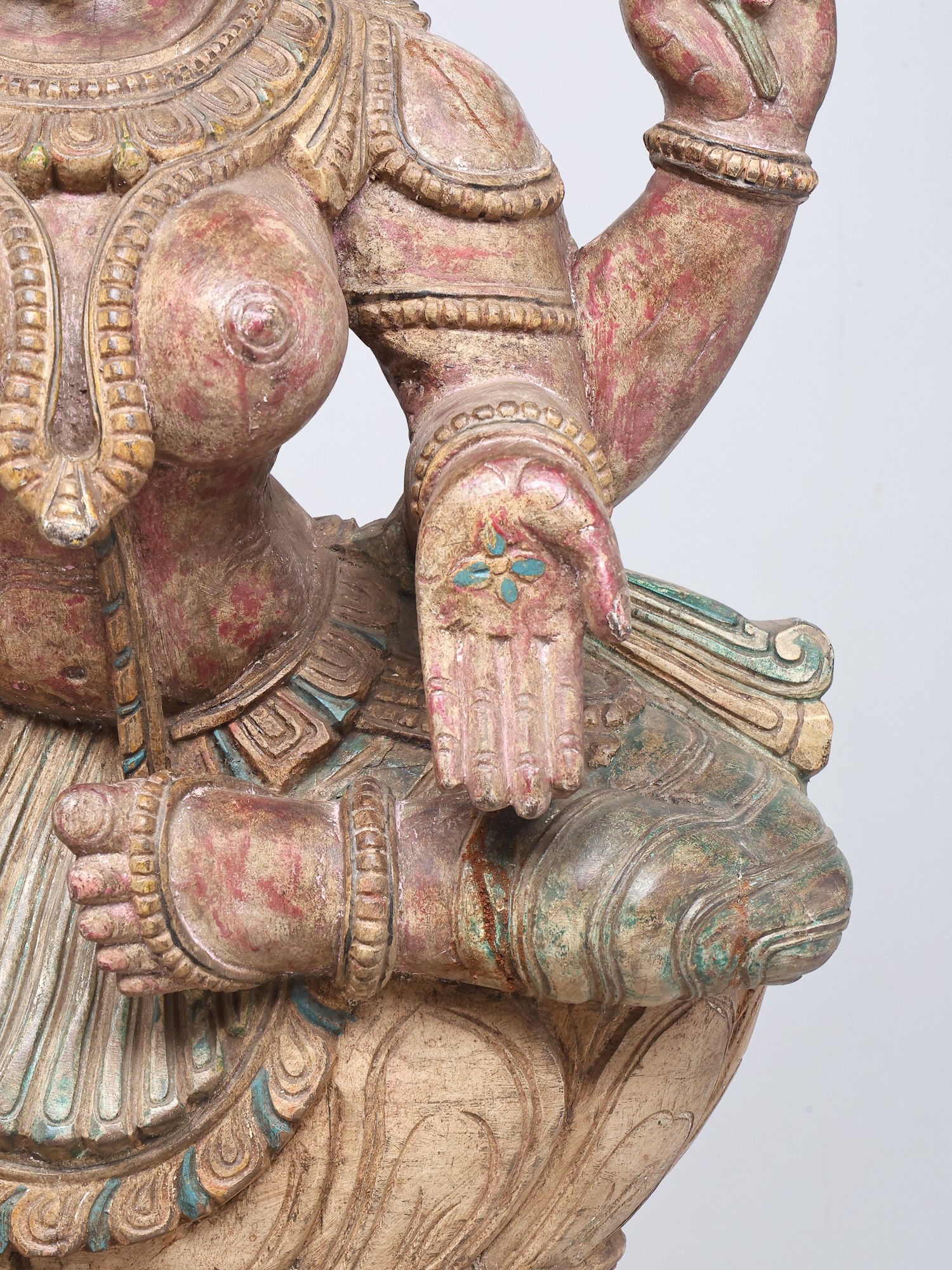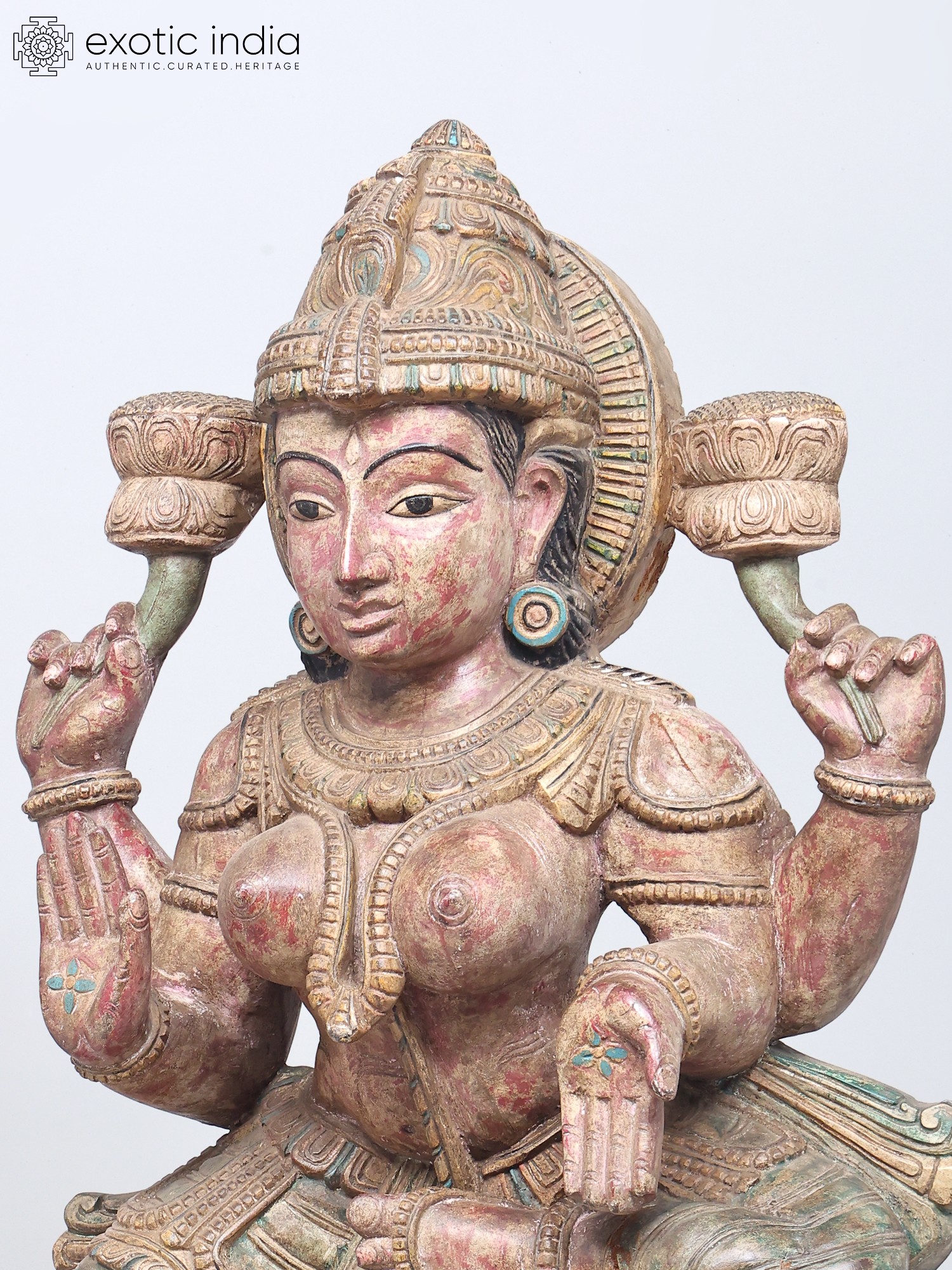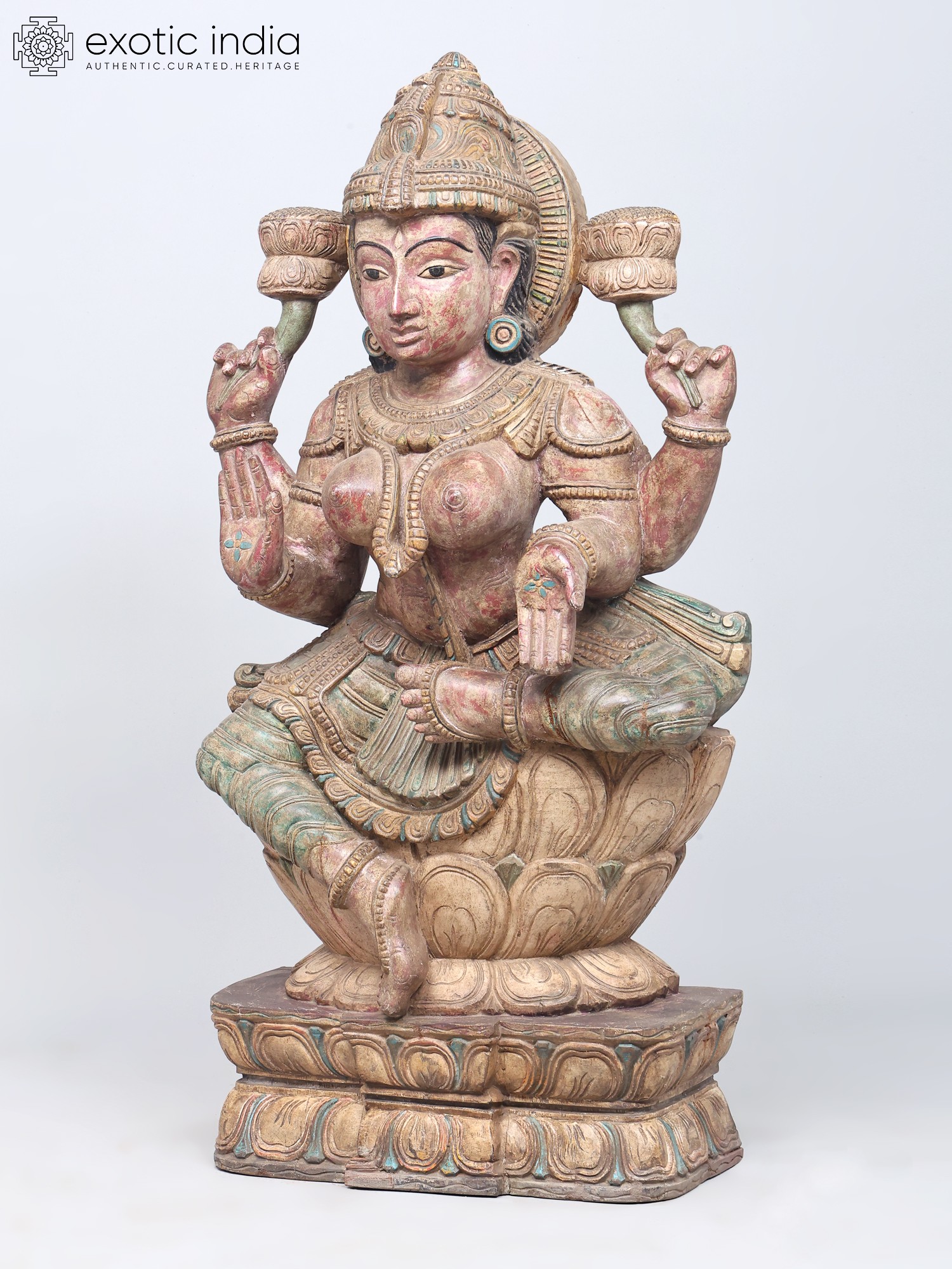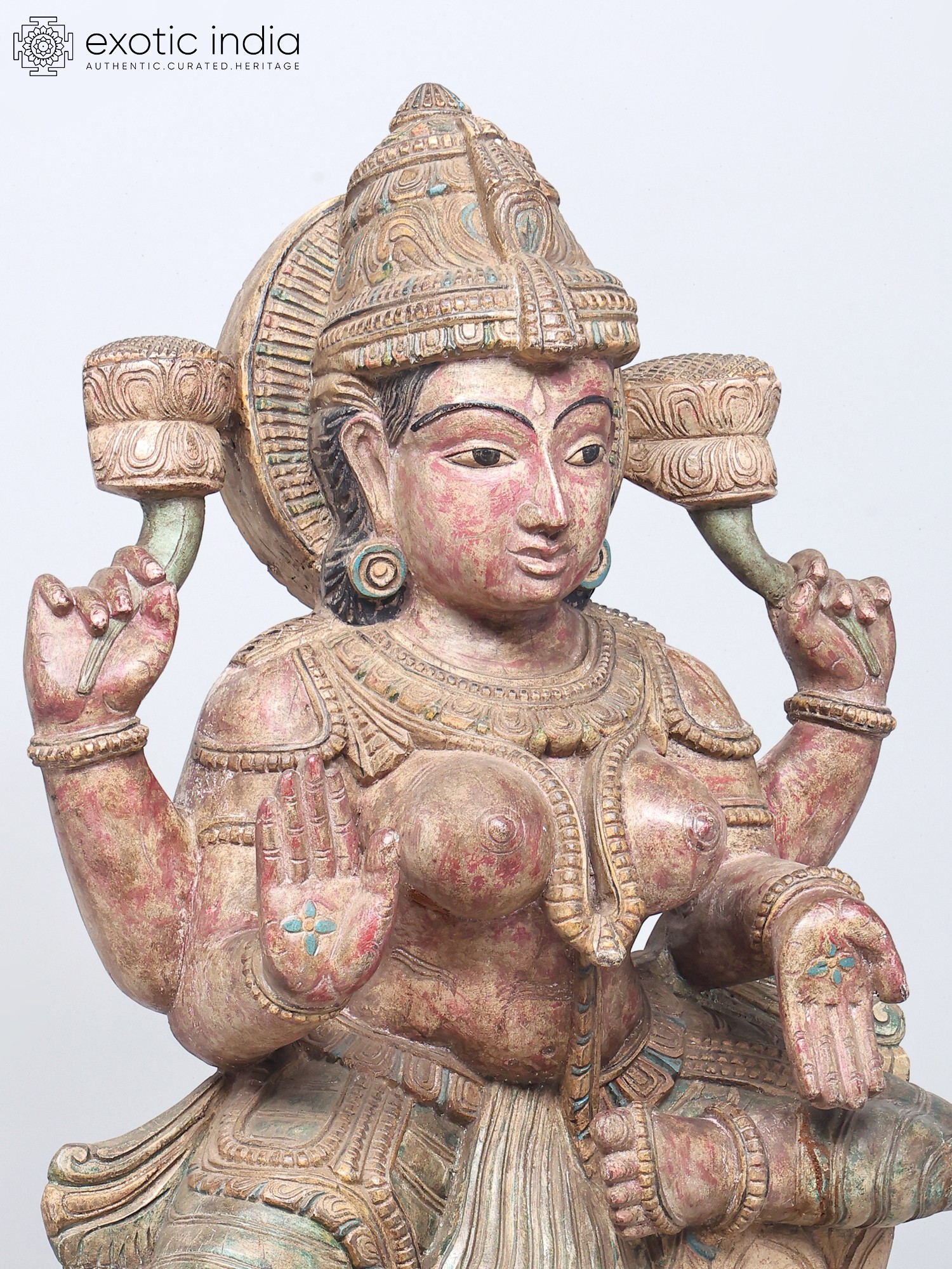 36" Large Blessing Goddess Lakshmi Seated on Lotus | Wood Carved Statue