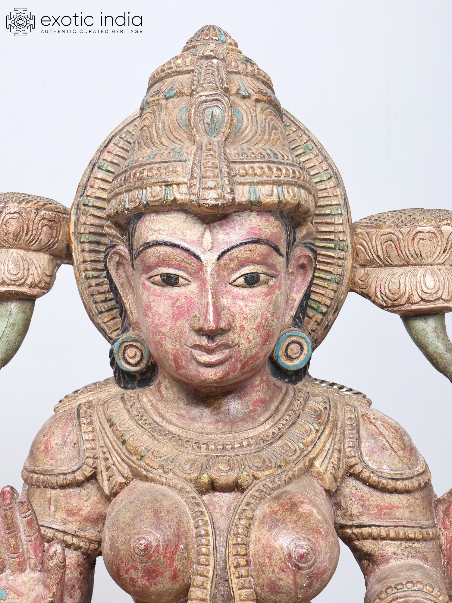 Hailing from the rich artistic heritage of South India, this statue reflects the region's deep-rooted traditions of religious art and craftsmanship. The wood medium itself carries a sense of natural elegance and warmth, often chosen for its spiritual resonance. This piece is a testament to the enduring legacy of artisanal skill passed down through generations. Its substantial size makes it a commanding presence, perfect for a focal point in your living room, meditation space, or as a distinguished addition to your collection of South Indian art. It serves as a constant reminder of the goddess's benevolent gaze and her power to usher in abundance and well-being into your life.