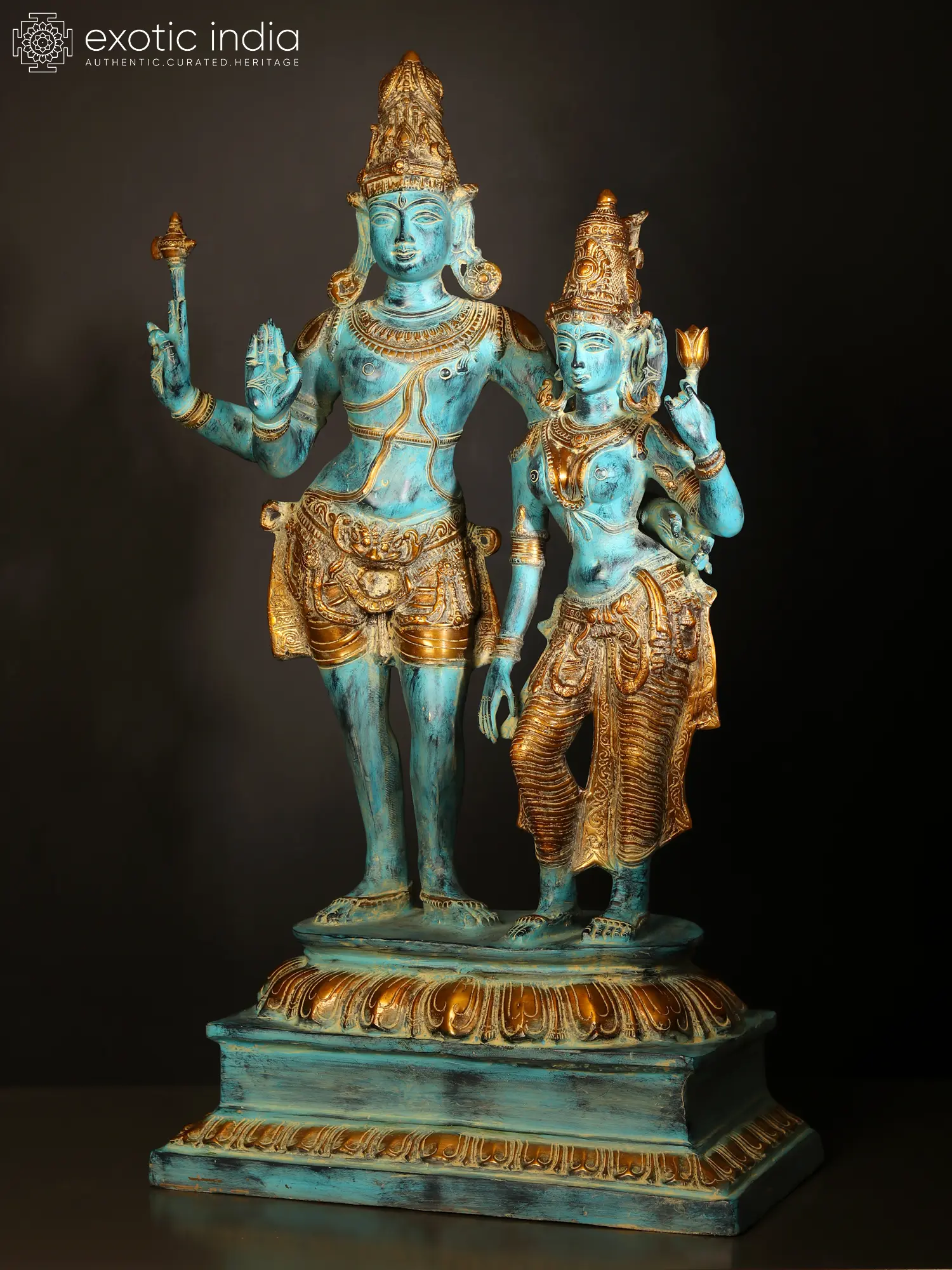 Bitone composition: cobalt blue for the natural complexion of the deities and the middle tier of the plinth, gold for every other detail such as crown and attire and adornment of the deities and the lotus petals on the top and bottom tiers of the plinth.