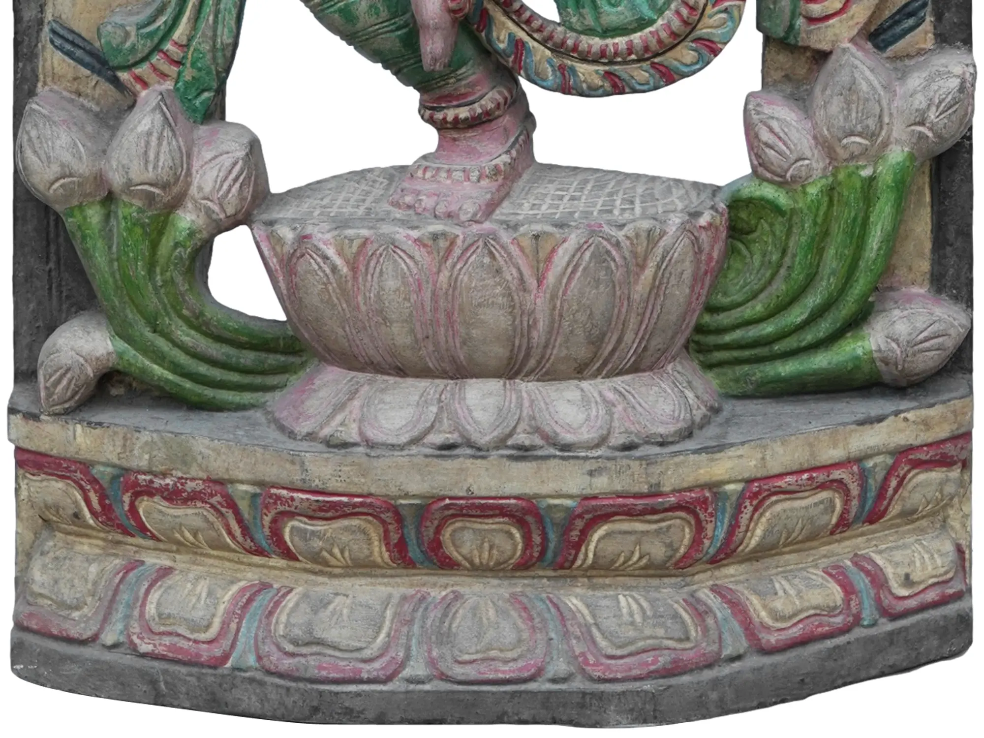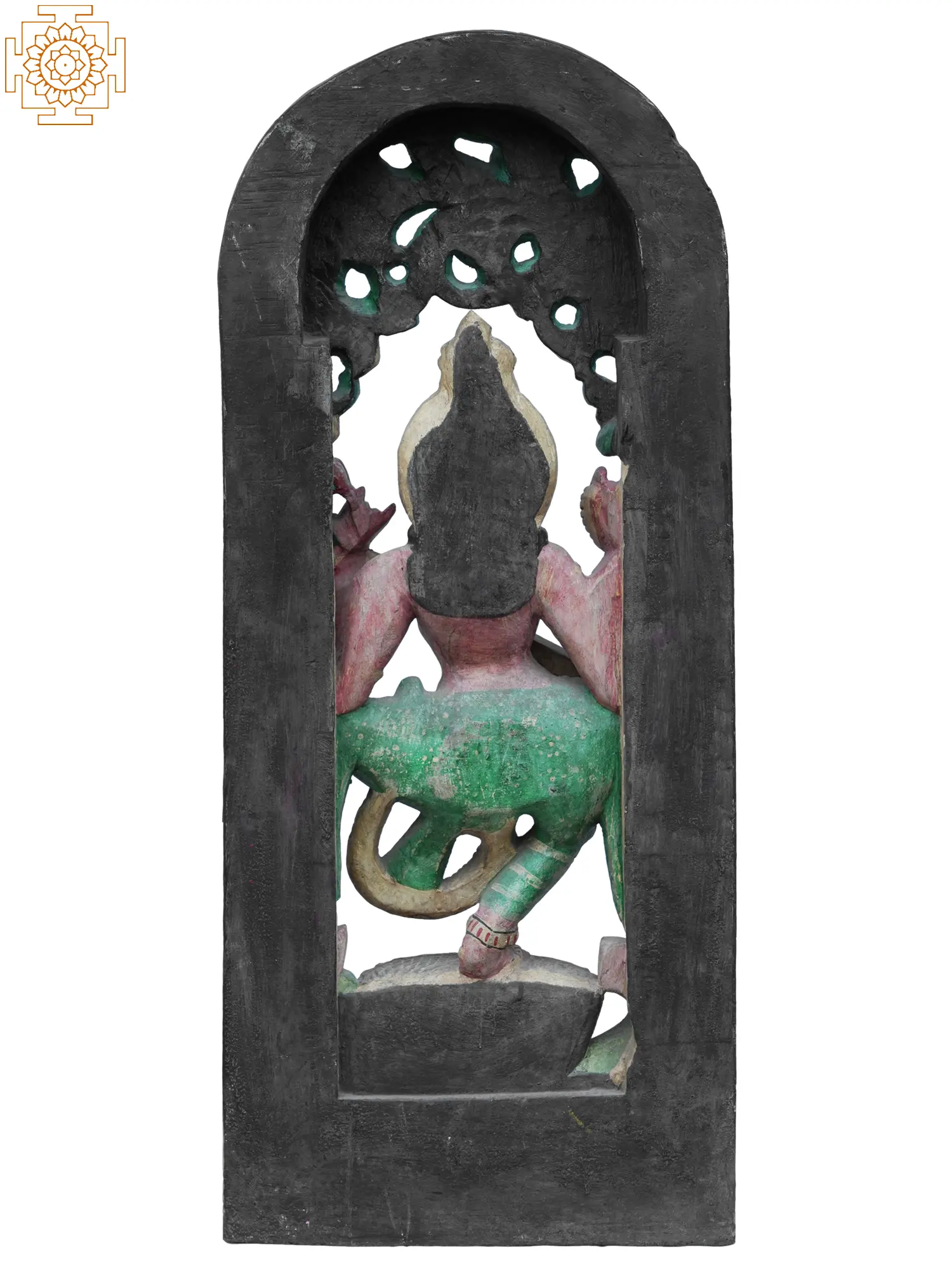 This magnificent wooden statue captures the divine grace and artistic essence of Goddess Saraswati, the revered Hindu deity of knowledge, music, art, speech, and wisdom. She is depicted in a dynamic dance pose, her form exuding an aura of creative energy and spiritual fervor. Her slender, multi-armed figure is intricately carved, showcasing the delicate details of her attire and ornamentation. In her hands, she gracefully holds a sitar, the instrument that symbolizes her mastery over melody and her association with the harmonious vibrations of the universe. The statue is framed by an ornate archway, alive with natural motifs and symbolic imagery. Lush foliage, rendered with exquisite detail, entwines to form a canopy, while playful peacocks, often associated with Saraswati, perch and adorn this celestial enclosure. The vibrant colors, though aged, still speak of the rich tradition and devotion invested in its creation. Each stroke of the chisel has brought to life the fluidity of movement and the serene yet powerful presence of the Goddess. Saraswati's auspicious presence is believed to bestow clarity of thought, eloquence, and artistic inspiration. She is the muse of poets, musicians, artists, and scholars, guiding them towards intellectual pursuits and creative expression. In Hindu mythology, she is often depicted emerging from the lotus flower, a symbol of purity and enlightenment, and this statue beautifully incorporates this imagery at its base. Her dance is not merely a physical movement but a cosmic rhythm, an expression of the divine order that underpins all creation. The presence of the sitar further emphasizes her role as the source of all music and the embodiment of divine sound, Nada Brahma. This sculpture is more than just an artistic representation; it is a conduit for invoking the blessings of Saraswati. Whether placed in a home, a place of learning, or a spiritual sanctuary, it serves as a constant reminder of the pursuit of knowledge, the beauty of art, and the power of creative expression. The craftsmanship reflects a deep understanding of both the aesthetic and the spiritual dimensions of the Goddess, making it a truly captivating piece for any admirer of Indian art and culture.