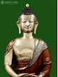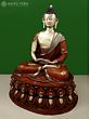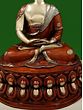 On a double-tiered lotus-shaped throne, the seated Buddha plunges into contemplation. The word is samadhi, a term from the yogasootras which translates to profound, keen contemplation. Robes of gold and scarlet (two different colour variations) blend in with the hue of the petals of the lotus, as if the erstwhile Shakyamuni is now one with the lotus flower.