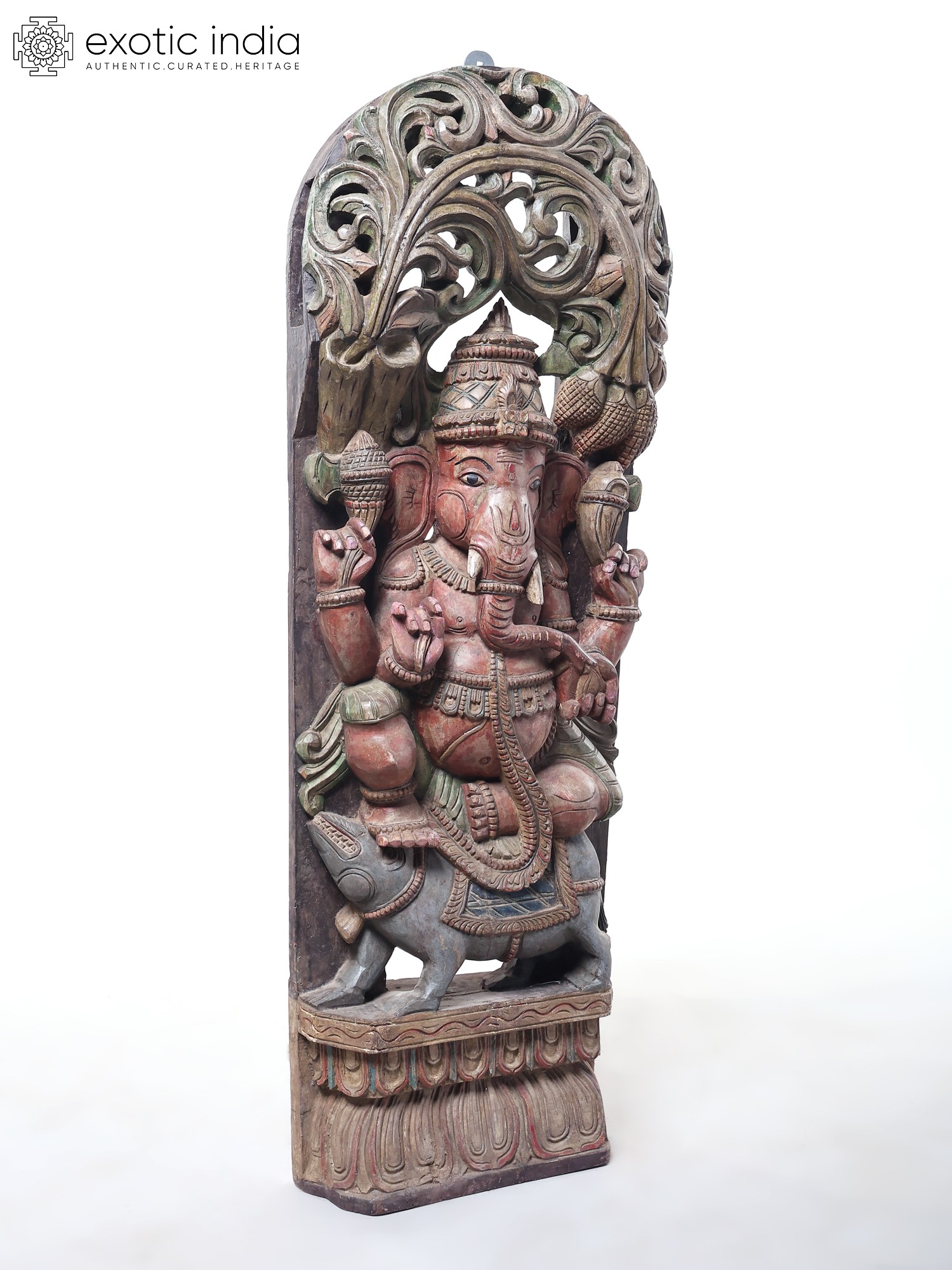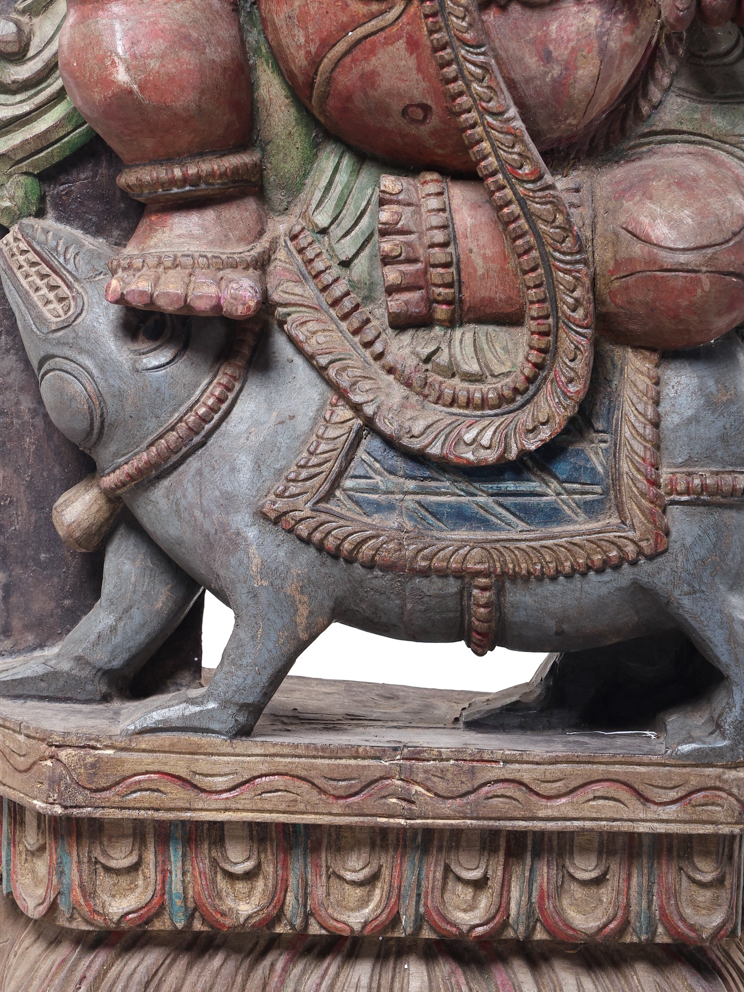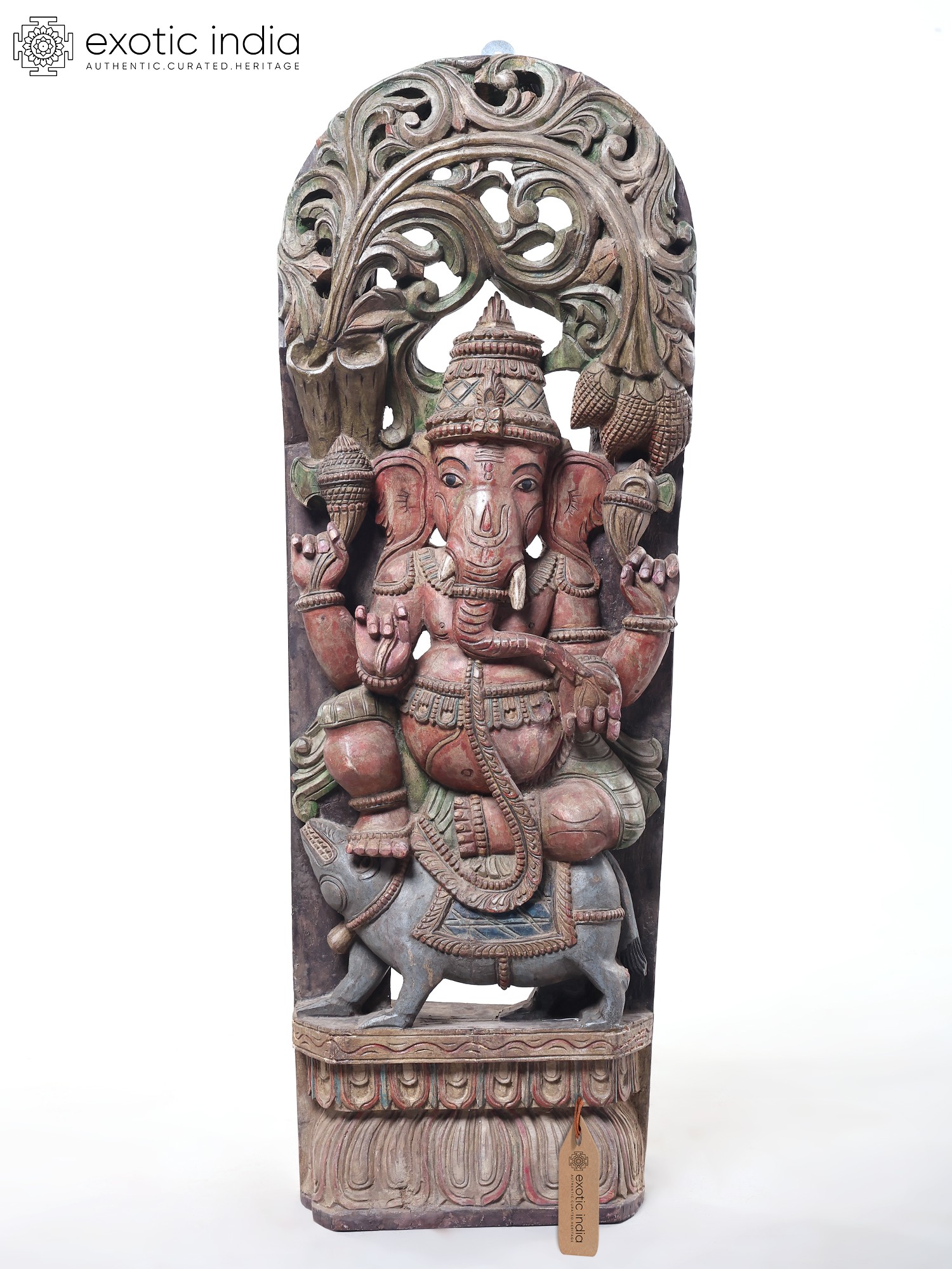 36" Large Four Armed Lord Ganesha Seated on His Vahana Mushak | Wood Carved Statue