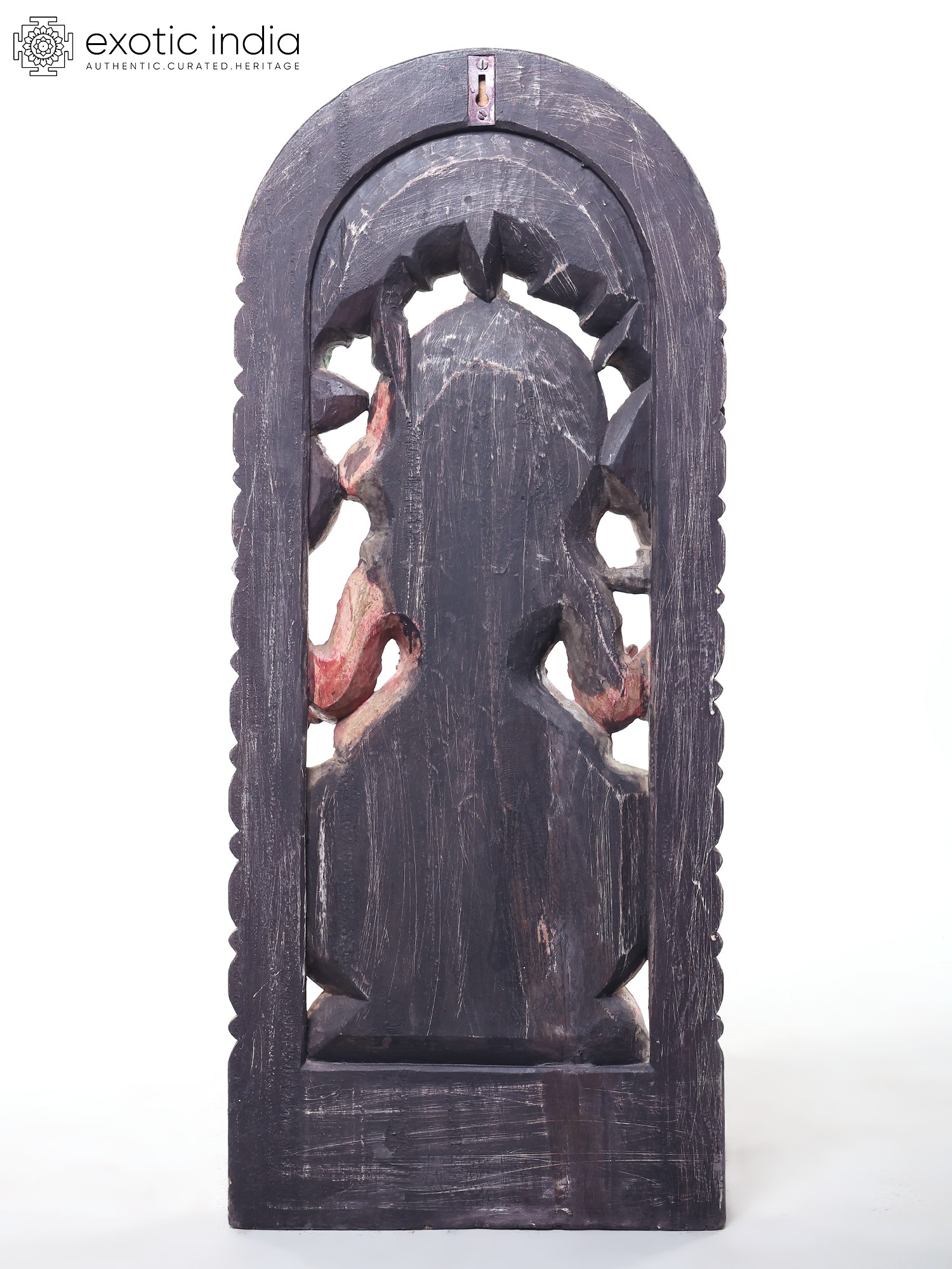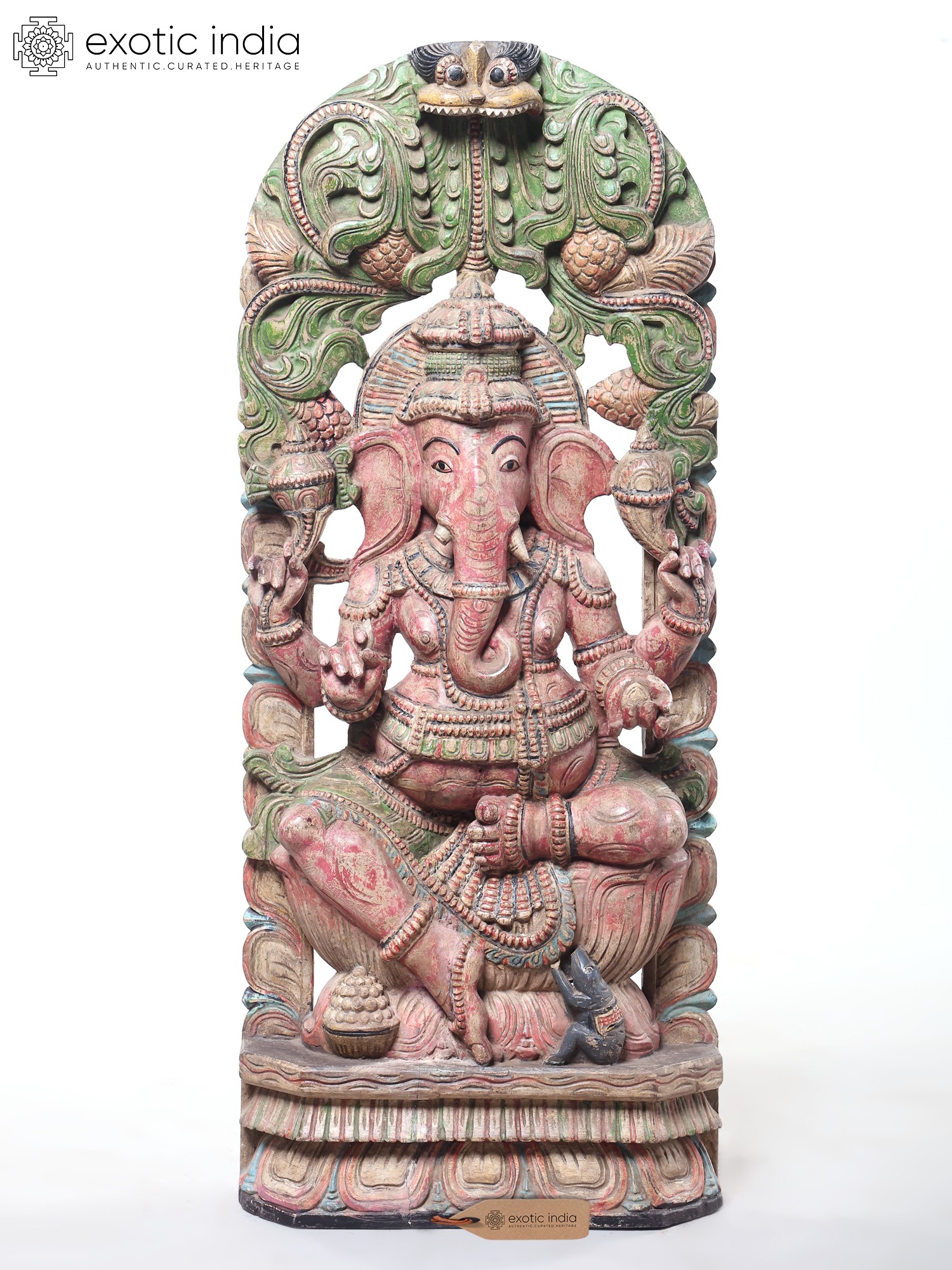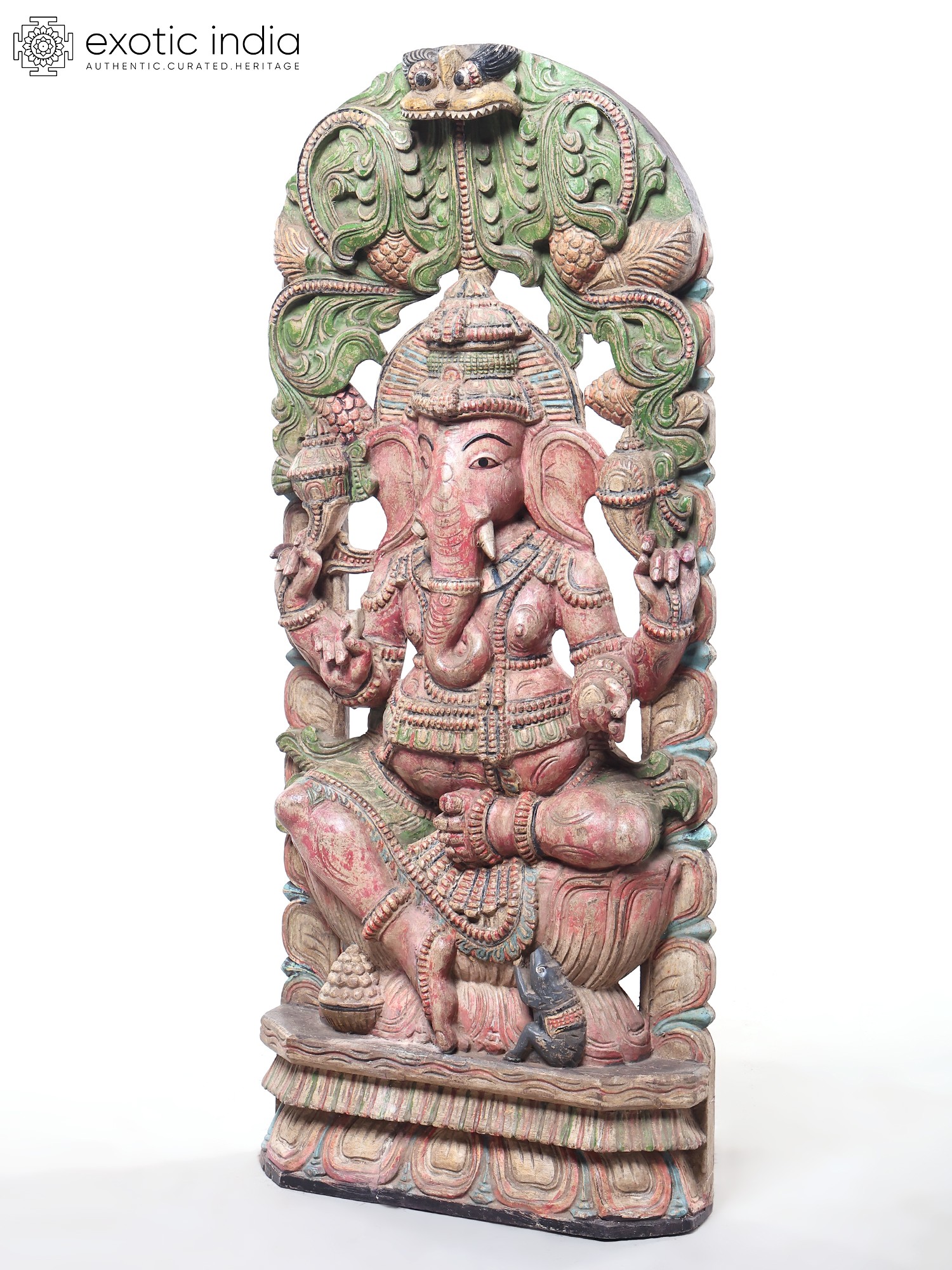 The detailed craftsmanship evident in this carving is a testament to the rich artistic traditions of India. From the serene expression on Ganesha's face to the elaborate ornamentation adorning his form, every element has been meticulously rendered. The arched backdrop, featuring stylized motifs and perhaps even representations of mythical creatures, adds a dramatic and captivating dimension to the piece. The subtle yet vibrant color accents, highlighting the natural grain of the wood, bring the deity to life and evoke a sense of sacred beauty. The inclusion of his divine mount, the mouse (Mooshika), who symbolizes Ganesha's ability to overcome even the smallest of obstacles, further enhances the narrative and spiritual depth of this artwork. Displaying this magnificent carving in your home or office is not just an aesthetic choice, but a profound invitation to welcome the blessings of wisdom, success, and the removal of all impediments on your life's journey.