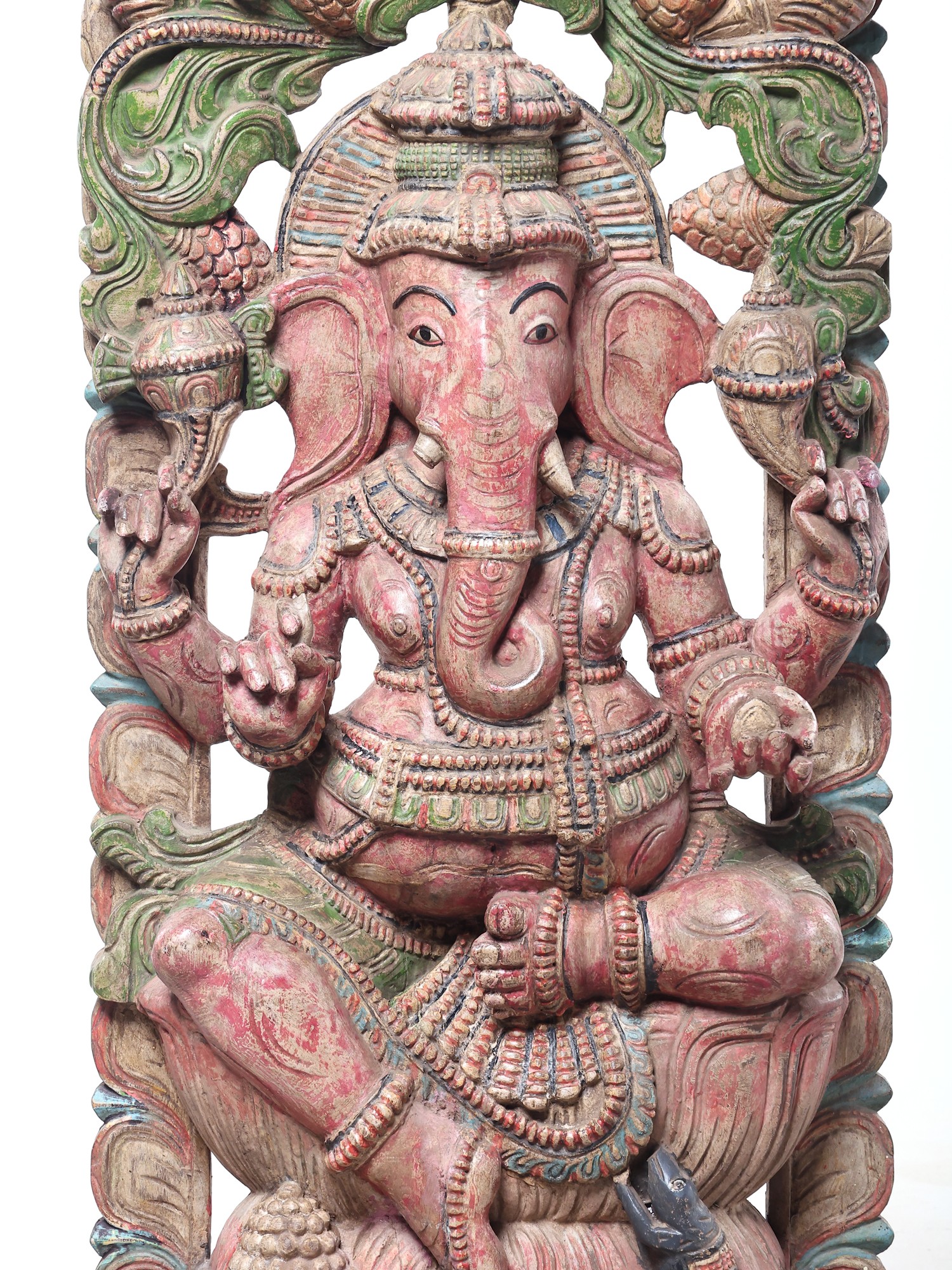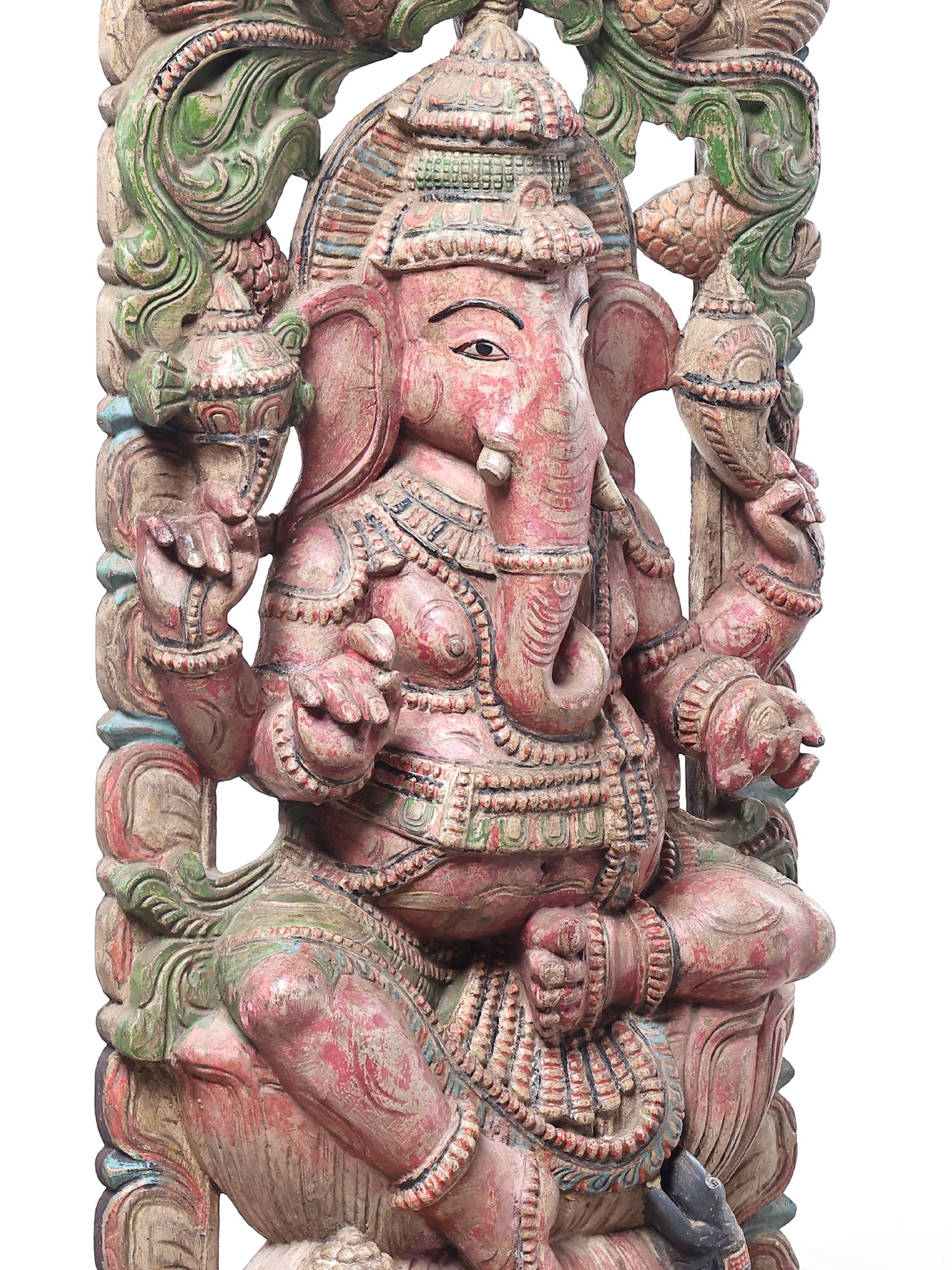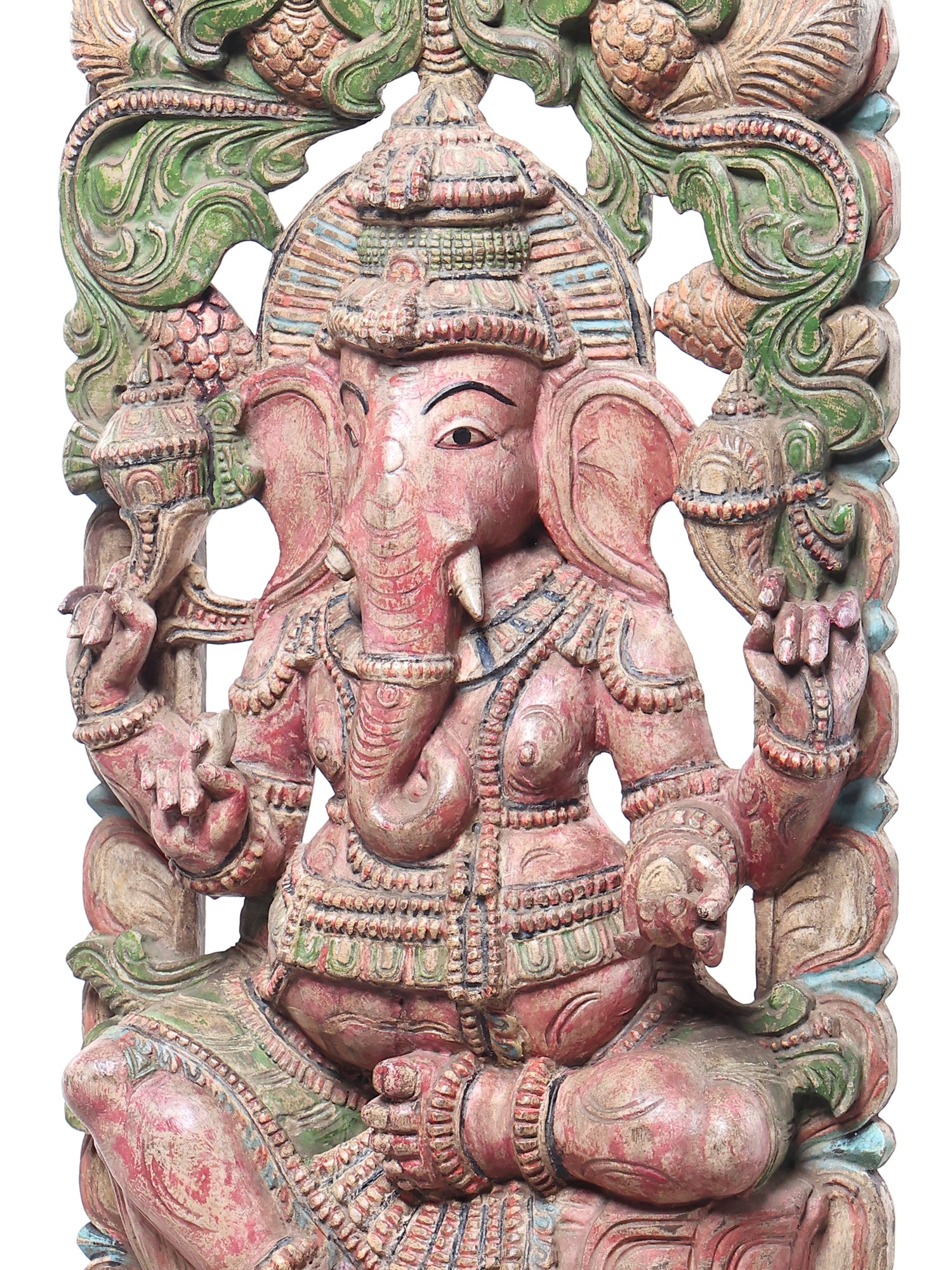 The detailed craftsmanship evident in this carving is a testament to the rich artistic traditions of India. From the serene expression on Ganesha's face to the elaborate ornamentation adorning his form, every element has been meticulously rendered. The arched backdrop, featuring stylized motifs and perhaps even representations of mythical creatures, adds a dramatic and captivating dimension to the piece. The subtle yet vibrant color accents, highlighting the natural grain of the wood, bring the deity to life and evoke a sense of sacred beauty. The inclusion of his divine mount, the mouse (Mooshika), who symbolizes Ganesha's ability to overcome even the smallest of obstacles, further enhances the narrative and spiritual depth of this artwork. Displaying this magnificent carving in your home or office is not just an aesthetic choice, but a profound invitation to welcome the blessings of wisdom, success, and the removal of all impediments on your life's journey.
