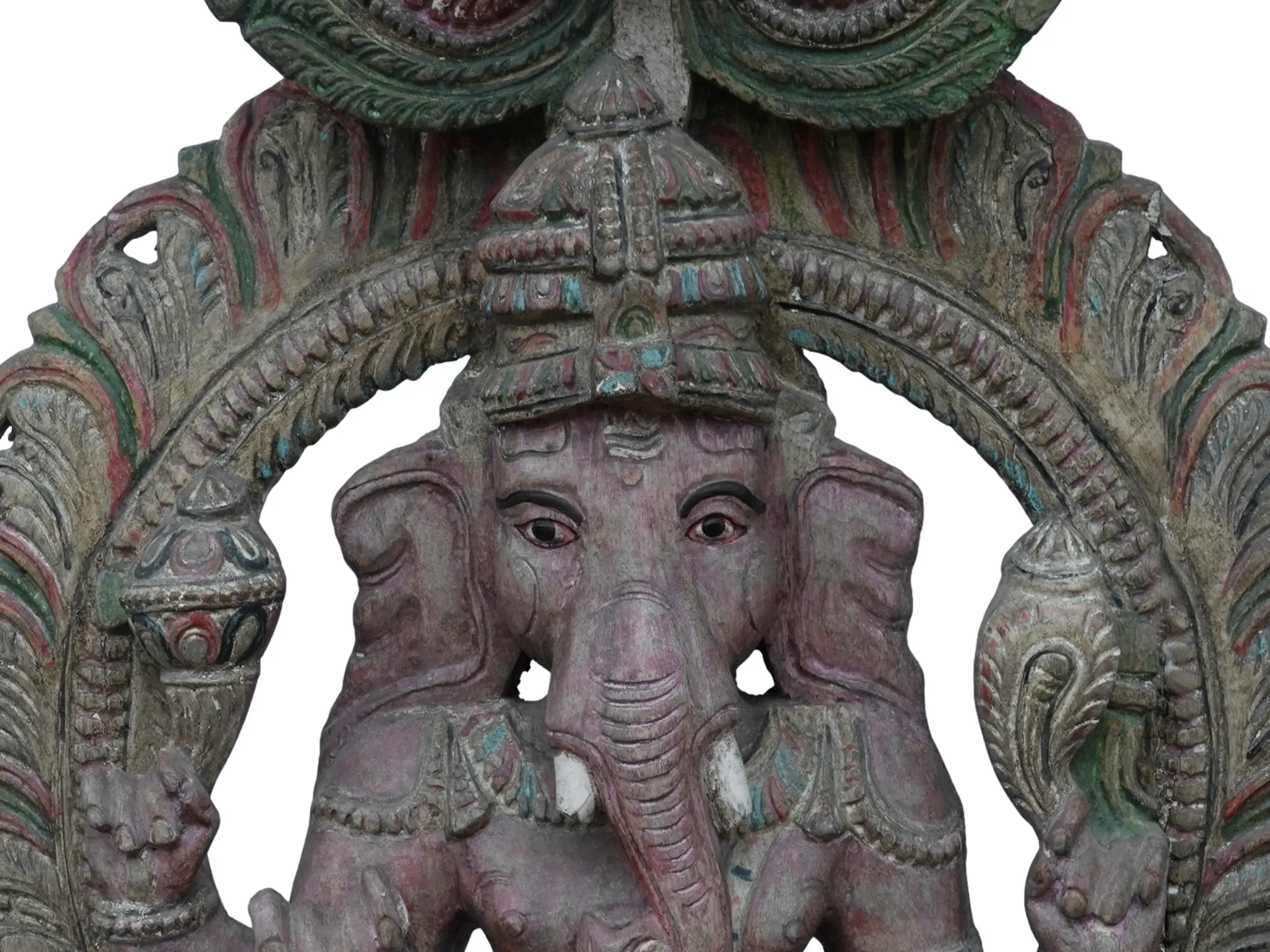 This statue captures Ganesha in a seated posture, radiating an aura of calm authority and benevolent power. He is adorned with traditional regalia, and His multiple arms are depicted holding symbolic objects, each representing a different aspect of His divine attributes. The weathered finish of the wood, with subtle hints of red and green, adds depth and character, suggesting an object with a rich history, perhaps an heirloom passed down through generations or a treasured find from a distant land. The elaborate archway framing Ganesha further enhances the grandeur of the piece, reminiscent of temple doorways and sacred mandalas, which often feature intricate floral or symbolic motifs. Placing this statue in your living space, entryway, or altar is believed to invite positive energy and protection, serving as a constant reminder of divine grace and the power of overcoming challenges. It's more than just a decorative item; it's a conduit for blessings and a beautiful expression of faith. ––––––––––––––––––––