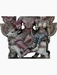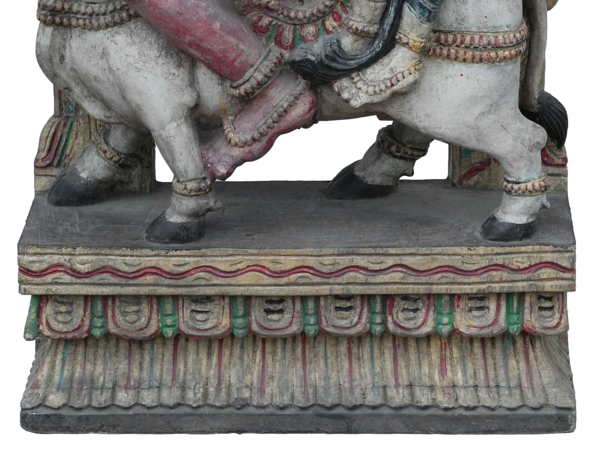 This magnificent wooden statue captures the serene and powerful presence of Lord Shiva and Goddess Parvati in their divine union, seated upon the ever-faithful Nandi, Shiva's vahana (mount). The sculpture embodies the harmonious balance of masculine and feminine energies, a core tenet in Hindu philosophy. Lord Shiva, the destroyer and transformer, sits with an aura of calm strength, adorned with traditional iconography that speaks of his cosmic significance. Beside him, Goddess Parvati, the embodiment of power, love, and devotion, radiates a gentle grace. The posture of Shiva and Parvati on Nandi symbolizes their journey through the cosmos, a representation of the divine couple's constant movement and activity in maintaining universal order. Nandi, depicted with reverence, serves not just as a vehicle but as a symbol of purity, strength, and unwavering devotion, always ready to carry his master. The intricate detailing of the wood carving, enhanced by vibrant, yet subdued, coloring, brings to life the divine narrative. The ornate halo or prabhamandala framing the deities is reminiscent of celestial glory and the boundless nature of the divine.