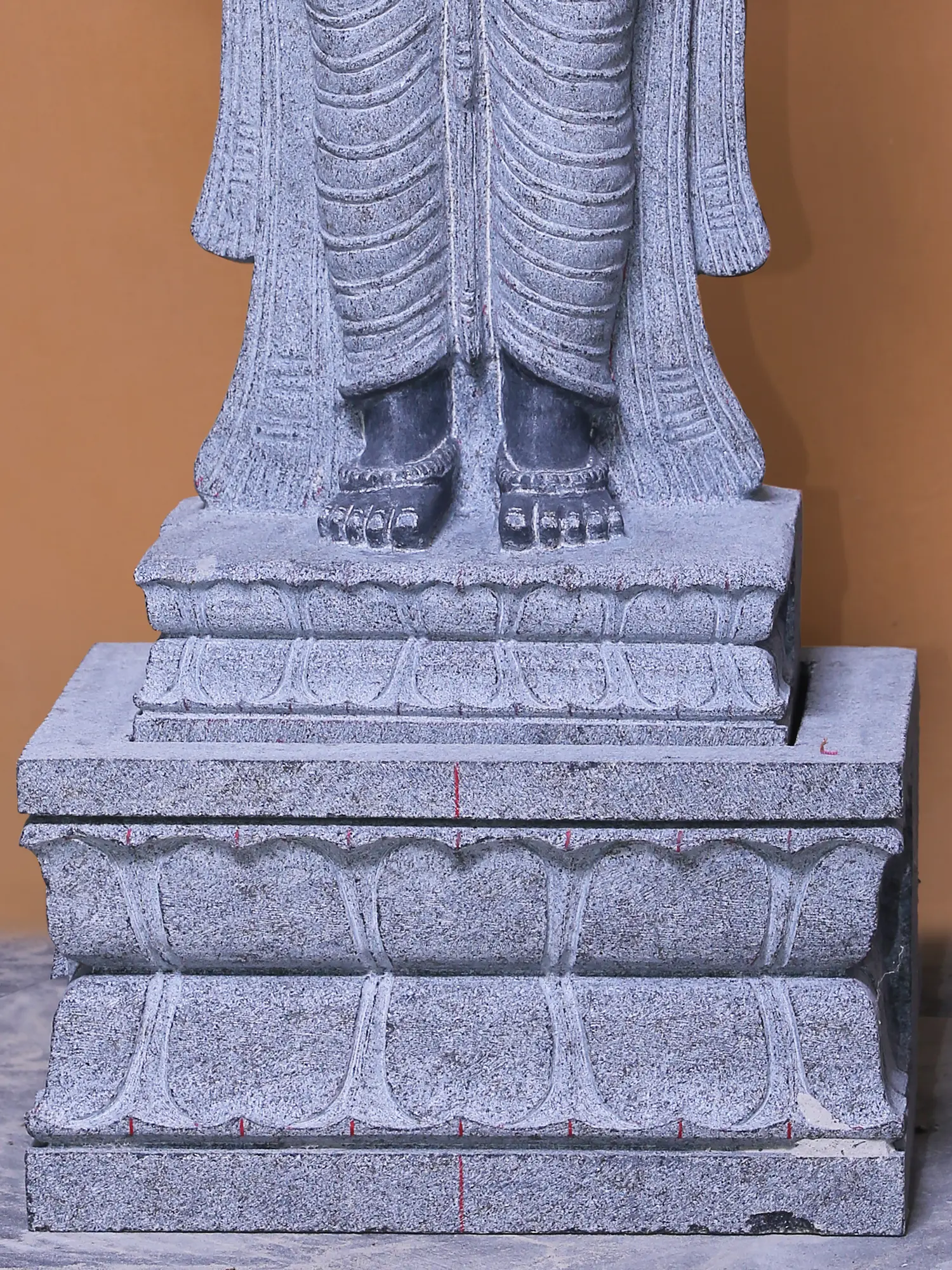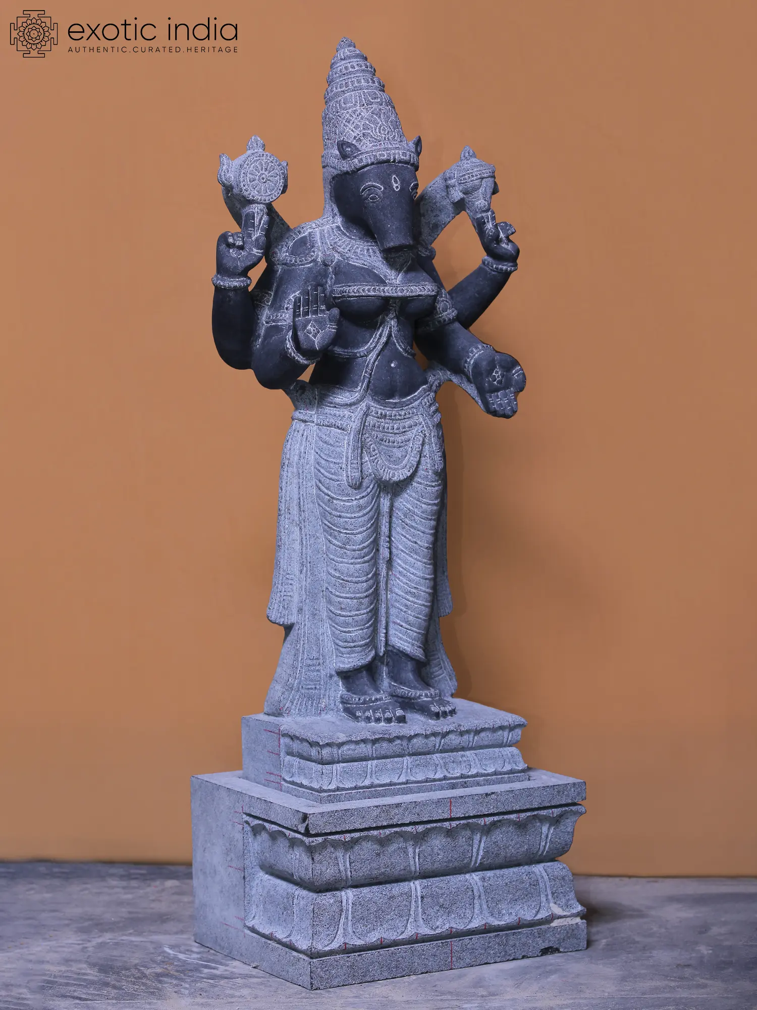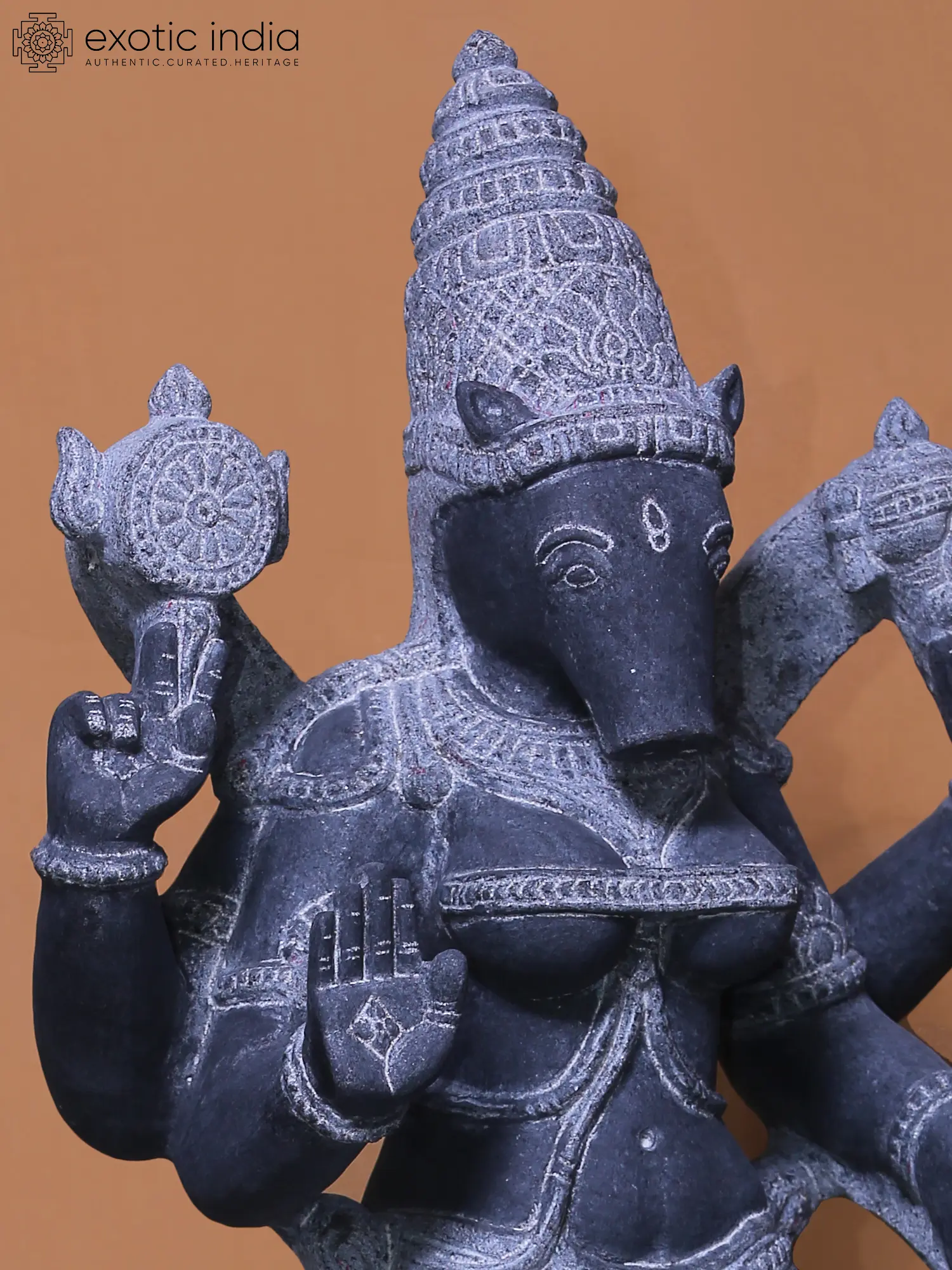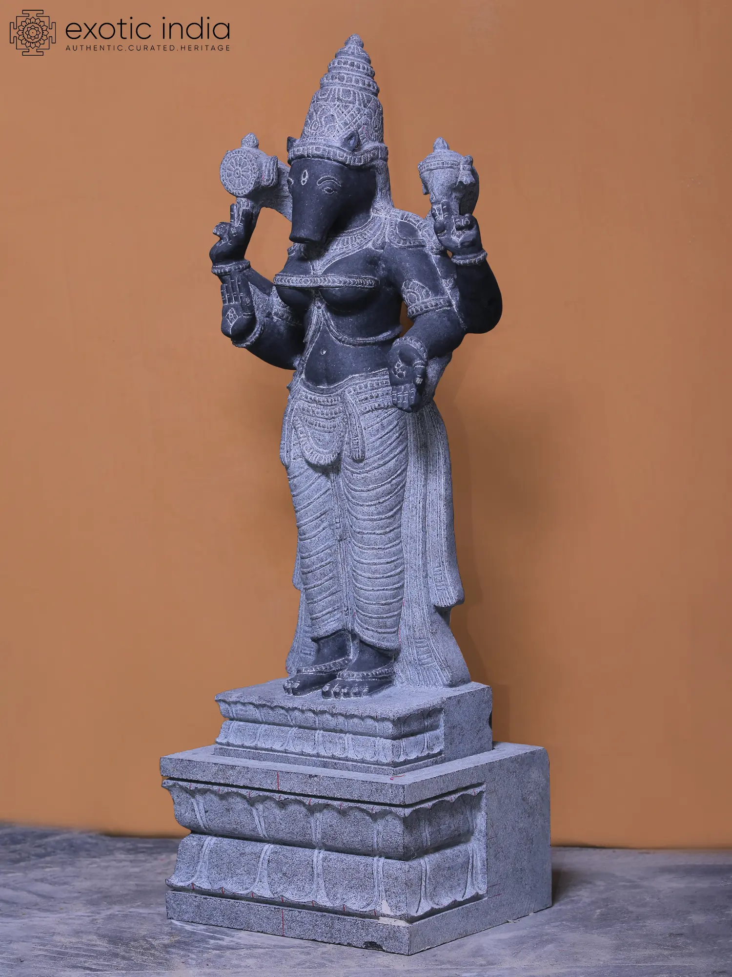 The granite stone statute naturally carries a dark color, ideal for the presence of Dhoomra-Varahai, who appears adorned in Vaishnava attributes- elongated crown, Kartari-mudra (scissor-like gesture) in which she holds conch and discus.
