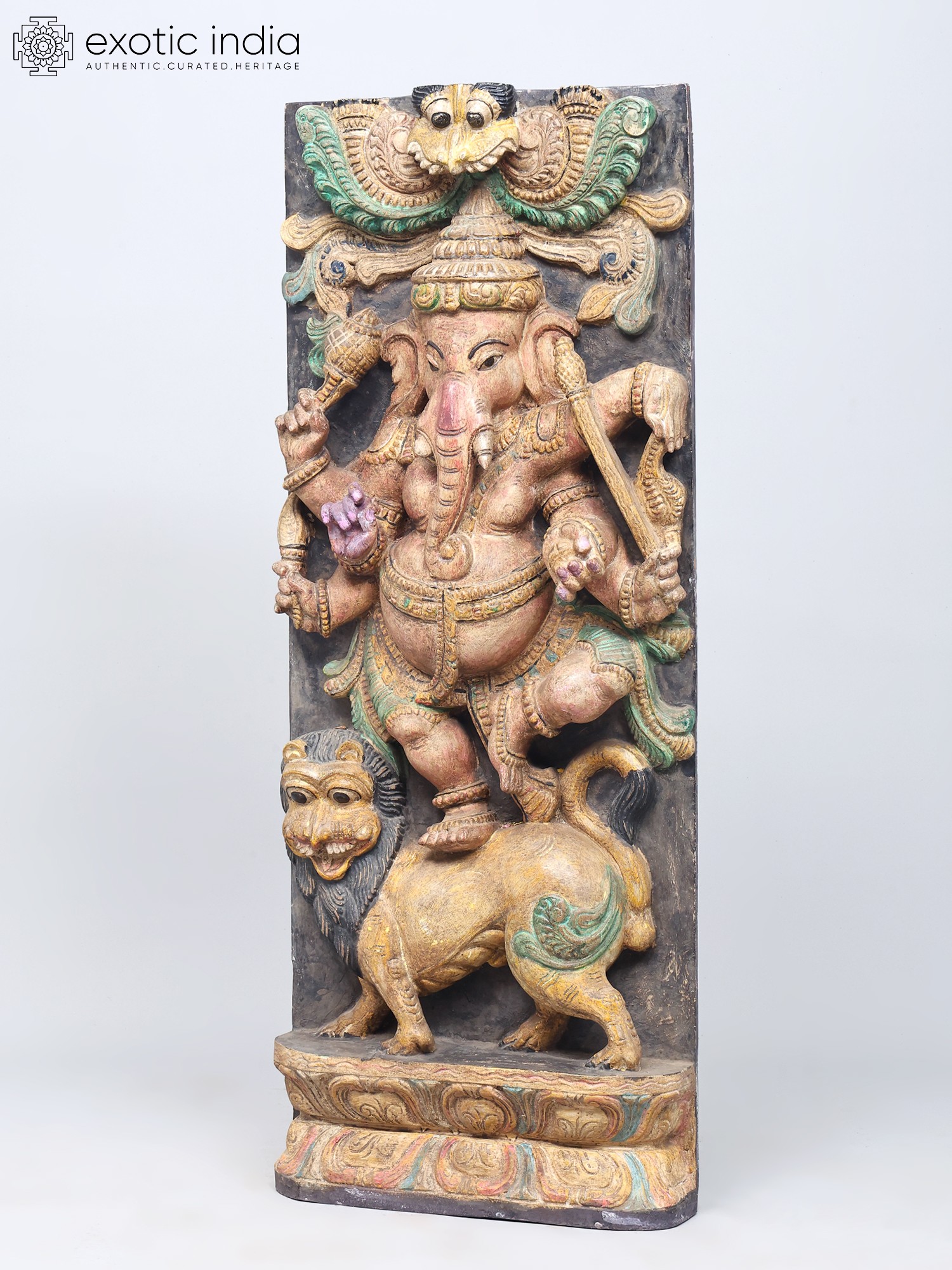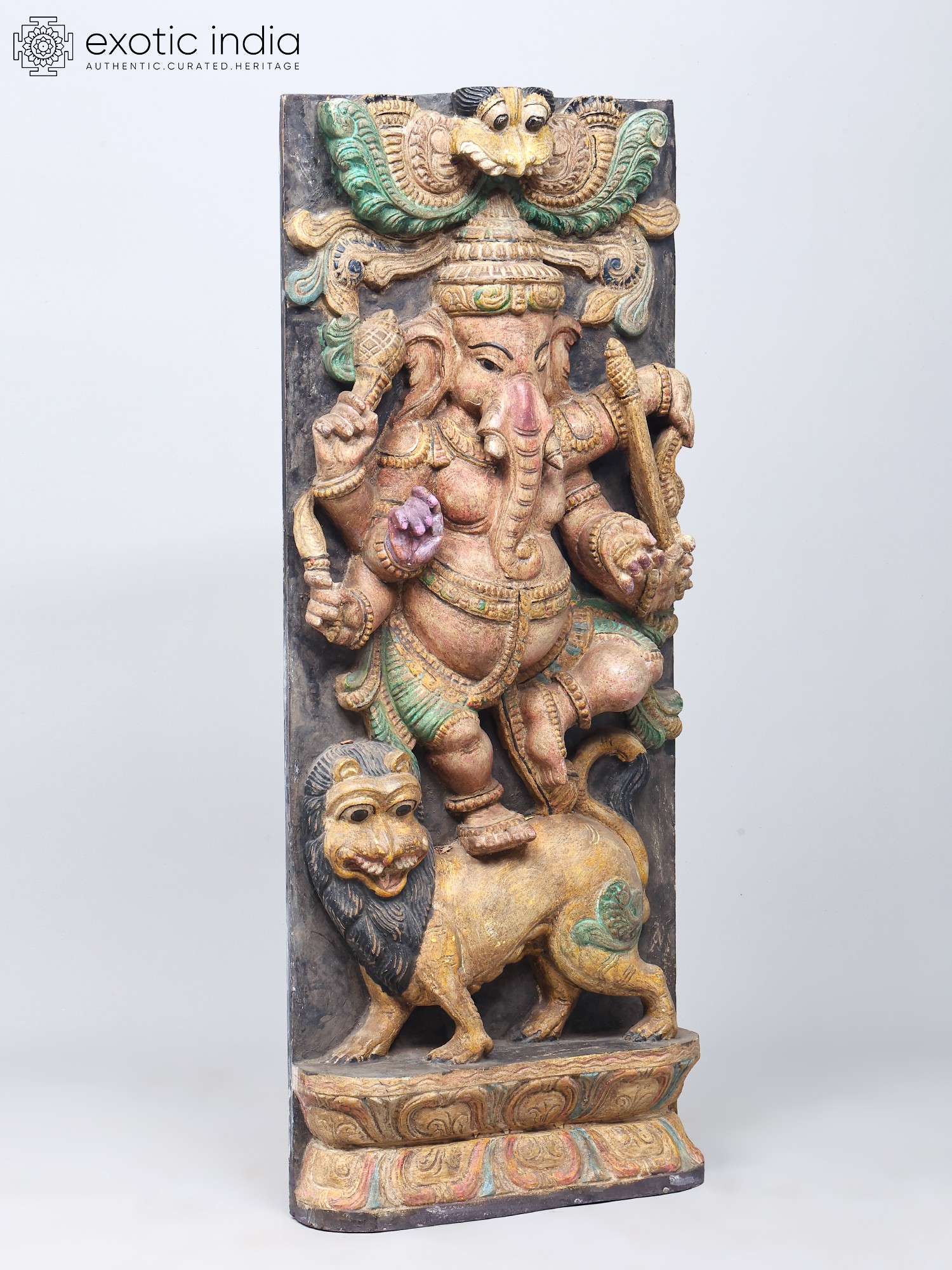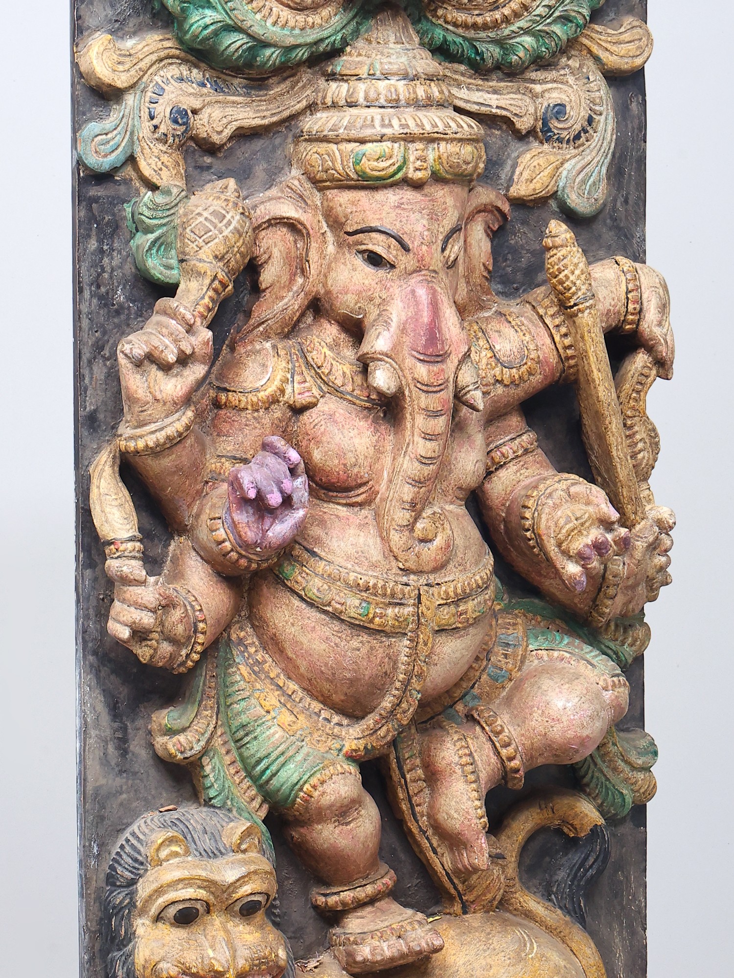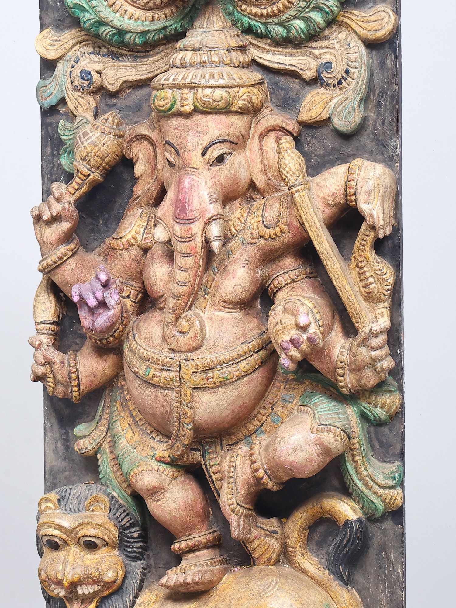 A traditional-style wood-carved composition. Imbued with pale pastels that breathe life and detail into the theme. A solid charcoal-coloure background and a Kirtimukham motif at the zenith of the panel. Handsome black eyes swimming with life, of Ganesha and the simhavahana as well as the Kirtimukham.