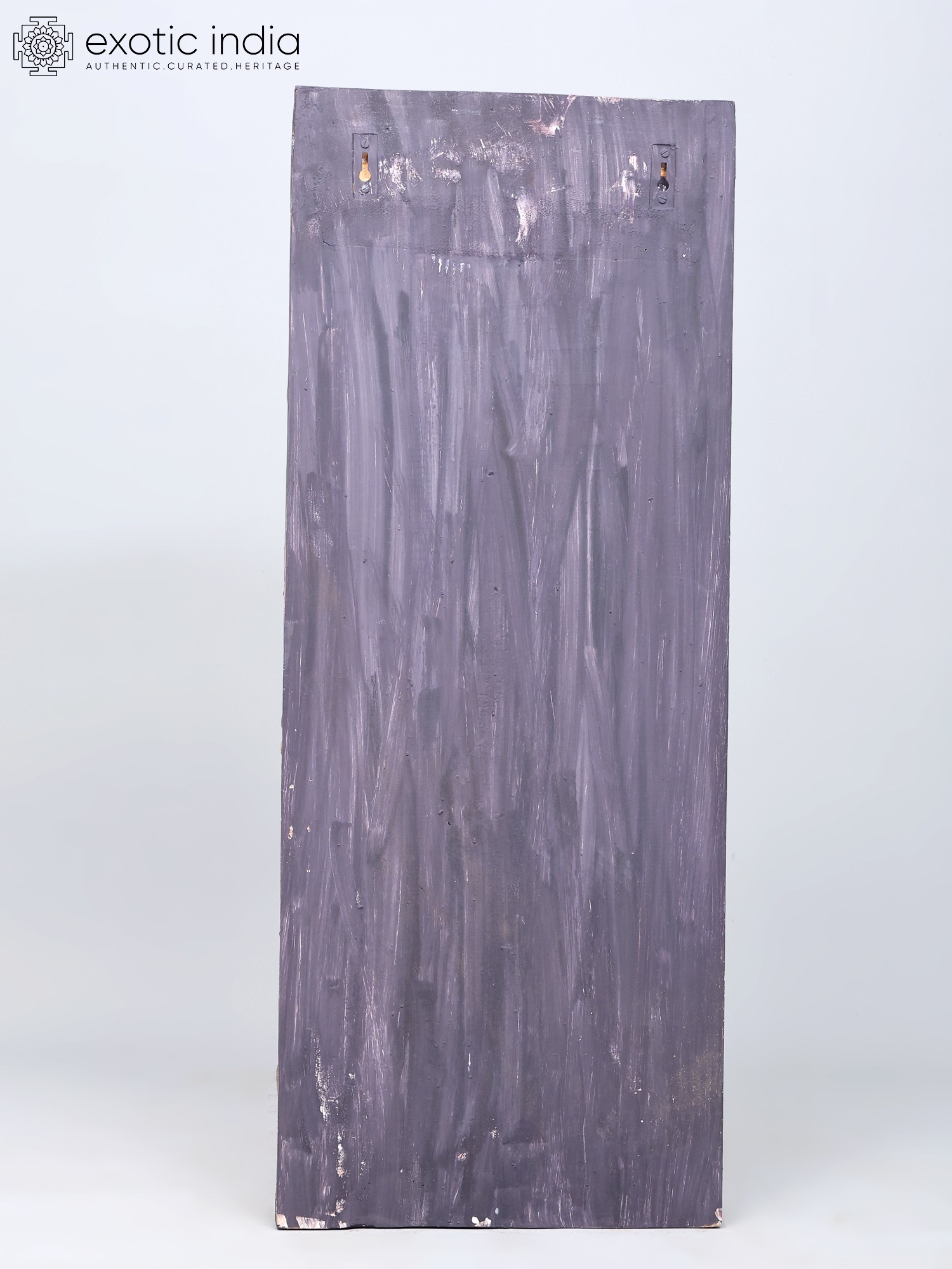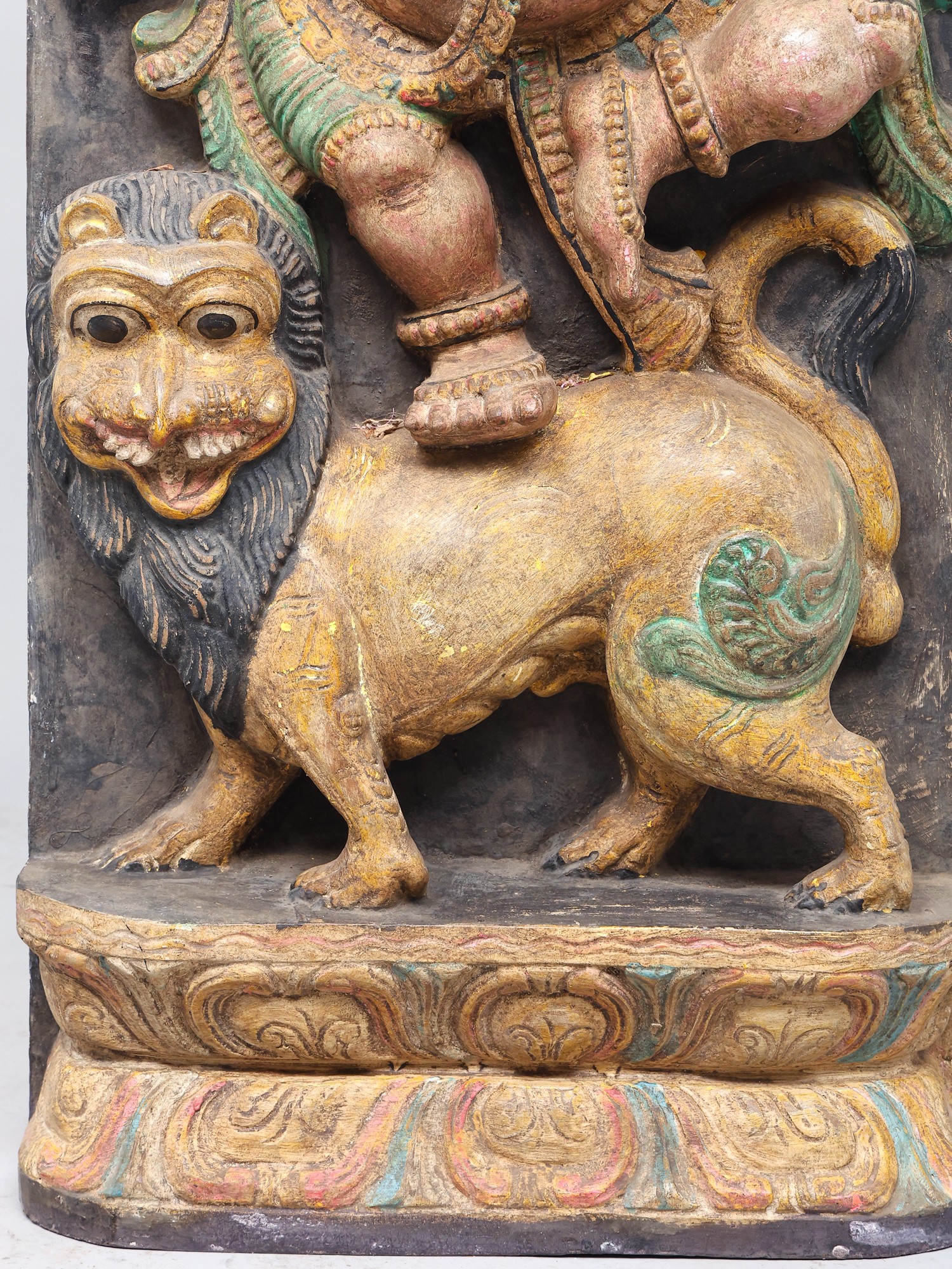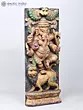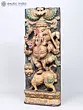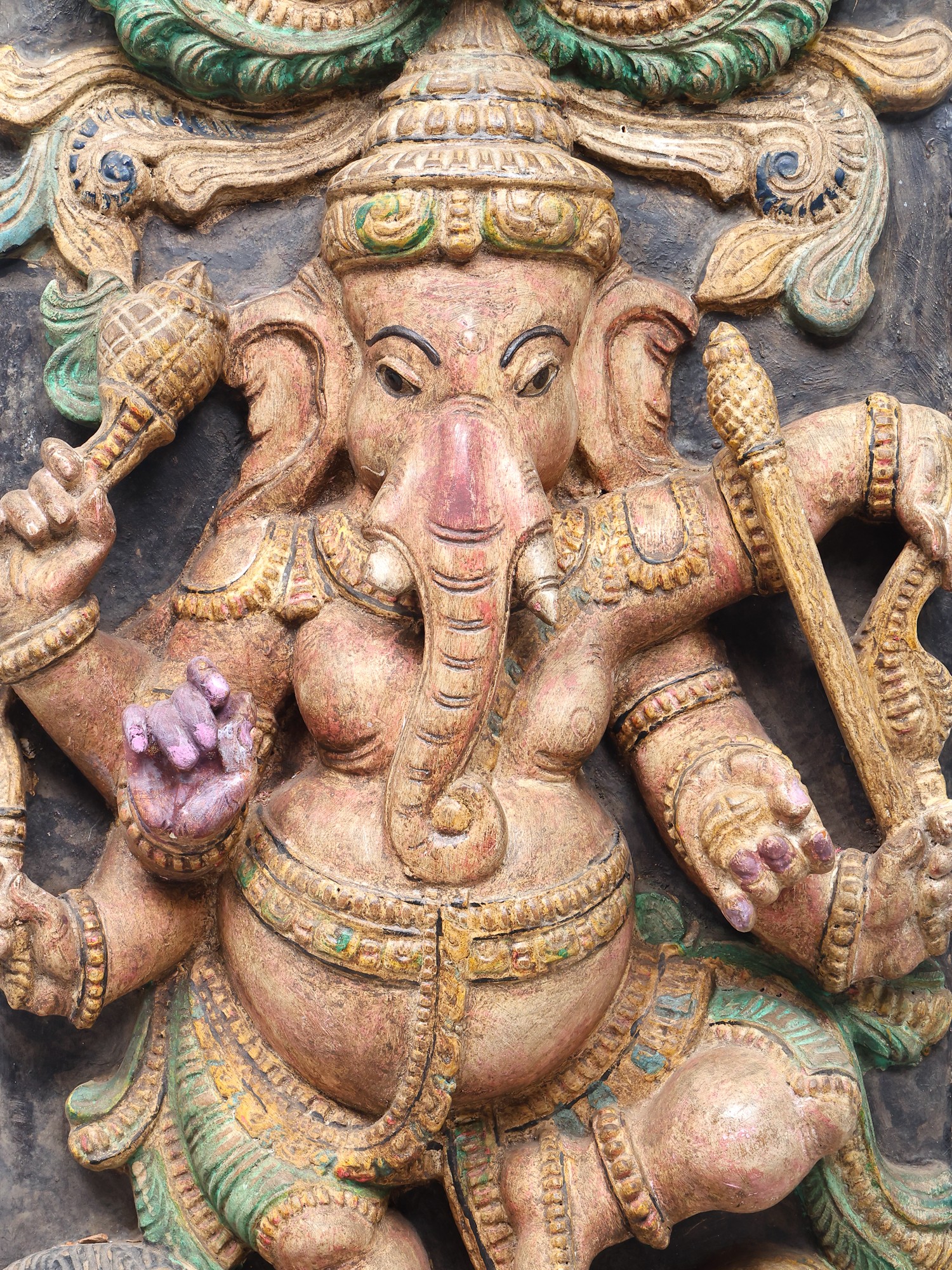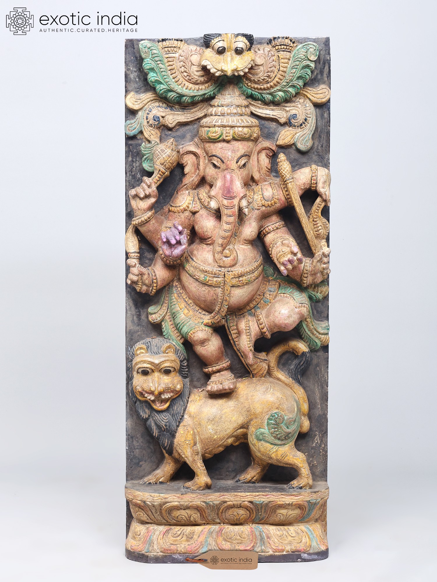 A traditional-style wood-carved composition. Imbued with pale pastels that breathe life and detail into the theme. A solid charcoal-coloure background and a Kirtimukham motif at the zenith of the panel. Handsome black eyes swimming with life, of Ganesha and the simhavahana as well as the Kirtimukham.