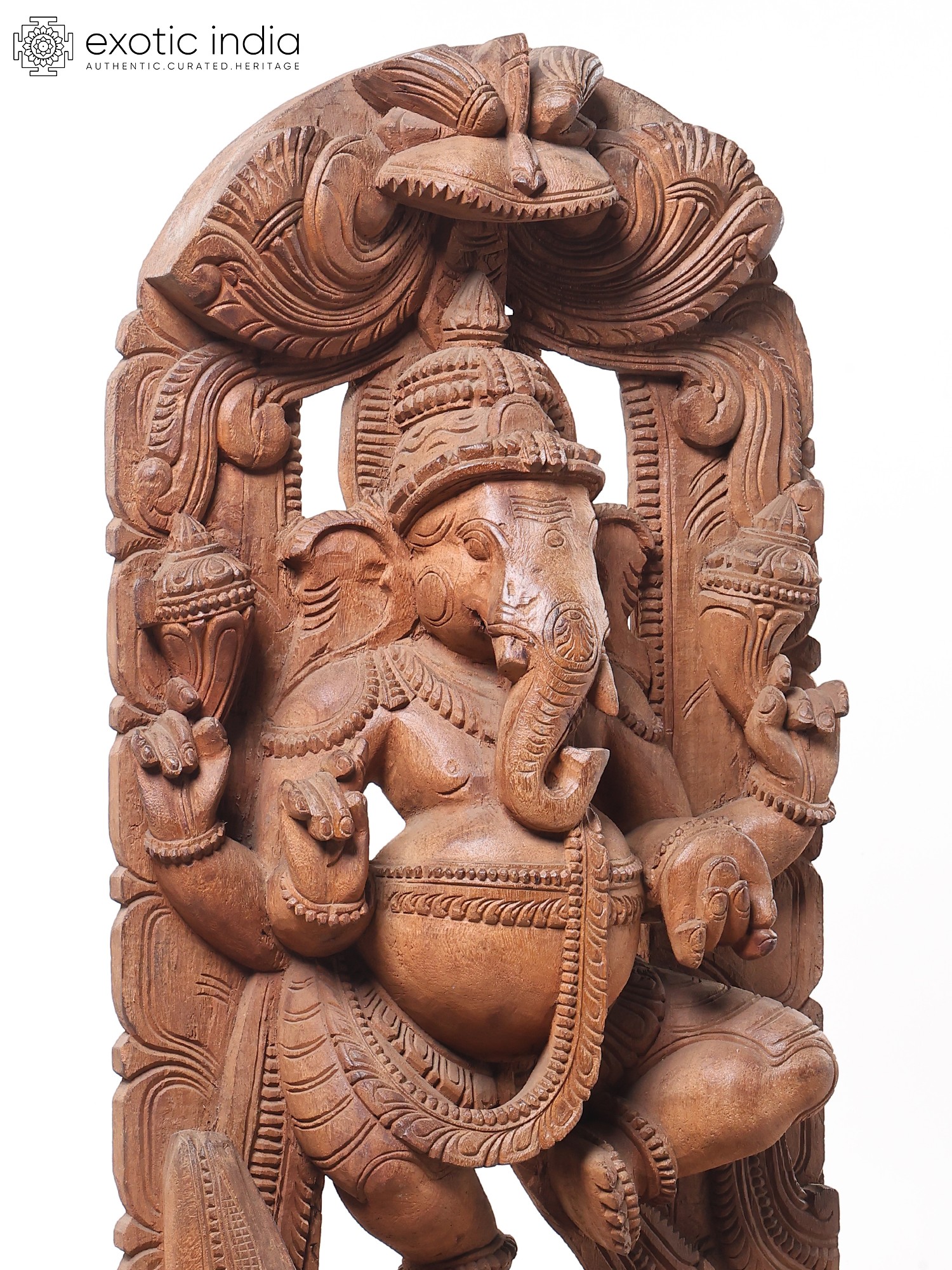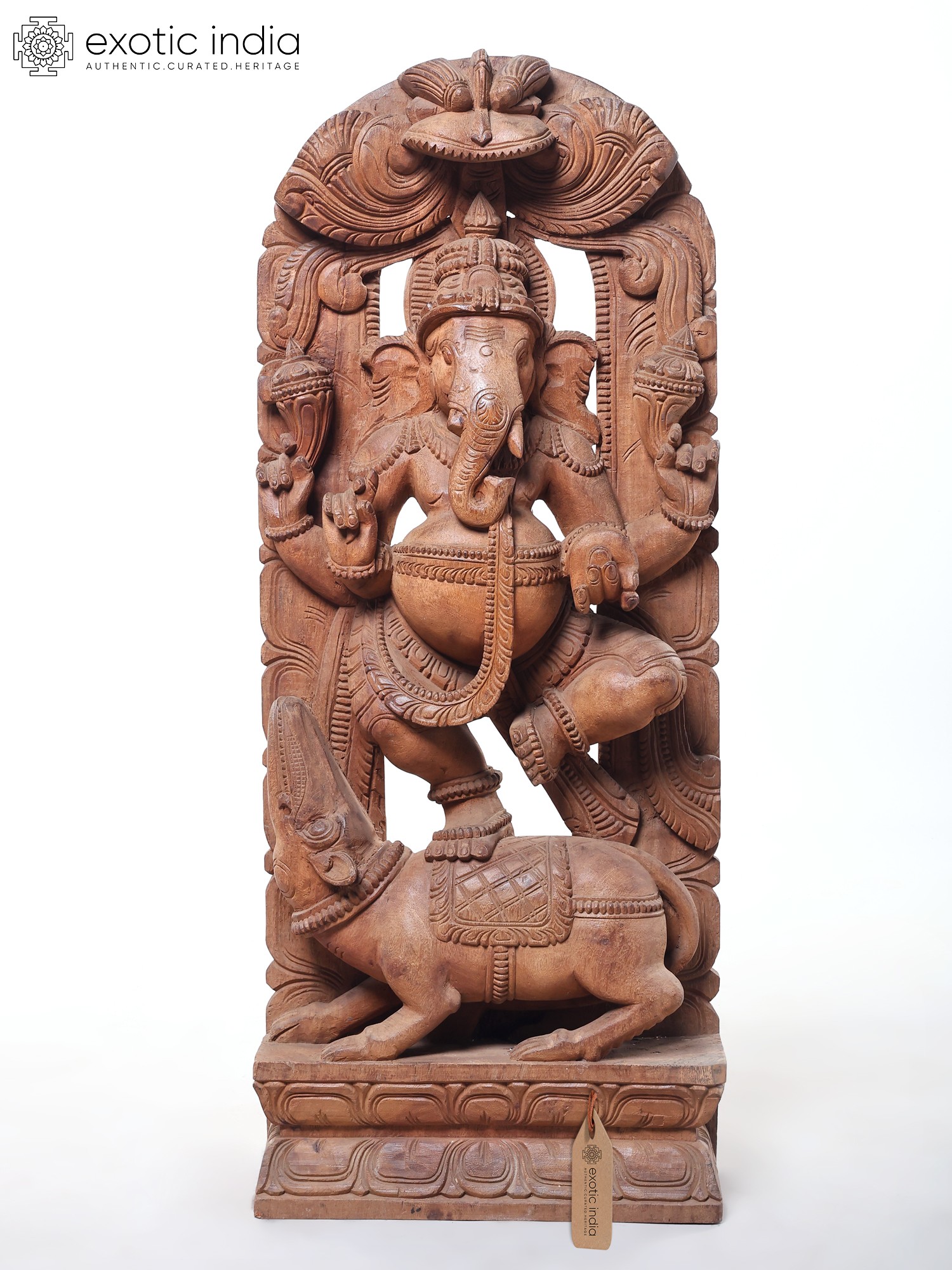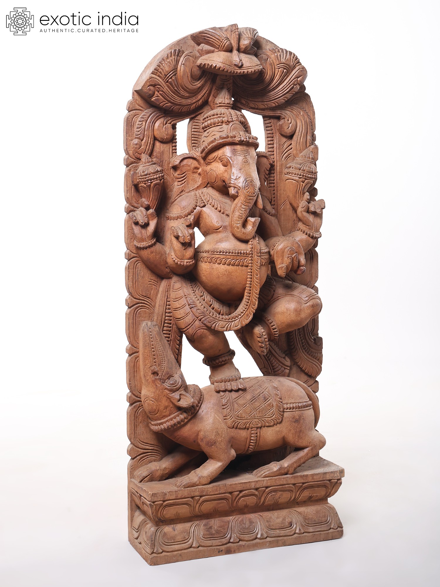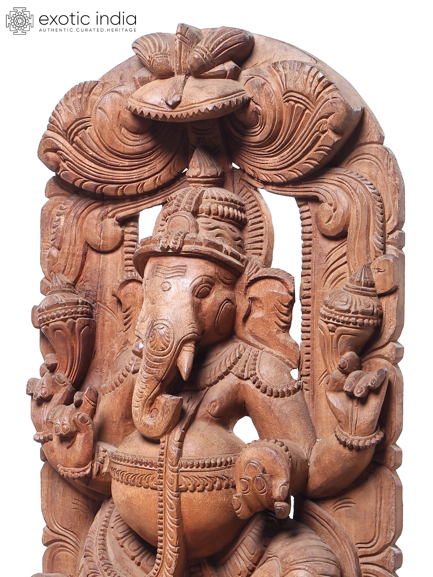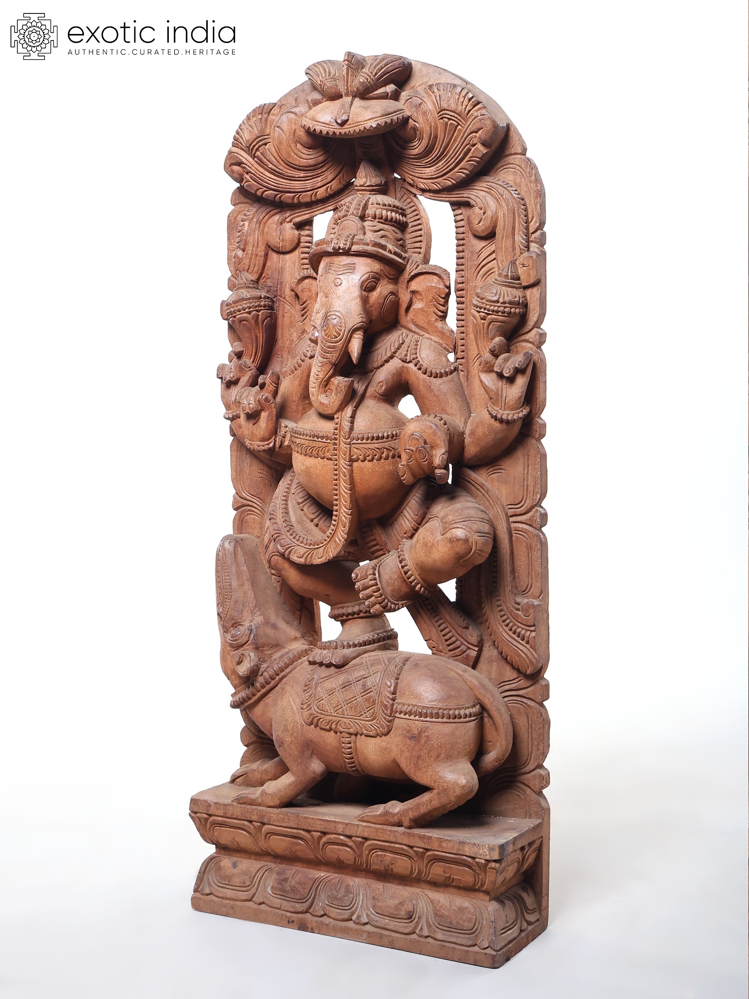 This grand sculpture is not merely an object of worship but a breathtaking work of art. The natural grain and texture of the wood lend a warm and inviting aura to the piece, while the expert carving brings out every nuance of Ganesha's form and his divine mount. The detailed rendering of his trunk, his multiple arms, and the delicate adornments showcases the sculptor's profound understanding of form and proportion. The arched wooden backdrop, intricately carved with motifs that enhance the divine presence, frames the central figures beautifully. This piece is a significant addition for collectors of Indian art, devotees seeking a powerful representation of the divine, or anyone who appreciates the beauty of handcrafted wooden sculptures. It serves as a constant reminder of the joy, wisdom, and auspiciousness that Lord Ganesha bestows upon his followers.