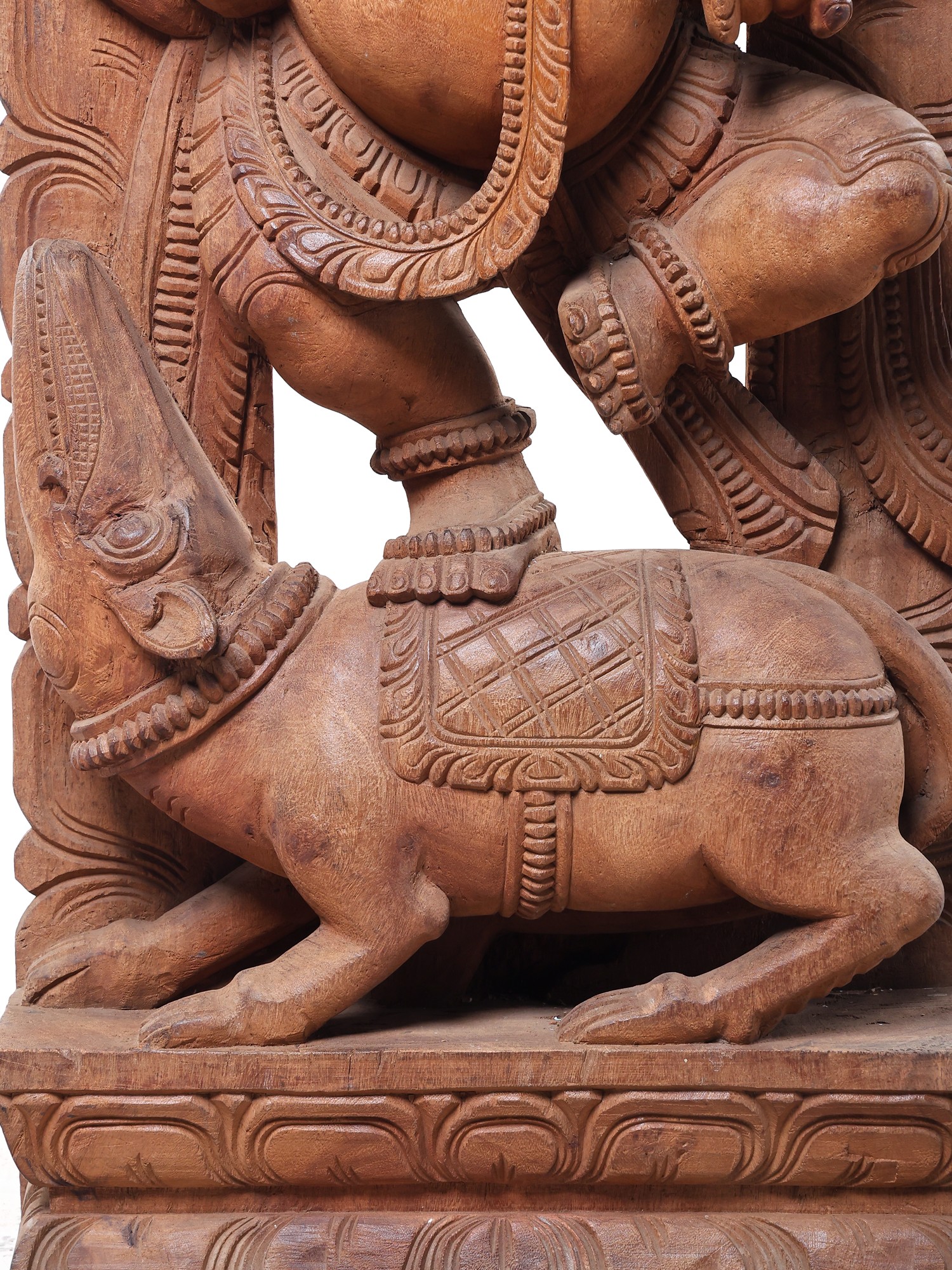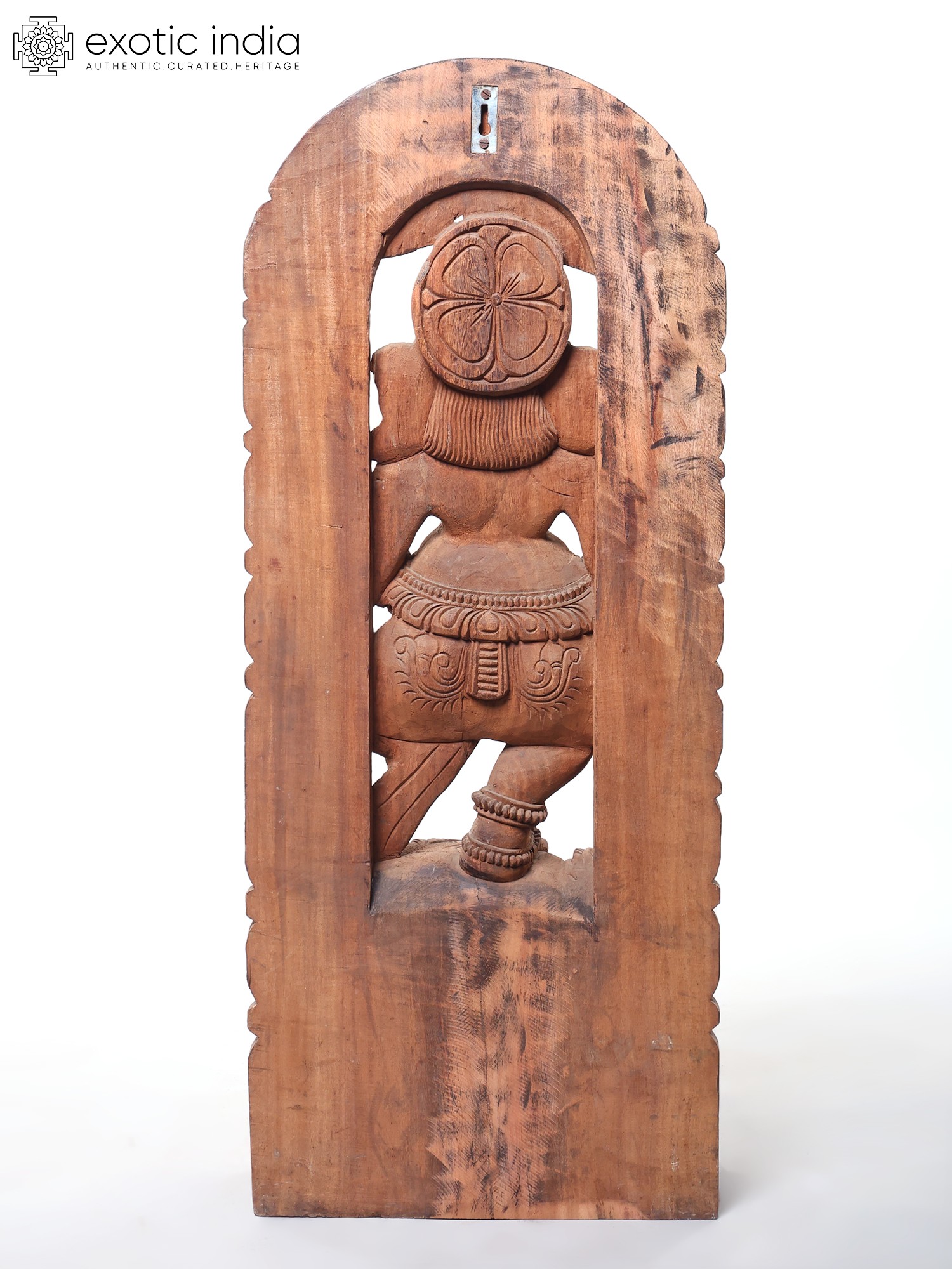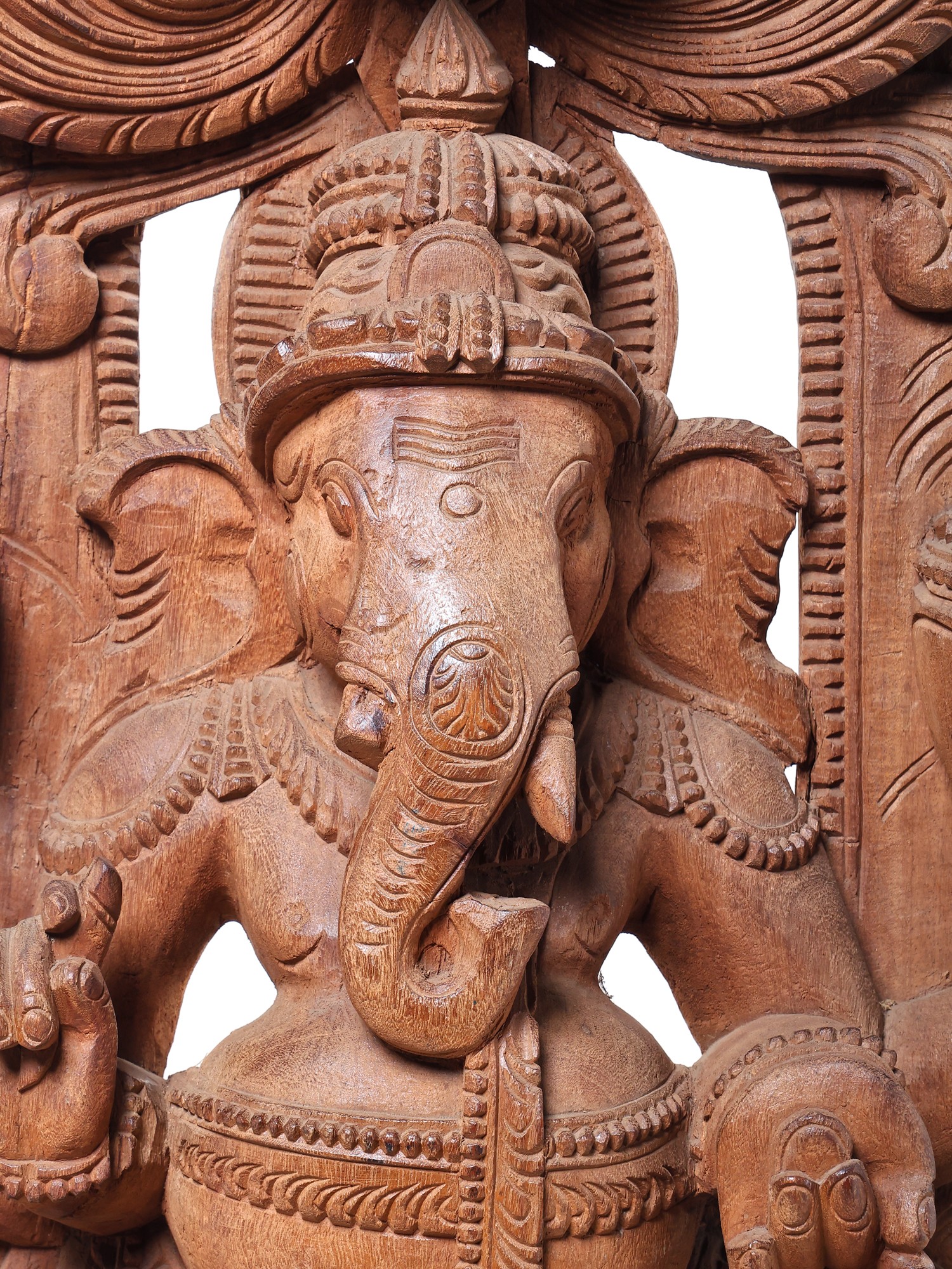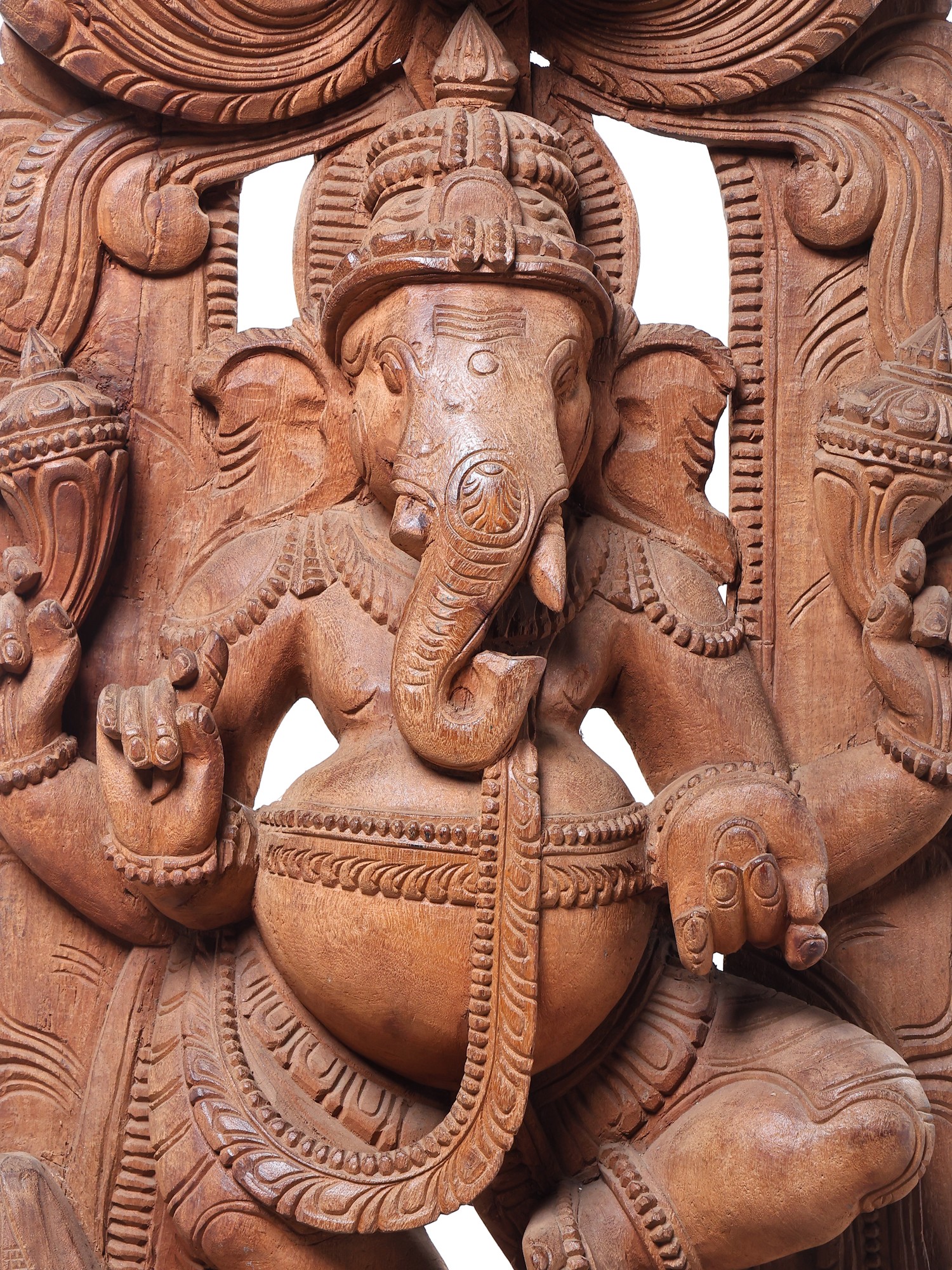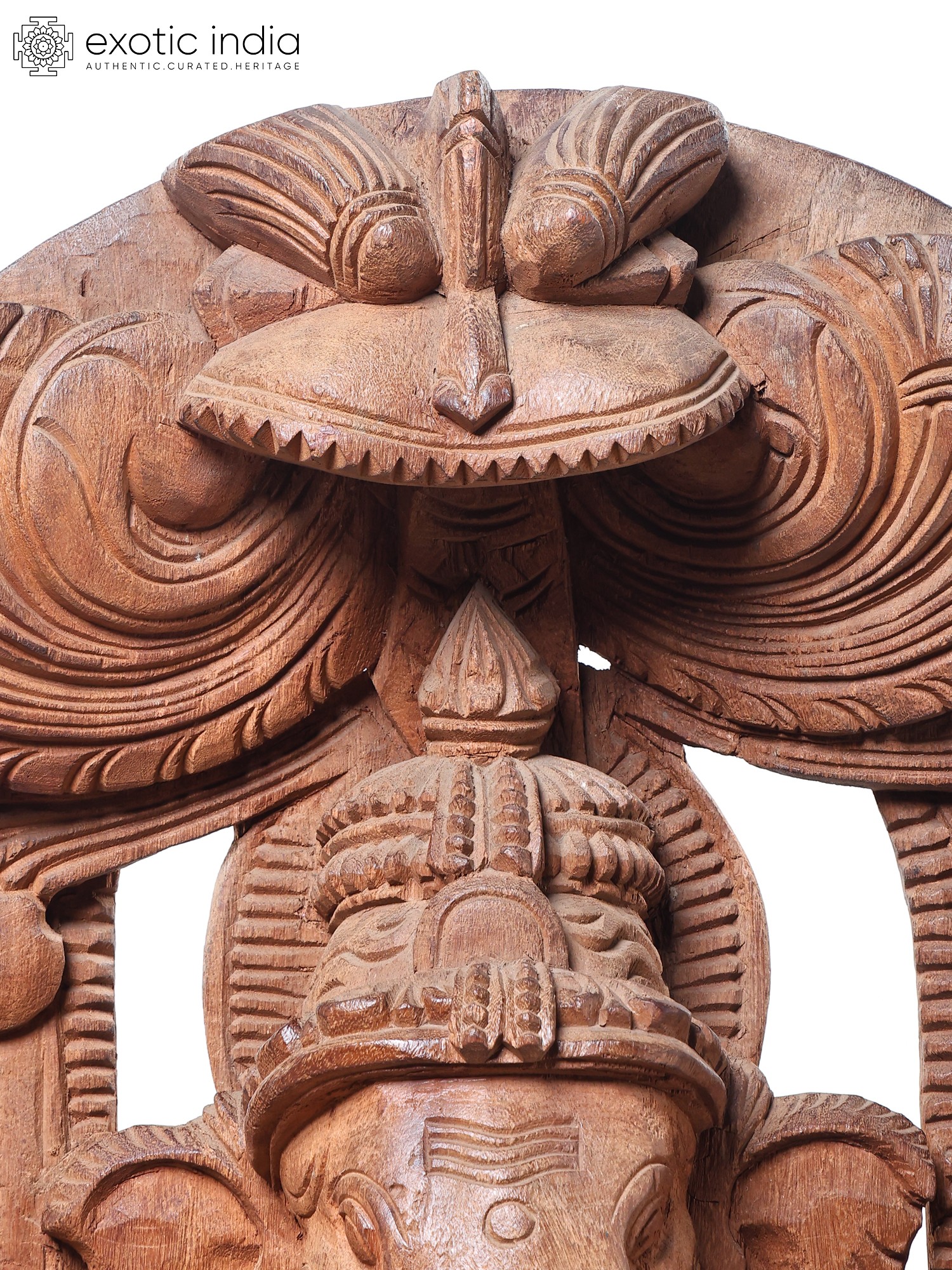 This grand sculpture is not merely an object of worship but a breathtaking work of art. The natural grain and texture of the wood lend a warm and inviting aura to the piece, while the expert carving brings out every nuance of Ganesha's form and his divine mount. The detailed rendering of his trunk, his multiple arms, and the delicate adornments showcases the sculptor's profound understanding of form and proportion. The arched wooden backdrop, intricately carved with motifs that enhance the divine presence, frames the central figures beautifully. This piece is a significant addition for collectors of Indian art, devotees seeking a powerful representation of the divine, or anyone who appreciates the beauty of handcrafted wooden sculptures. It serves as a constant reminder of the joy, wisdom, and auspiciousness that Lord Ganesha bestows upon his followers.
