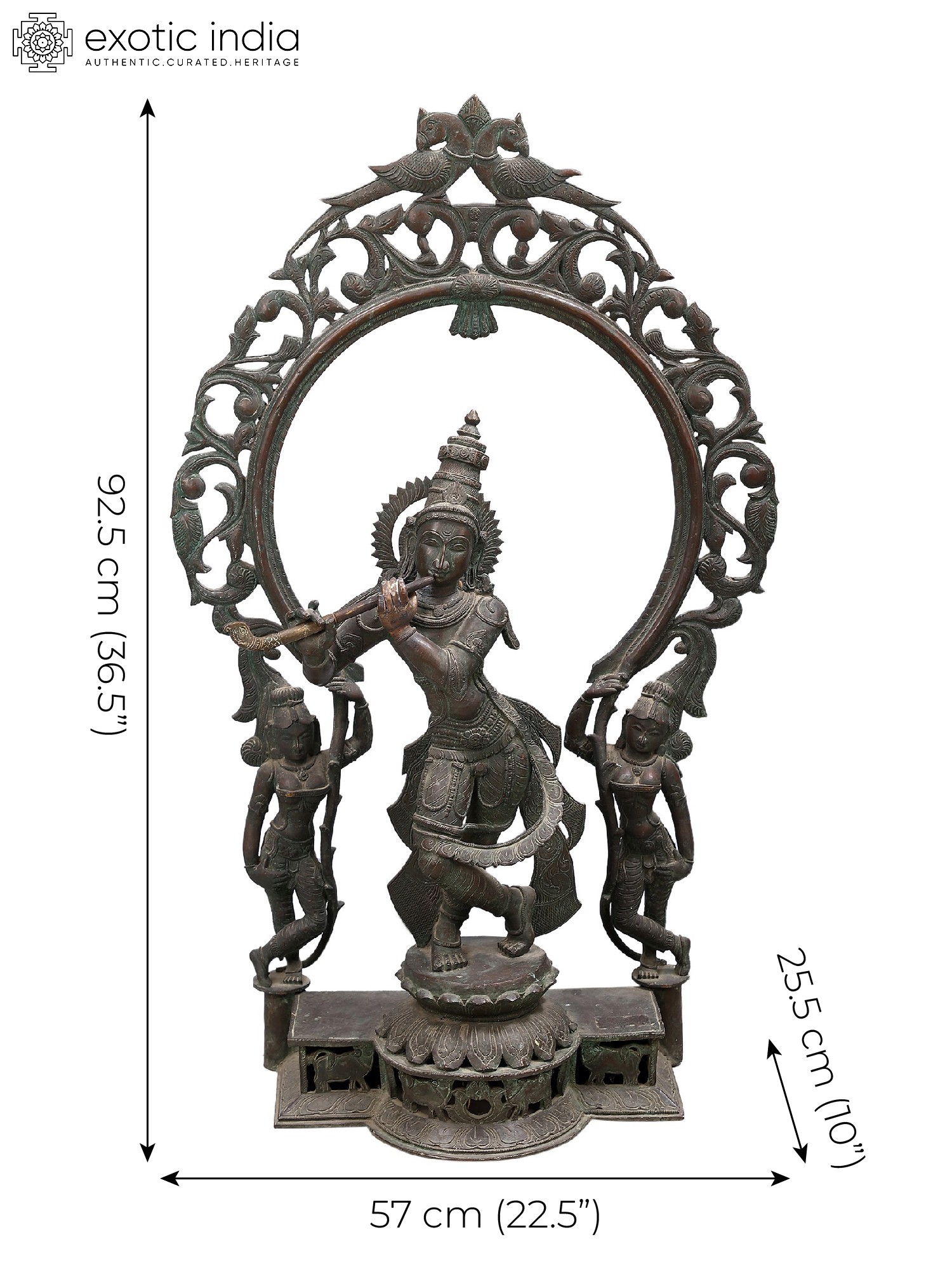 This magnificent Sri Krishna bronze statue is placed on a two-tiered platform, with the lower section decorated with a Gau (cow) motif and the upper pedestal designed in the shape of an upturned lotus. Sri Krishna stands with his flute in his characteristic Tribhanga (triple bent) posture that brings out the grace of his form perfectly.