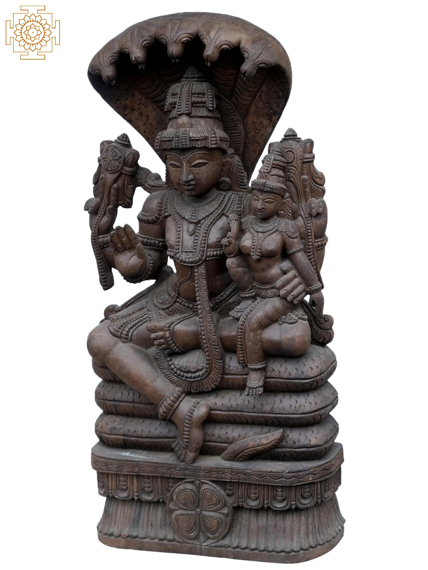 Lord Vishnu, adorned with regal splendor, sits gracefully alongside Goddess Lakshmi on the divine shehnai throne. With serene countenances, they embody eternal love, harmony, and prosperity. Vishnu, the preserver of the universe, radiates a sense of cosmic balance and tranquility, while Lakshmi, the goddess of wealth and prosperity, exudes abundance and grace. Together, they symbolize the essence of divine union and divine blessings, offering solace and guidance to all devotees. This sacred depiction and reverence, inspire spiritual upliftment and enlightenment.