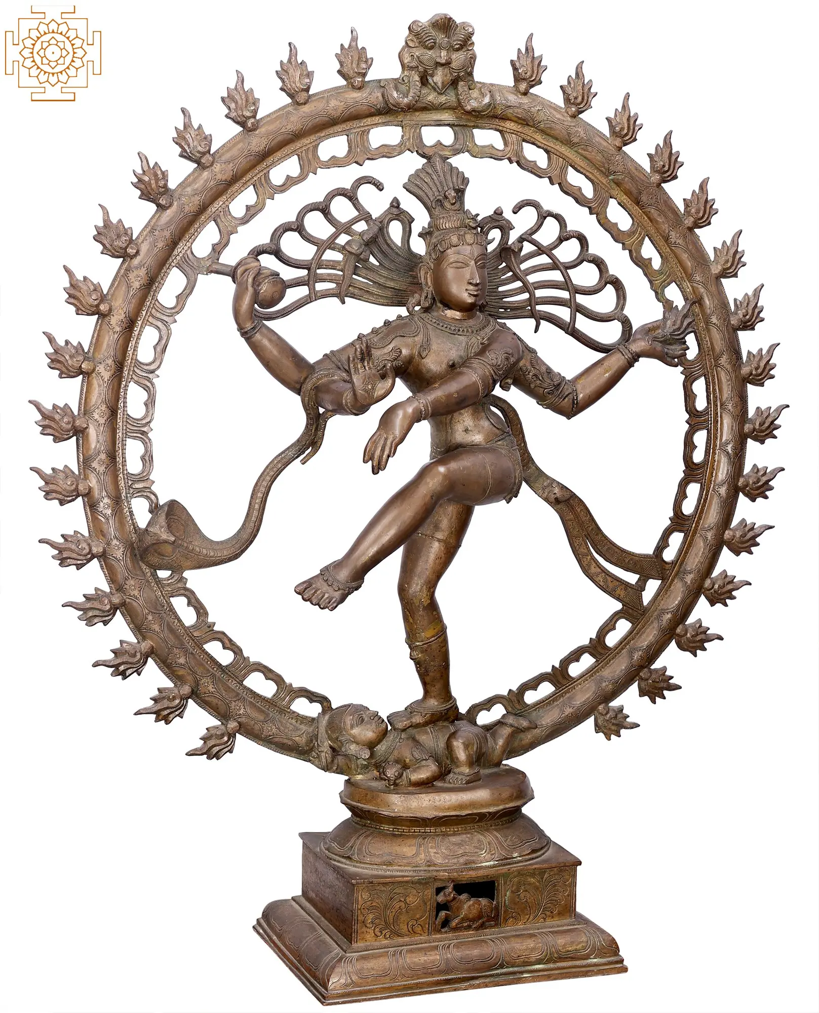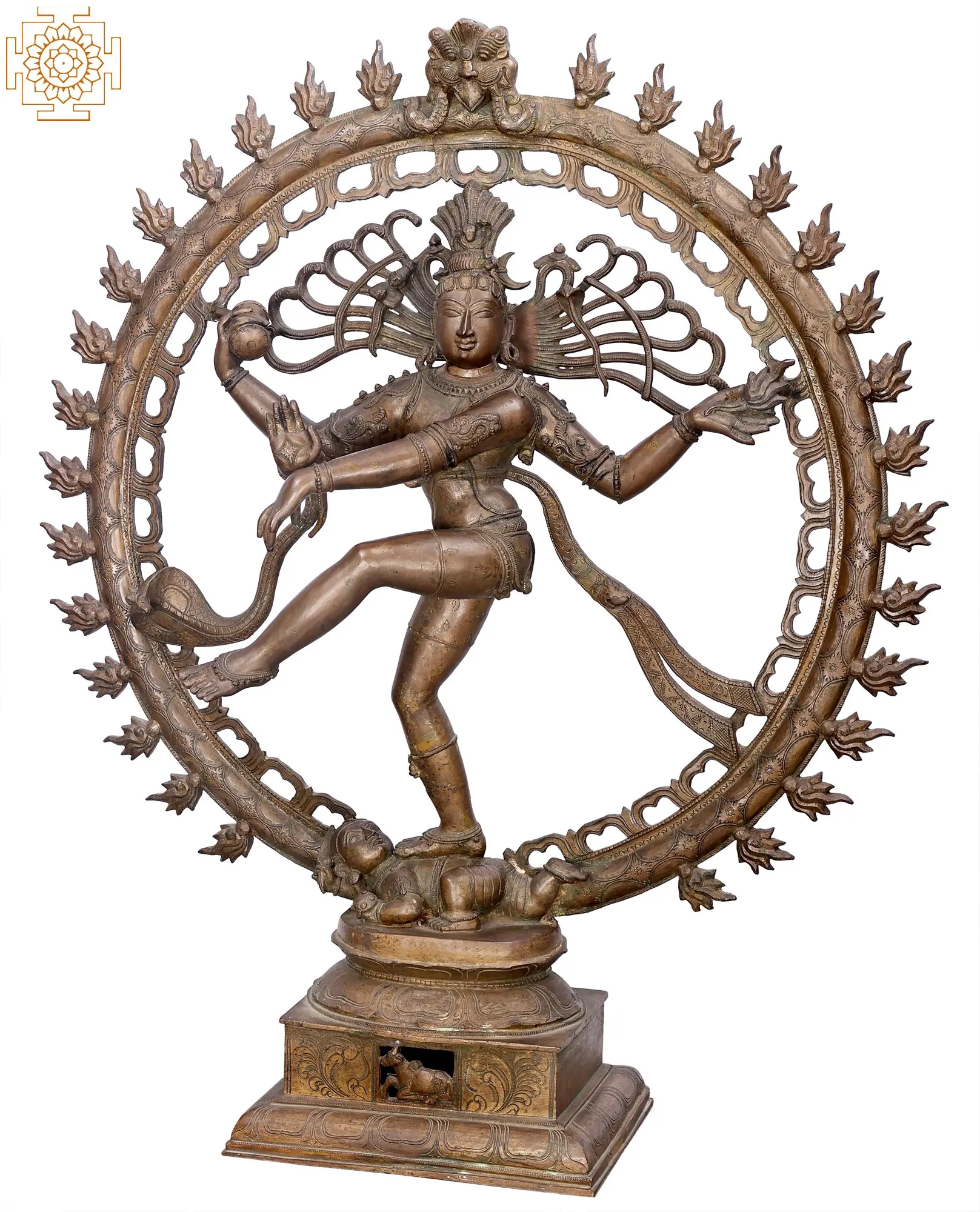 The Madhuchista Vidhana method, a time-honored lost-wax casting technique, breathes life into this formidable sculpture. This intricate process involves sculpting the figure in wax, encasing it in clay, and then melting the wax out by heating, creating a hollow mold. Molten bronze is then poured into this cavity, solidifying into the final form. The use of Panchaloha, a five-metal alloy traditionally believed to possess spiritual and medicinal properties, further elevates the significance of this artwork. The artisans of Swamimalai, a village renowned for its generations of bronze casters, bring centuries of tradition and spiritual devotion to each creation, ensuring that this Nataraja is not merely an object of art, but a conduit of divine energy and profound philosophical meaning. This imposing 36-inch masterpiece is a powerful representation of cosmic balance and divine power, ready to grace any sacred space or discerning collection.