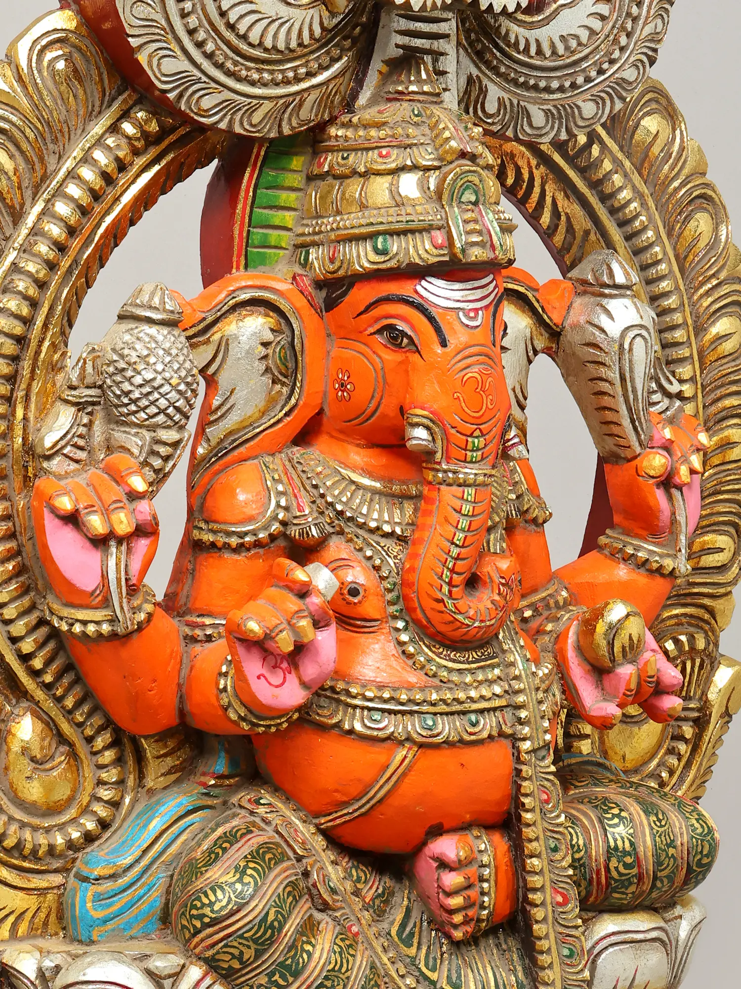 36" Large Sindoori Lord Ganesha Seated on Kirtimukha Throne | Wood Carving