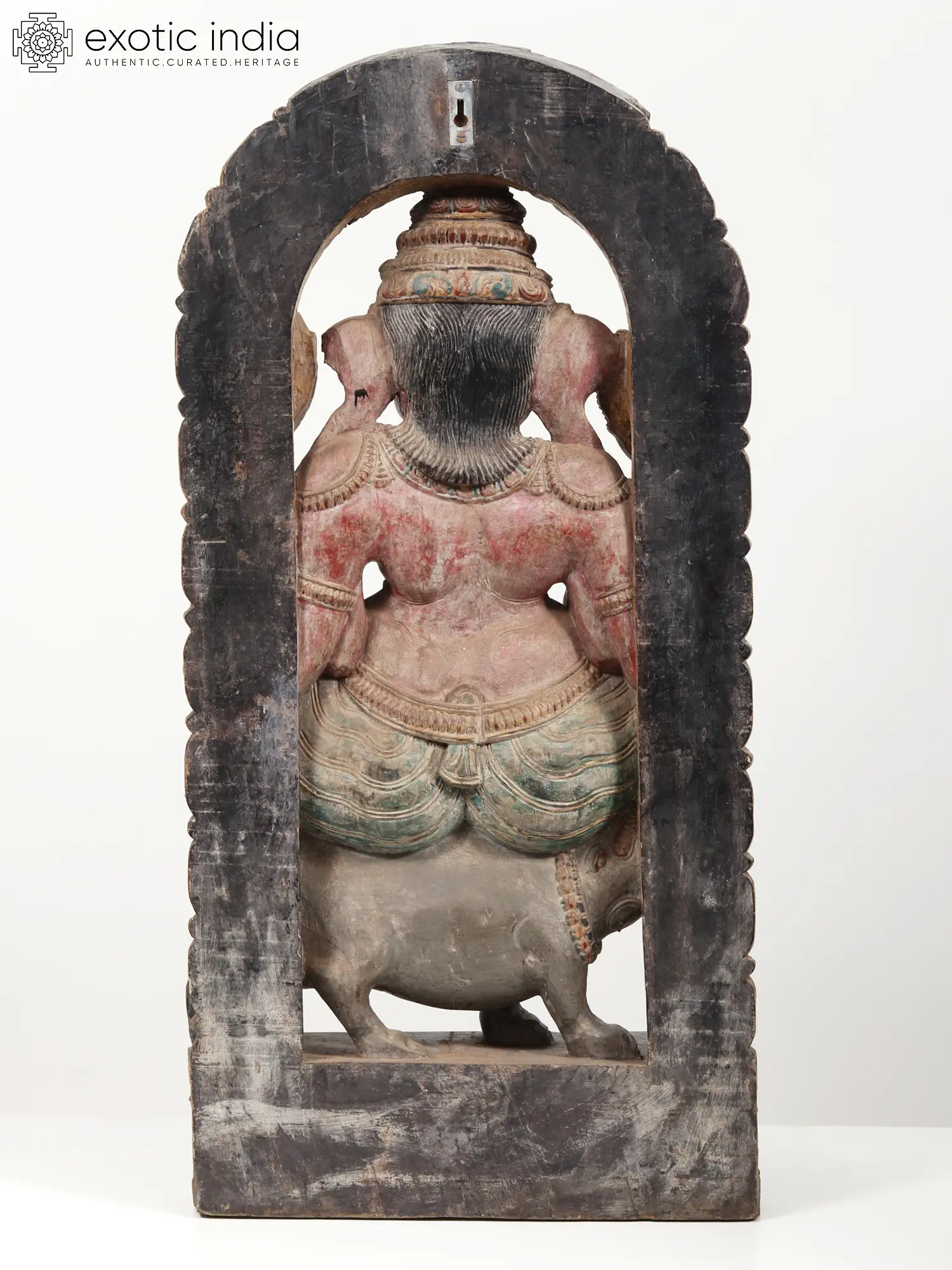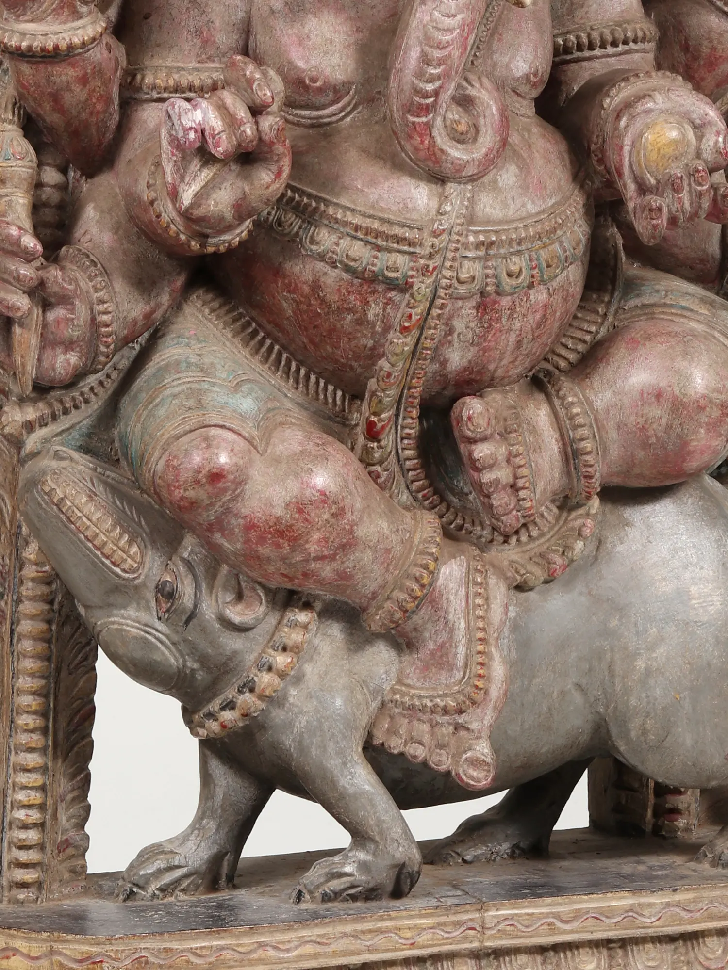 Enthroned within the celestial embrace of the Kirtimukha (The Face of Glory), Lord Ganesha reigns as the benevolent harbinger of wisdom and remover of obstacles, seated gracefully upon his divine mount, Mushaka. Clad in regal vestments, his divine form adorned with a Kireedam Mukut and ornate jewels, Ganesha, the bestower of eternal bliss, embodies cosmic grace. Worshipping this ethereal manifestation grants seekers, the boon of transcending impediments, unlocking intellectual prowess, and invoking divine blessings. Symbolising the convergence of intellect and spirituality, Ganesha's divine essence signifies the path to enlightenment through overcoming challenges. As devotees venerate this majestic form, they embark on a sacred journey towards wisdom, prosperity, and the harmonious balance of cosmic energies in their lives.