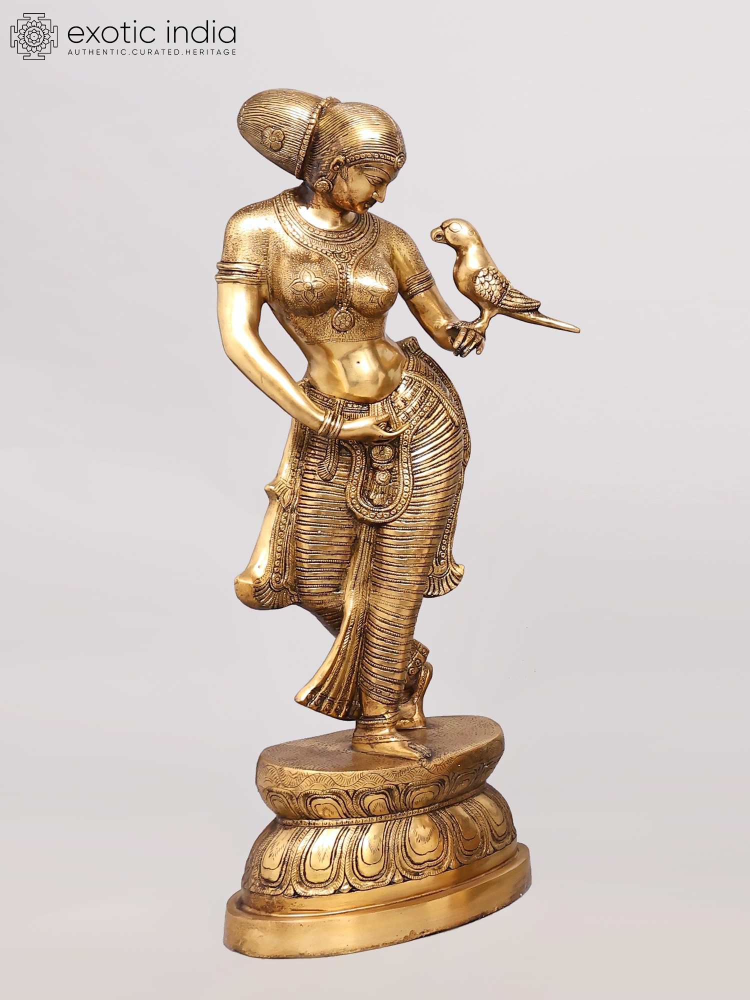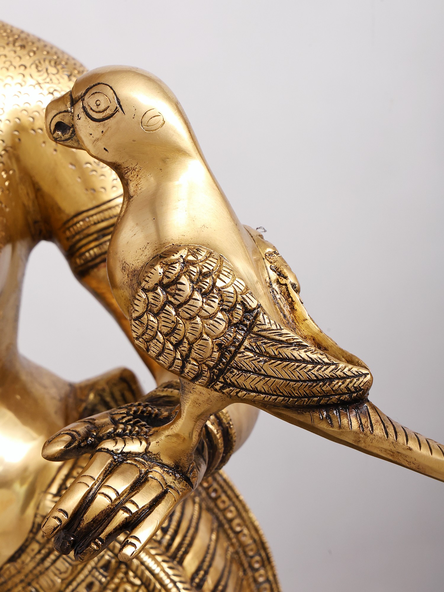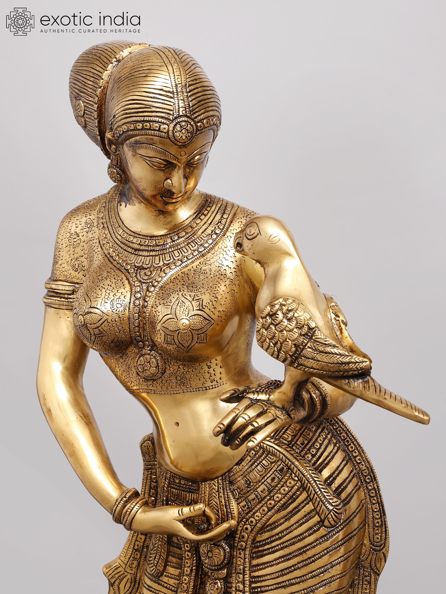 Brilliantly modeled with rhythm infused into every part of the figure, in the bent legs, tilted hips, curved belly, artistically turned face, gesticulated arms, sensuously moved breasts and in its entire demeanour – every twist and gesture, the brass-cast, representing a youthful maiden with the parrot, is a magnificent piece of art, secular, aesthetic and timeless. The parrot, romantically couched on her left arm with its beak close to her breasts, seems to be a bit confused as to whether what it has before it are some magic mounds emerged on its mistress’s body, or a pair of its most loved fruit, pomegranates – same modeling, gold-like lustre, transparence and toughness, disabling it from determining if it should strike them for their juicy seeds or just look at them and enjoy their beauty.