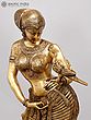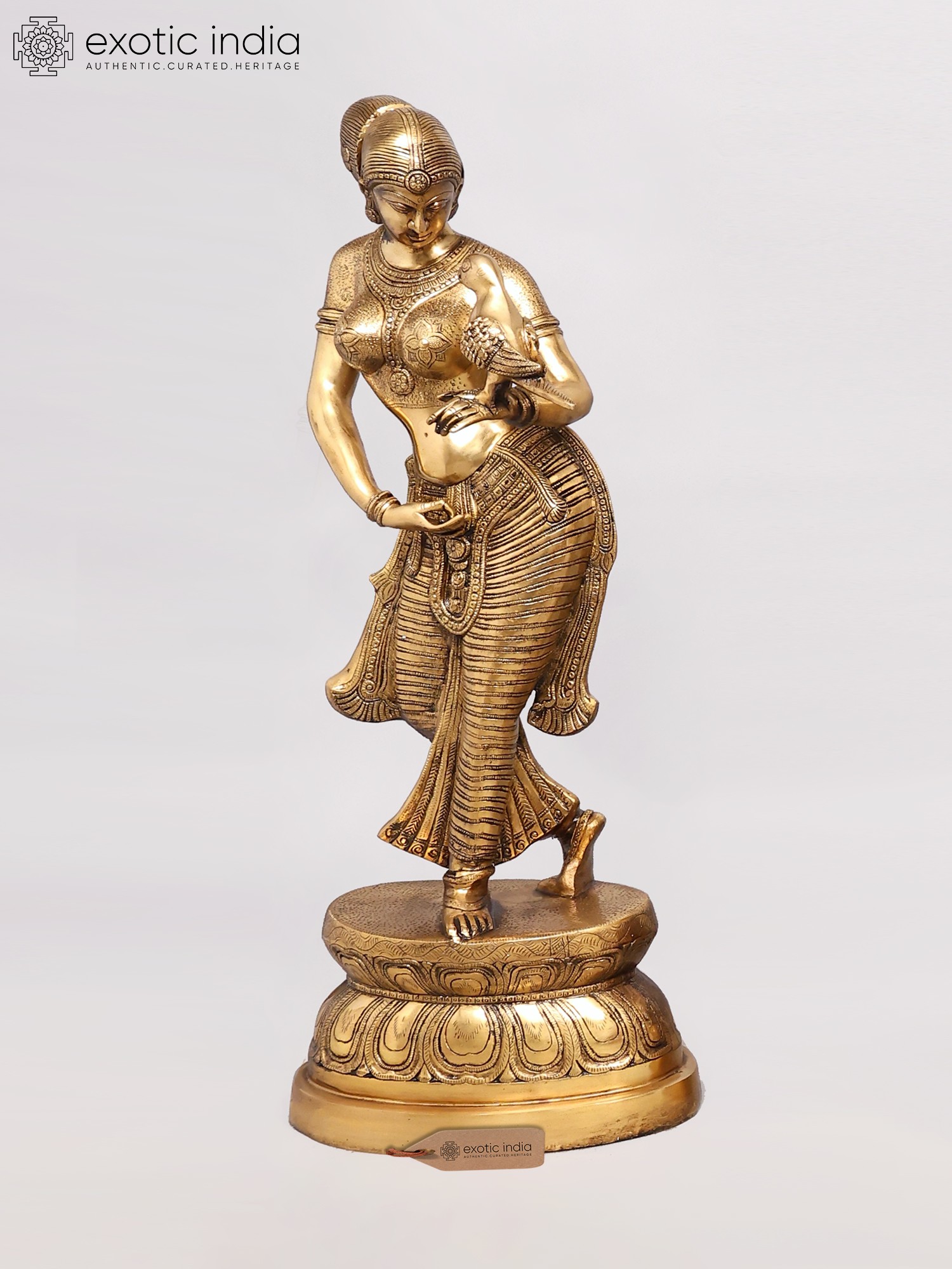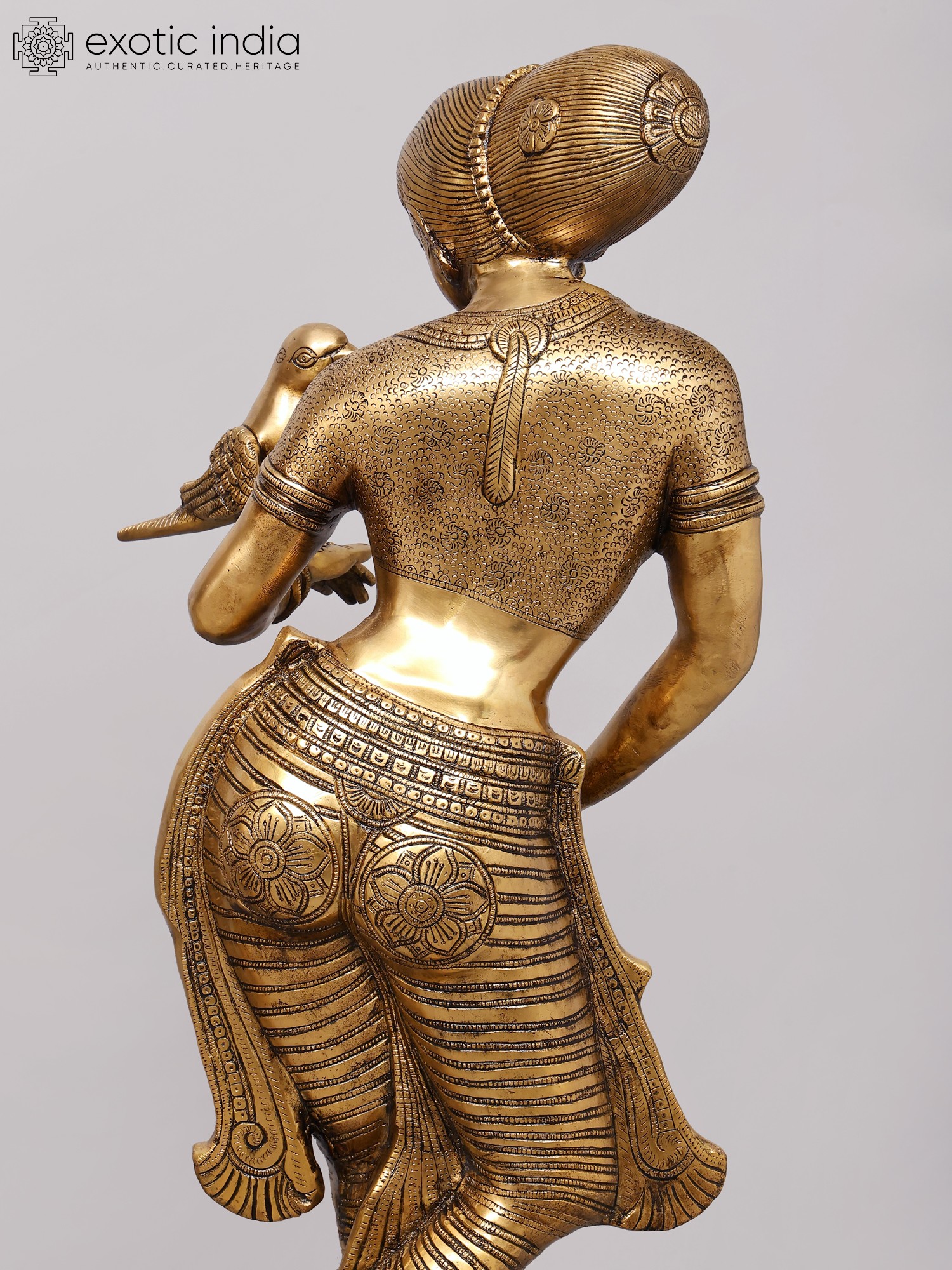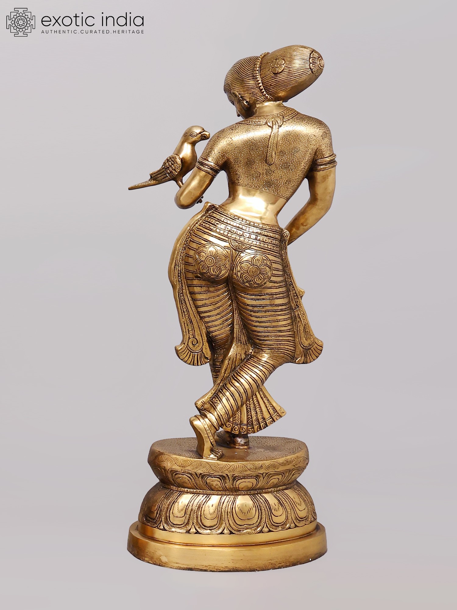 Brilliantly modeled with rhythm infused into every part of the figure, in the bent legs, tilted hips, curved belly, artistically turned face, gesticulated arms, sensuously moved breasts and in its entire demeanour – every twist and gesture, the brass-cast, representing a youthful maiden with the parrot, is a magnificent piece of art, secular, aesthetic and timeless. The parrot, romantically couched on her left arm with its beak close to her breasts, seems to be a bit confused as to whether what it has before it are some magic mounds emerged on its mistress’s body, or a pair of its most loved fruit, pomegranates – same modeling, gold-like lustre, transparence and toughness, disabling it from determining if it should strike them for their juicy seeds or just look at them and enjoy their beauty.