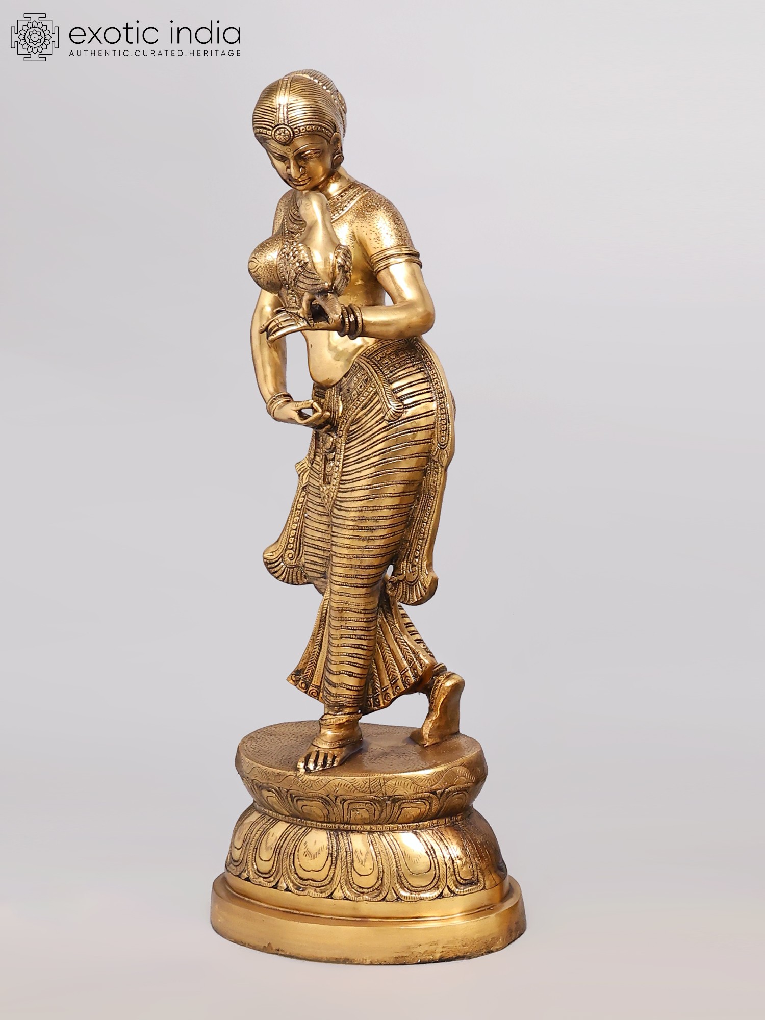 Essentially a piece of art for aesthetic delight it is capable of sublimating by its sheer beauty the minds as also any space, a sitting chamber, commercial or domestic, or a public place appropriate to its size, a corridor in a picture hall, hospital, hotel, mall or departmental store, or a gallery in a museum. The statue inherits this power to aesthetically transform a venue from the long and great tradition of Indian aesthetics that set and refined over long centuries the standard norms of iconography and anatomy for modeling the figure of a youthful maiden, particularly a ‘nayika’, a heroine in love, under the Nayika-bheda cult. It also added subordinate imagery for substantiating some aspects of beauty or for revealing various emotions or emotional situations, parrot being one of them.