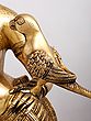 Indian aesthetics have used parrot-imagery more often, literature, sometimes even on par with human characters of a tale. In Indian way of life parrots and pigeons are since ages the most dependable means of communication, though while a pigeon was seen as acting like a postman couriering written material – a love letter or a secret note, a parrot was always a faithful messenger carrying the words, sometimes its own description, of a loving one, a ‘nayika’ or ‘nayaka’, to another. The ‘nayika’ telling her parrot what it has to convey to her love has been a favourite theme of a number of medieval statues and paintings. The parrot imagery has been used equally effectively for portraying a nayika’s physical beauty, especially her breasts, the most effective component of a woman’s beauty. A parrot titillating the nipple of her breast, as represents a sculpture at Khajuraho’s Parshvanatha temple, or greedily looking at them, as in this brass-cast, more effectively portrays her breasts’ modeling, ripened state, toughness, a ripe mango or pomegranate like juicy contents, gold-like skin-colour, lustre, transparence and overall beauty than would do any statement, however powerful.