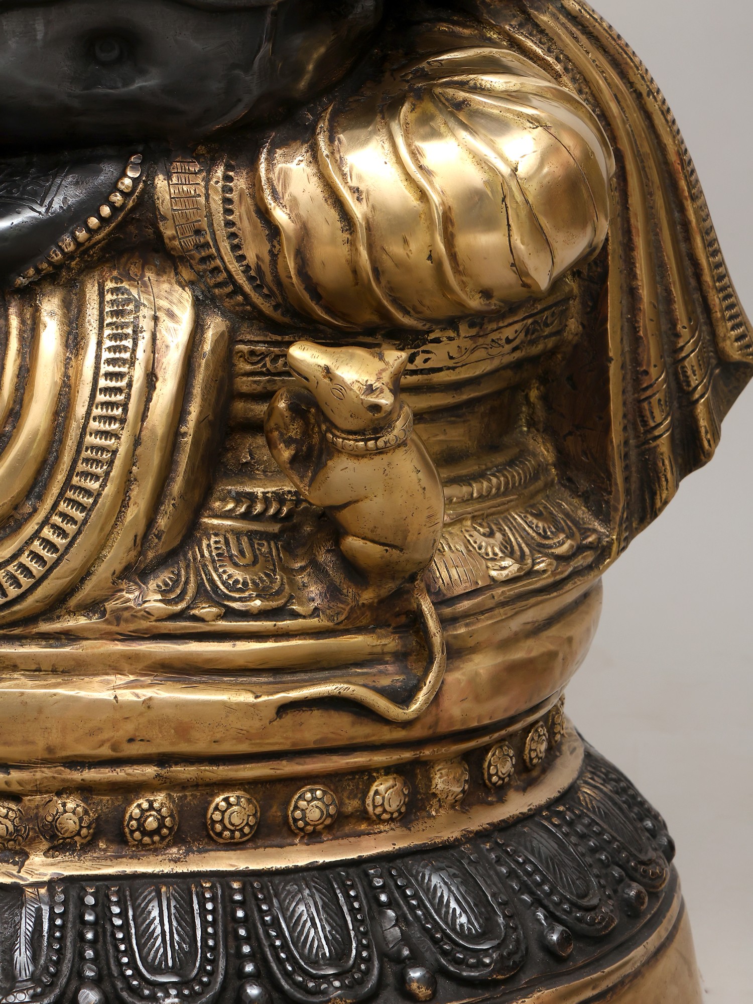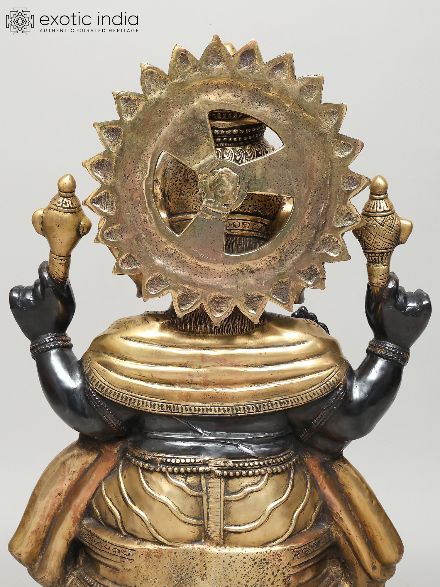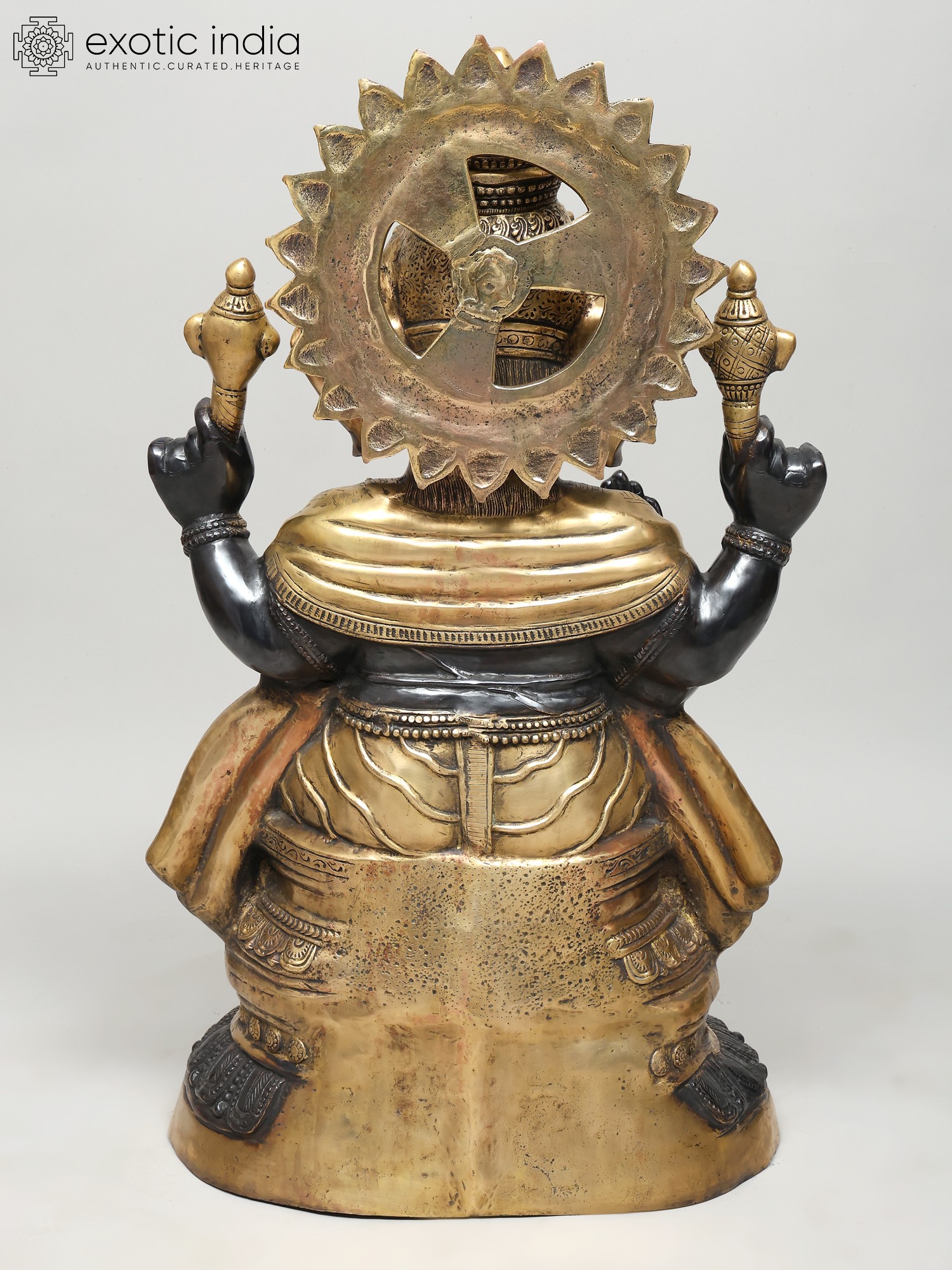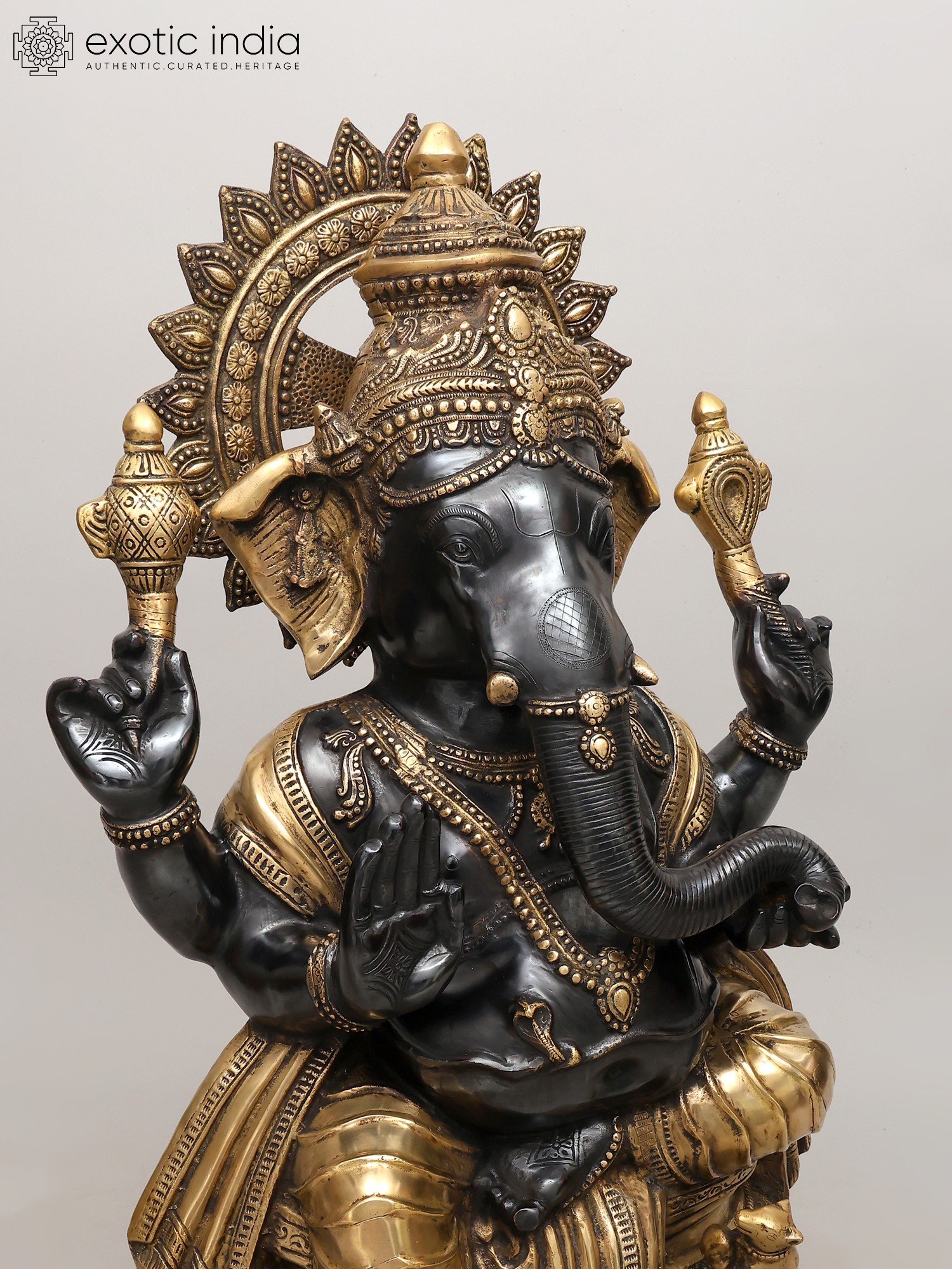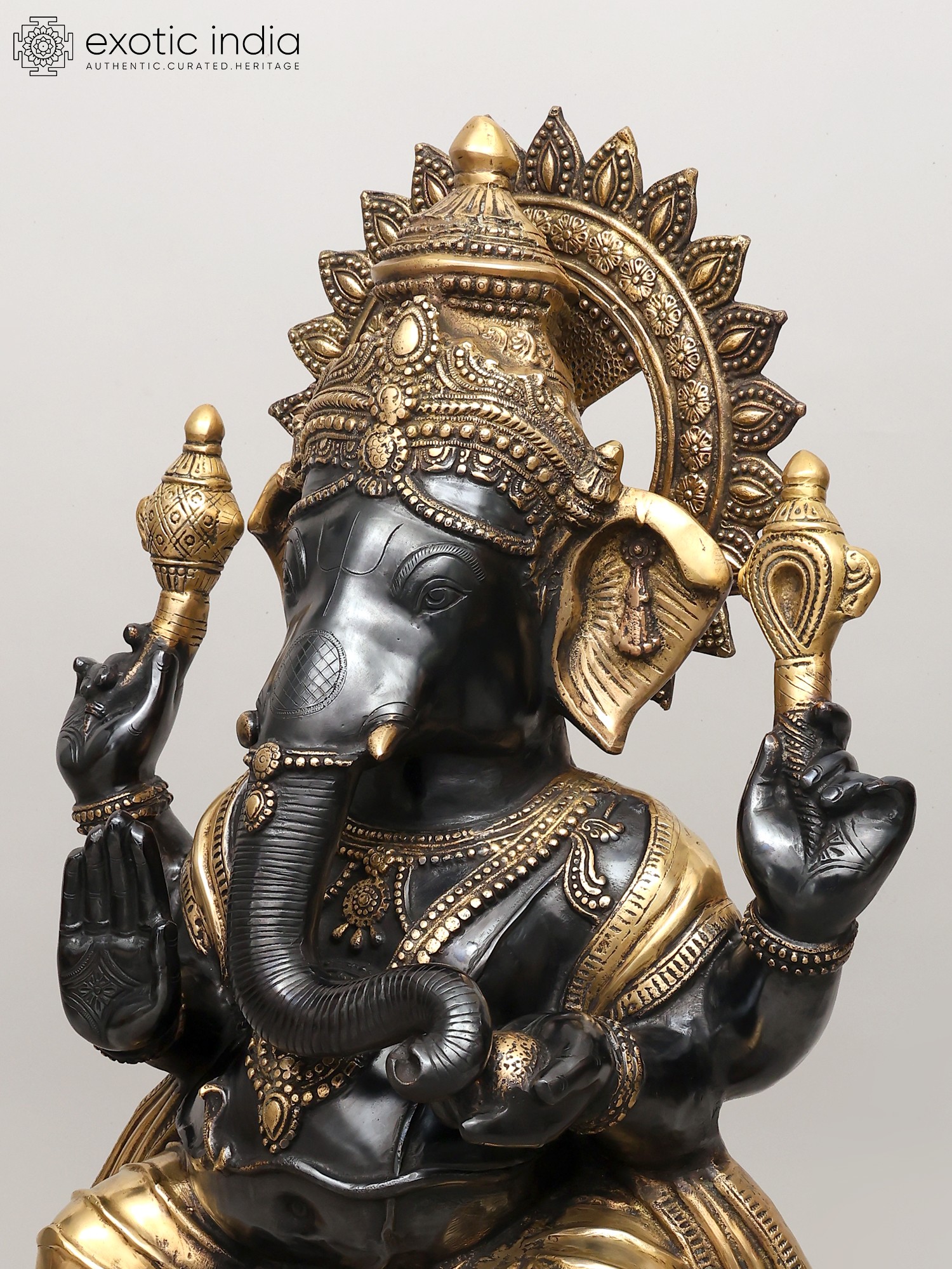 This statue, carved in the finest and the most characteristic details, blends two of the most auspicious manifestations of the iconography of Lord Ganesh, namely, the Varada and the Sankatahara.