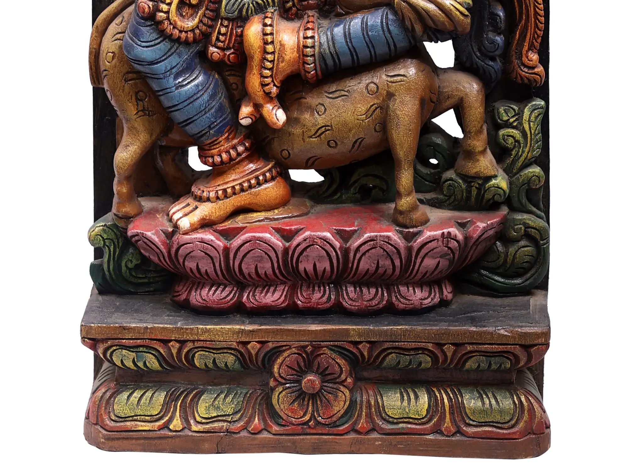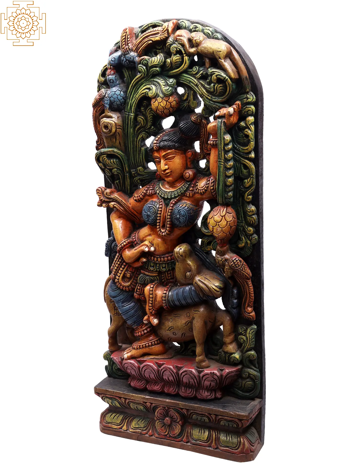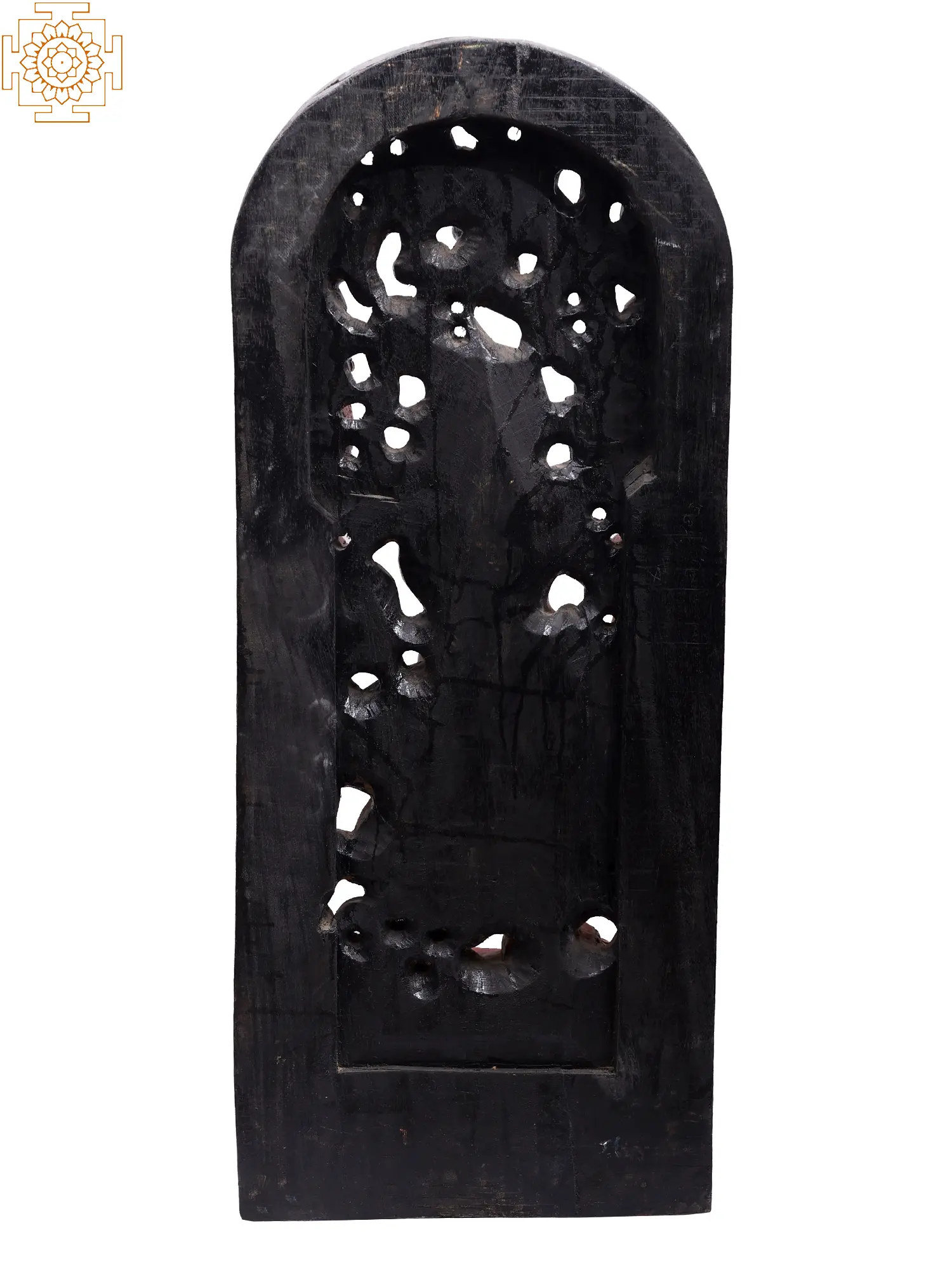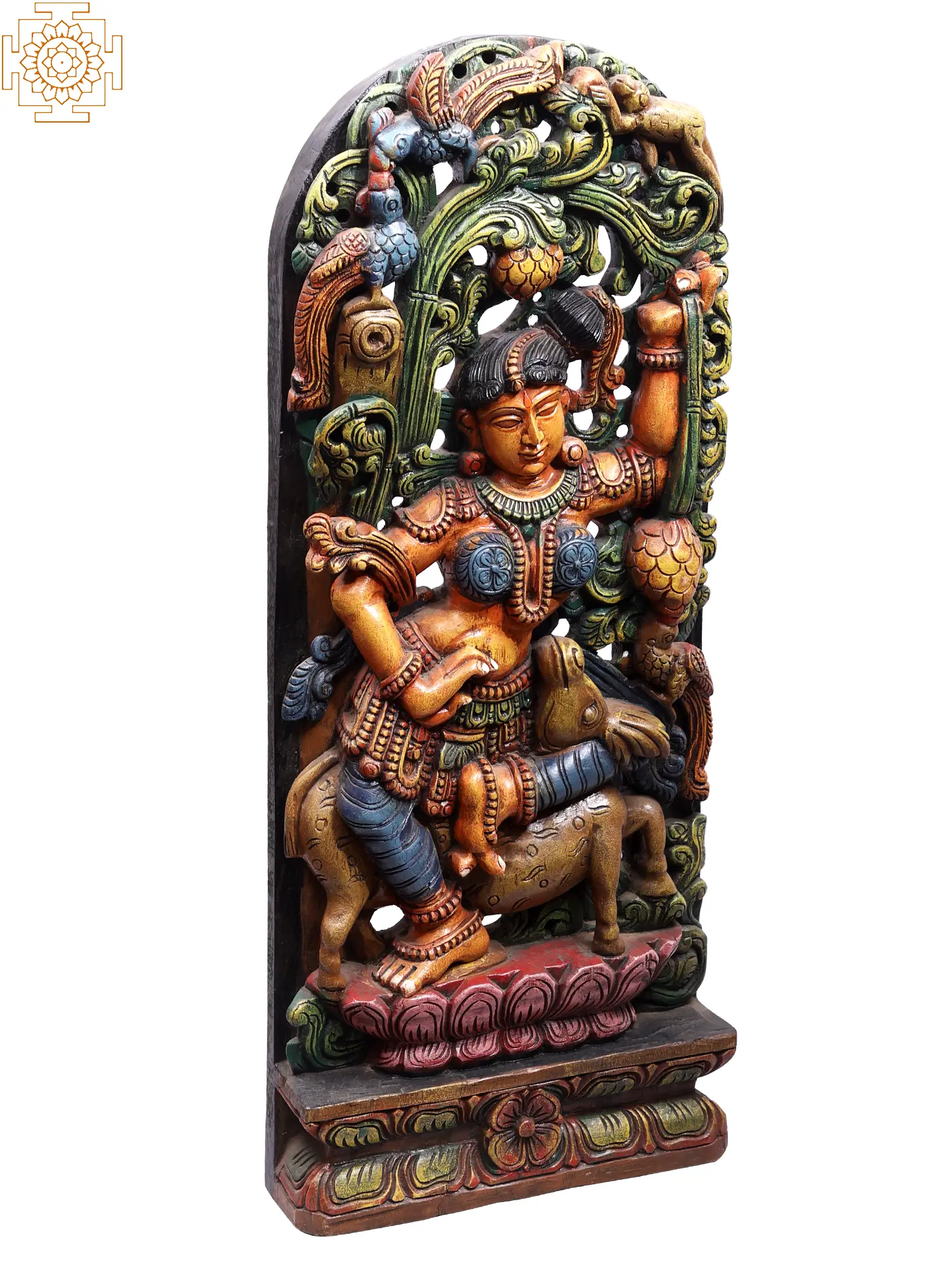 Later, poet and dramatist Kalidasa wrote "Abhigyanashakuntalam," a magnificent work of poetry based on the poignant Shakuntala narrative. The scene that Dushyant's eyes saw in the grooves pursuing the deer is replicated in this stunning wooden artwork, which presents Shakuntala, the beautiful maiden in a playful pose with the deer. She holds a vine extending towards her, causing a sprout of blossoms in her surroundings, which symbolizes her fecundity and youthfulness, which can bring spring in nature with a mere touch and cause a spring of love in the heart of Dushyanta.