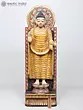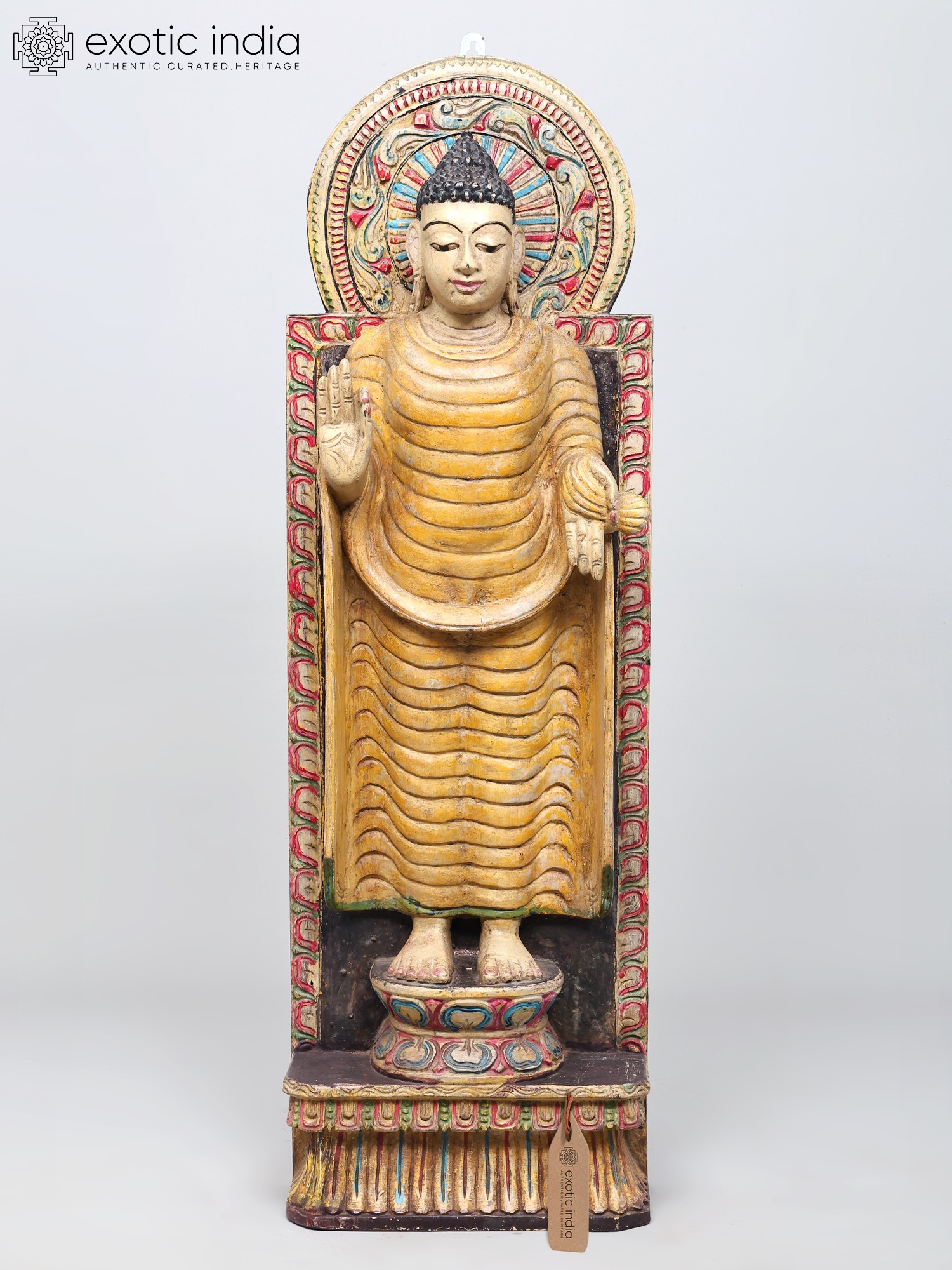 This magnificent wooden statue depicts the Buddha in a posture that radiates an aura of profound calm and reassuring protection. Standing at a commanding 36 inches tall, this piece is more than just a decorative item; it is a powerful representation of spiritual fortitude and the triumph over fear. The serene expression on the Buddha's face, with downcast eyes and a gentle smile, invites contemplation and inner stillness. The intricately carved robes, flowing in graceful folds, add a sense of dynamic movement to the otherwise static form, suggesting the subtle flow of spiritual energy. The rich, earthy tones and subtle weathering of the wood lend an air of ancient wisdom and timeless authenticity to this remarkable artwork.