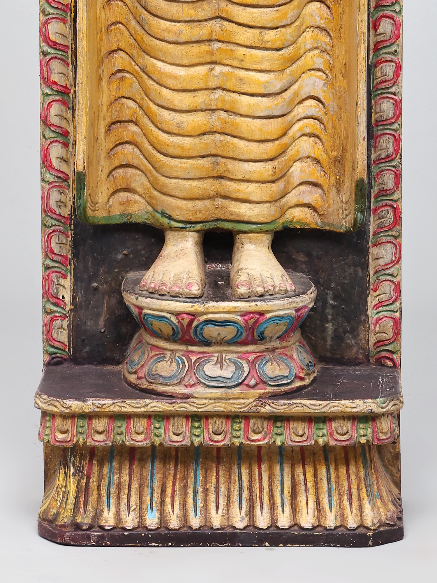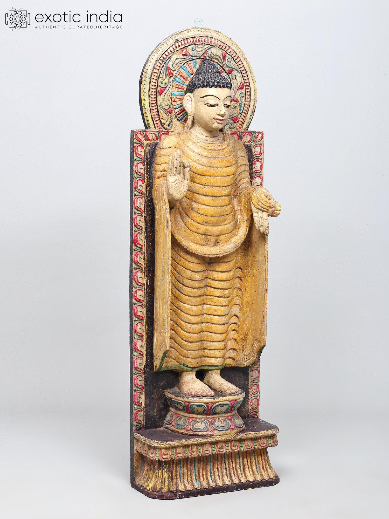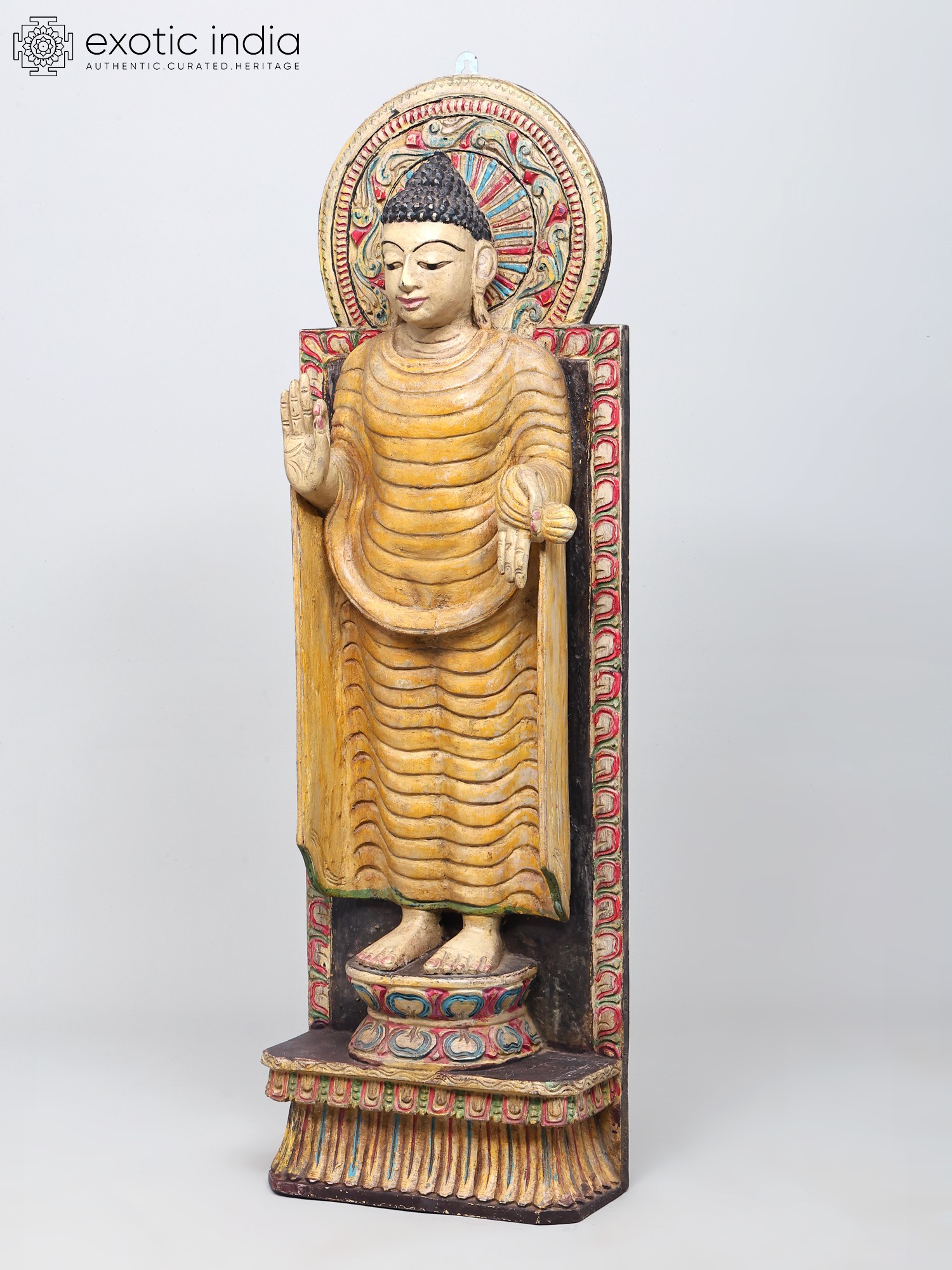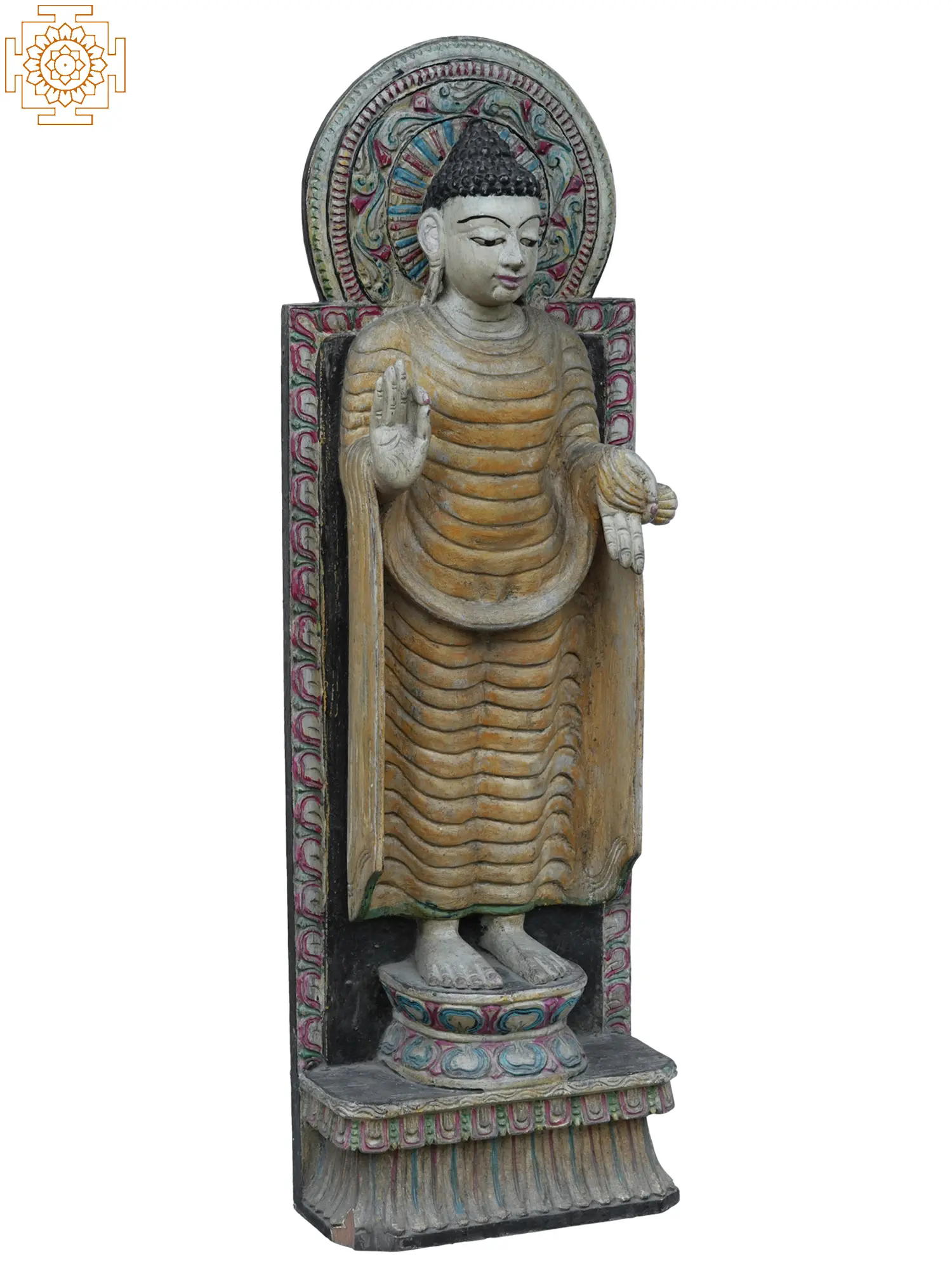Each detail of this statue speaks to the dedication and skill of its artisan. The elaborate mandorla, or halo, behind the Buddha's head is adorned with a complex, circular motif, reminiscent of sacred geometry and cosmic order. The base upon which the Buddha stands is equally ornate, with layered patterns that elevate the figure and draw the eye upwards. The use of wood as the primary material connects this piece to a long and rich history of sculptural traditions across Asia, where wood has been favored for its warmth, versatility, and spiritual resonance. This statue is not merely an object but a vessel of cultural heritage, carrying with it the stories, philosophies, and devotional practices of centuries past. Whether placed in a meditation room, a living space, or a garden, it offers a focal point for mindfulness and a connection to profound spiritual teachings.