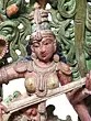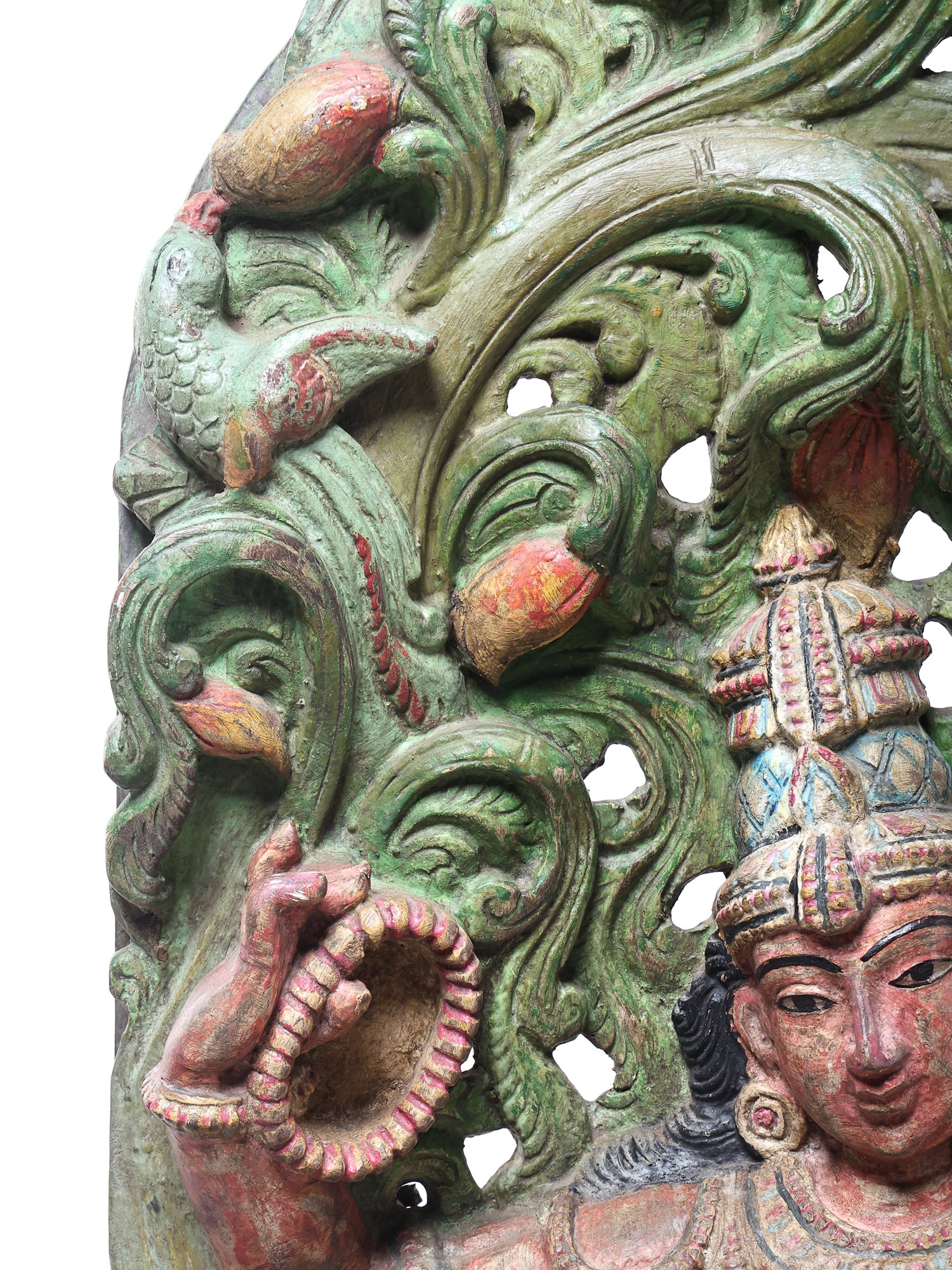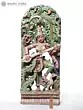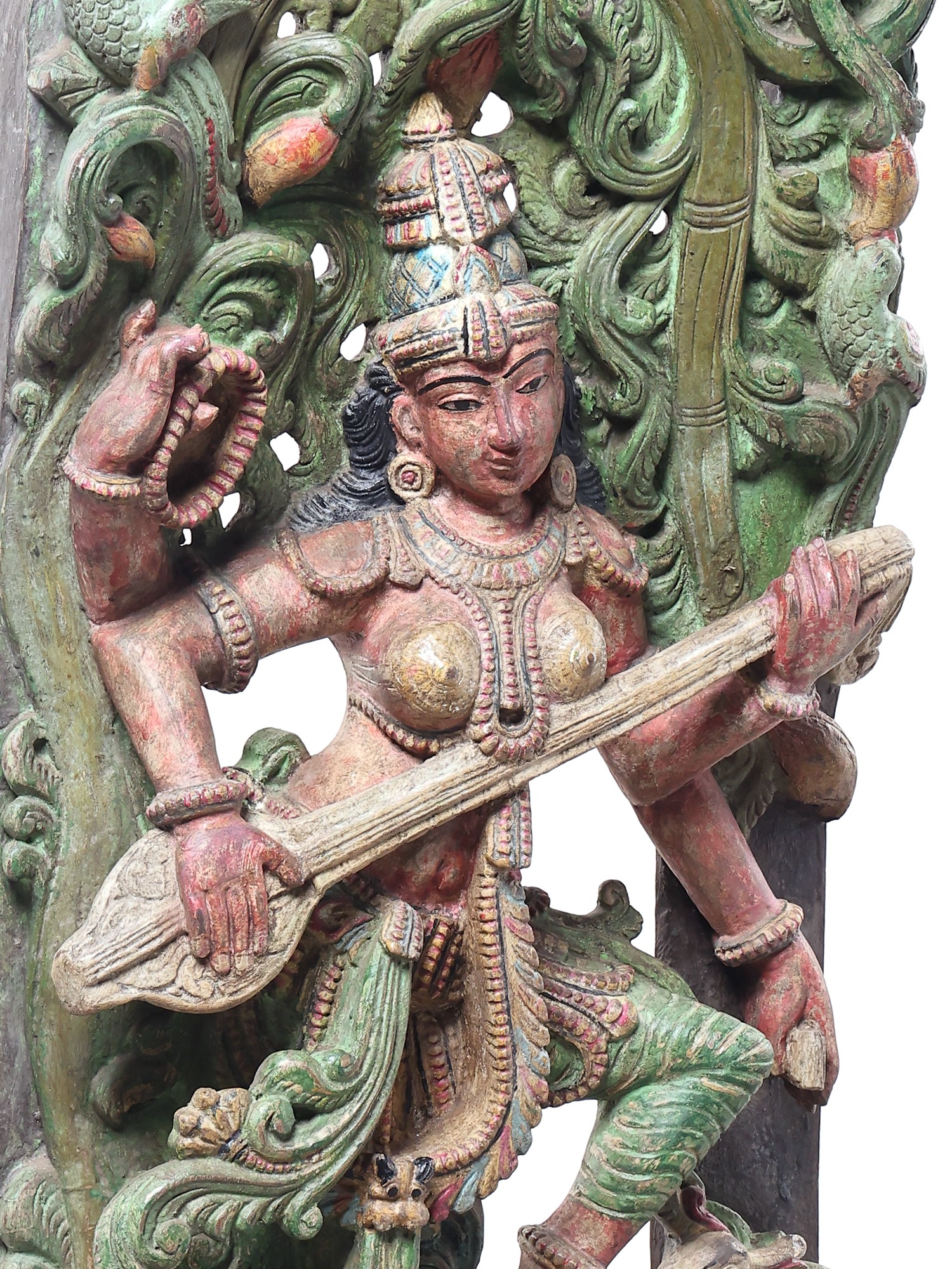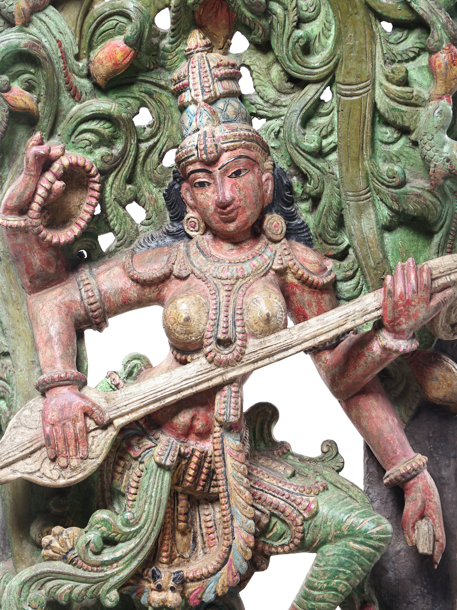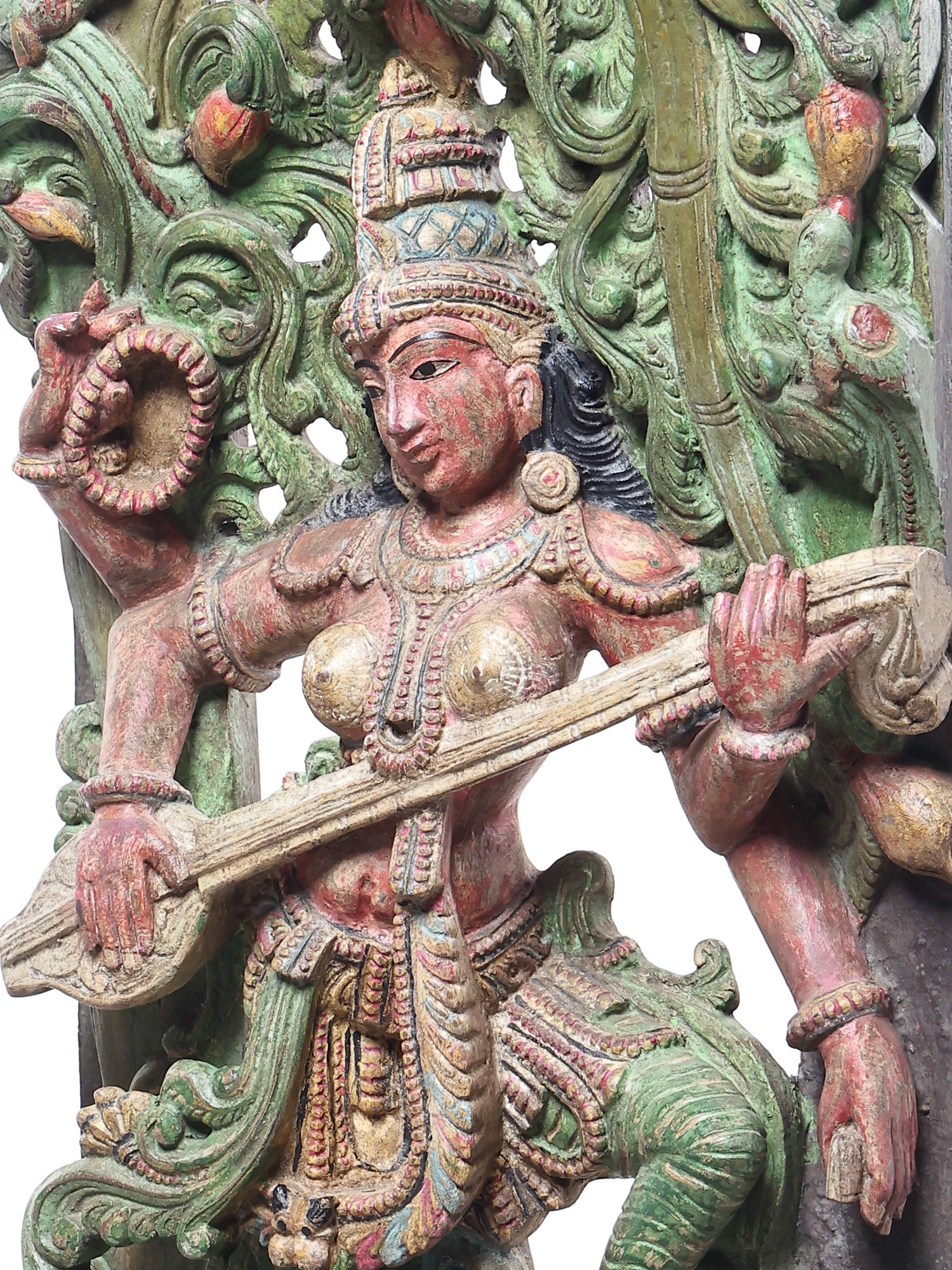 A Sarasvati sculpture of unequalled beauty and life. Under a canopy of luxuriant green stands the wife of Brahma. She is little more than a wisp, the fairest of the Hindu Devi pantheon. Her long, slender limbs - not unlike the shape of the Indian classical musical instrument She holds in Her hands - are clad in silk of the same colour.