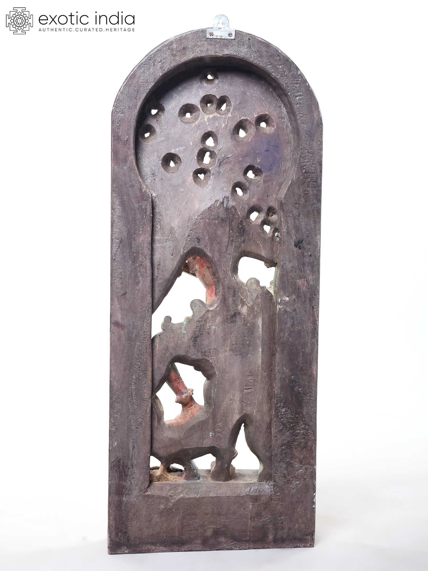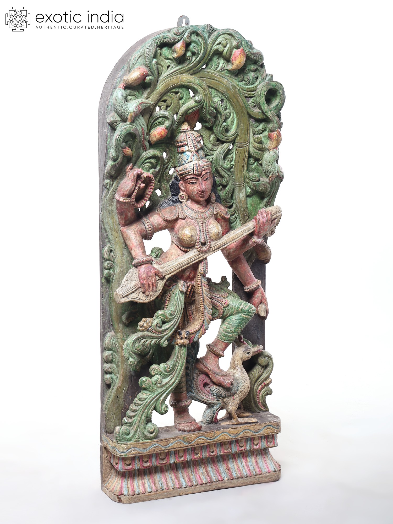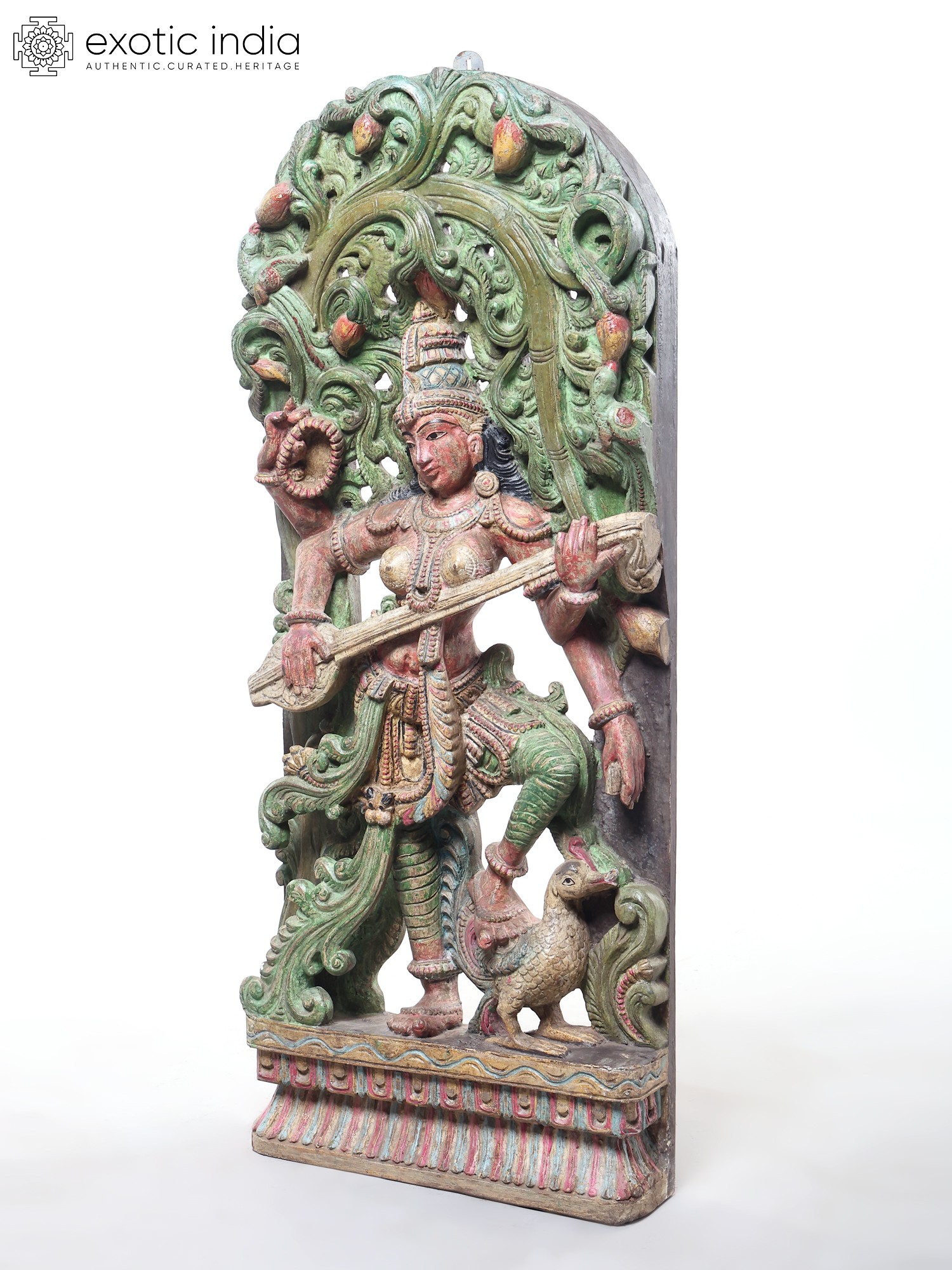 The gossamer beauty of Sarasvati has been captured perfectly in this wood-carved iconography. It draws influence from the temple wall architecture of South India. As such, the deeply expressive eyes, the tall crown above Her jewel-black hair, and Her attire and adornment are all faithful to tradition in terms of style.