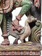 The canopy of green above Sarasvati’s crowned head is interspersed with the buds of flowers the colour of fire. These add a pop of colour to the predominantly pastel palette. On the lotus pedestal, underneath a fair foot of the Devi, is Her vahana, the colourfully plumaged peacock.