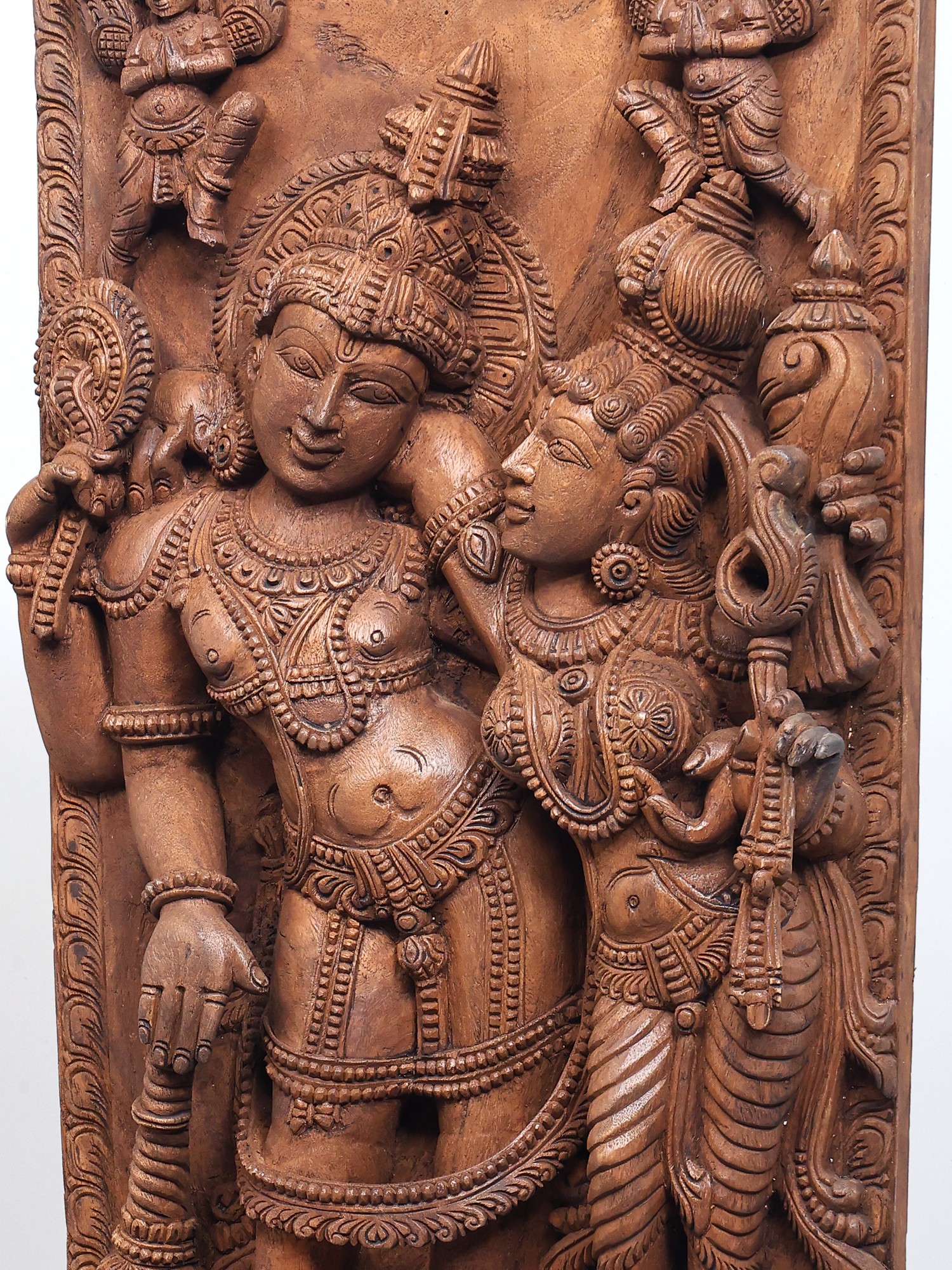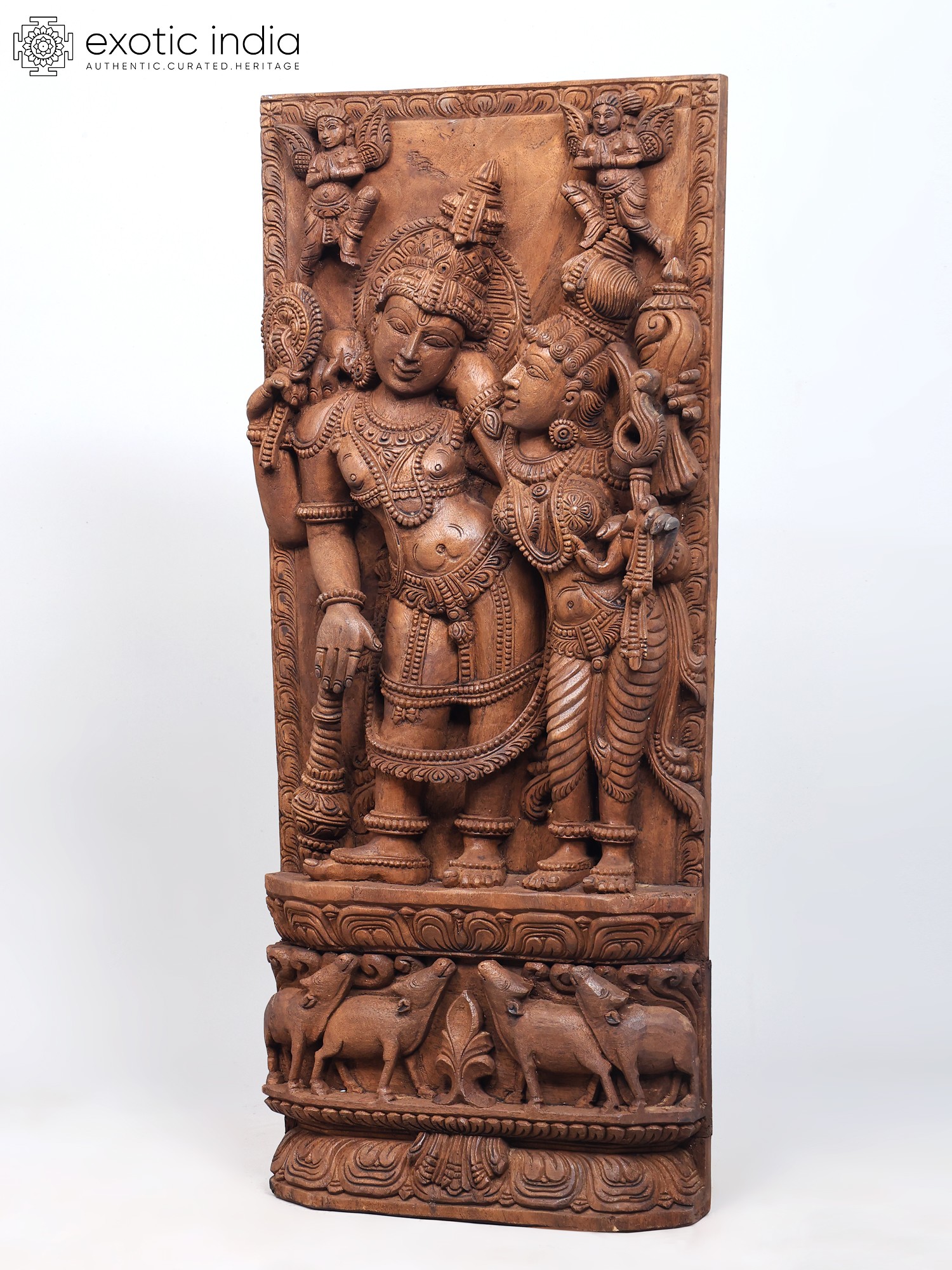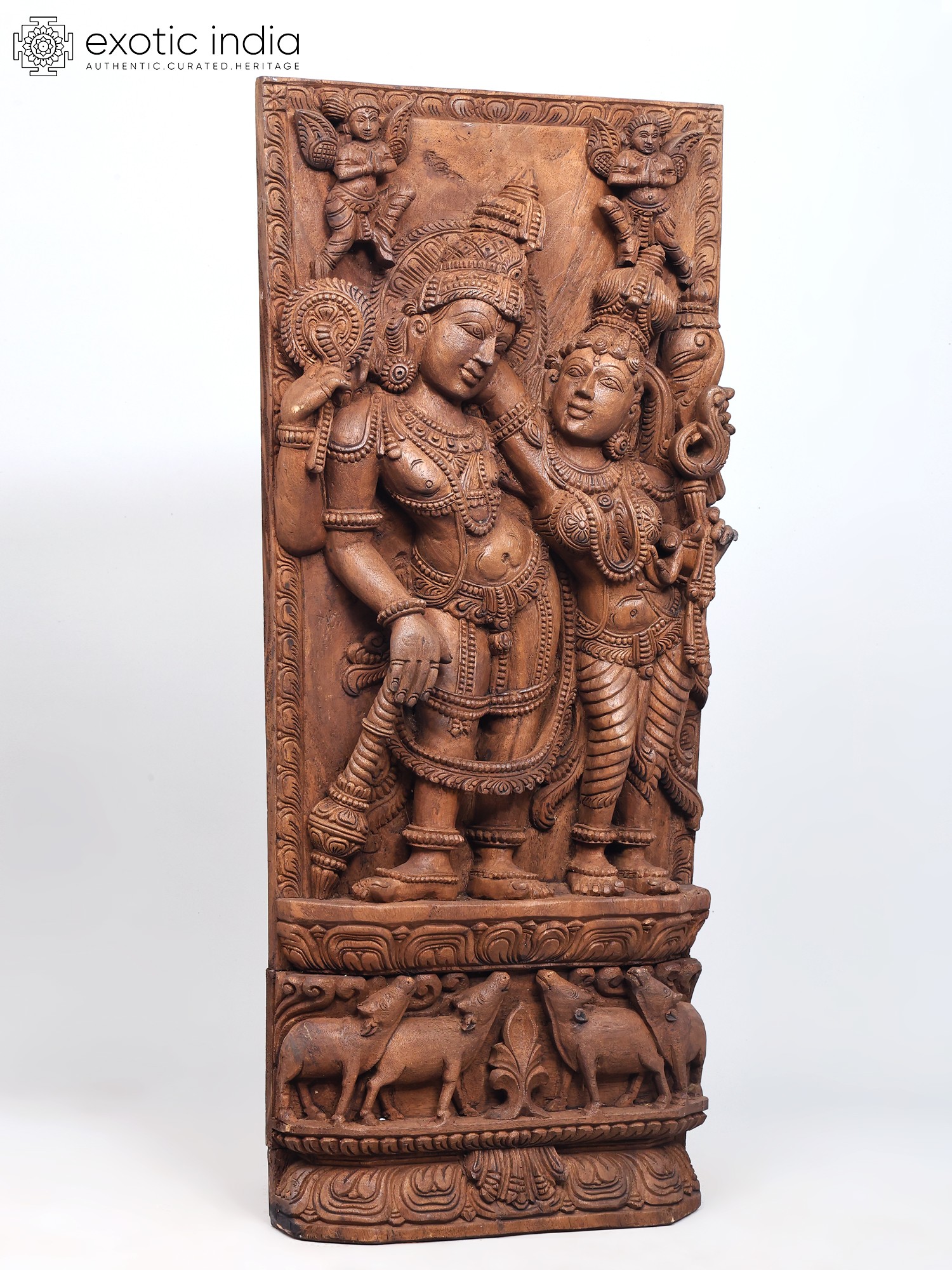 Lord Vishnu and His wife stand next to each other, on a plinth engraved with lotus petals. He tilts languidly to one side, while She leans on to Him as She stares into His eyes. Mythical winged creatures grace the upper corners of this carved wooden panel. The sheer wealth of detail in person and the shringar of the divinities make this an investment purchase.