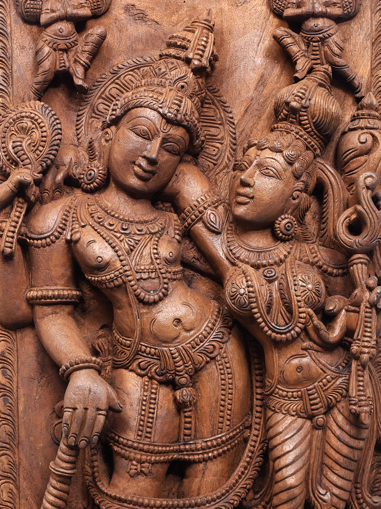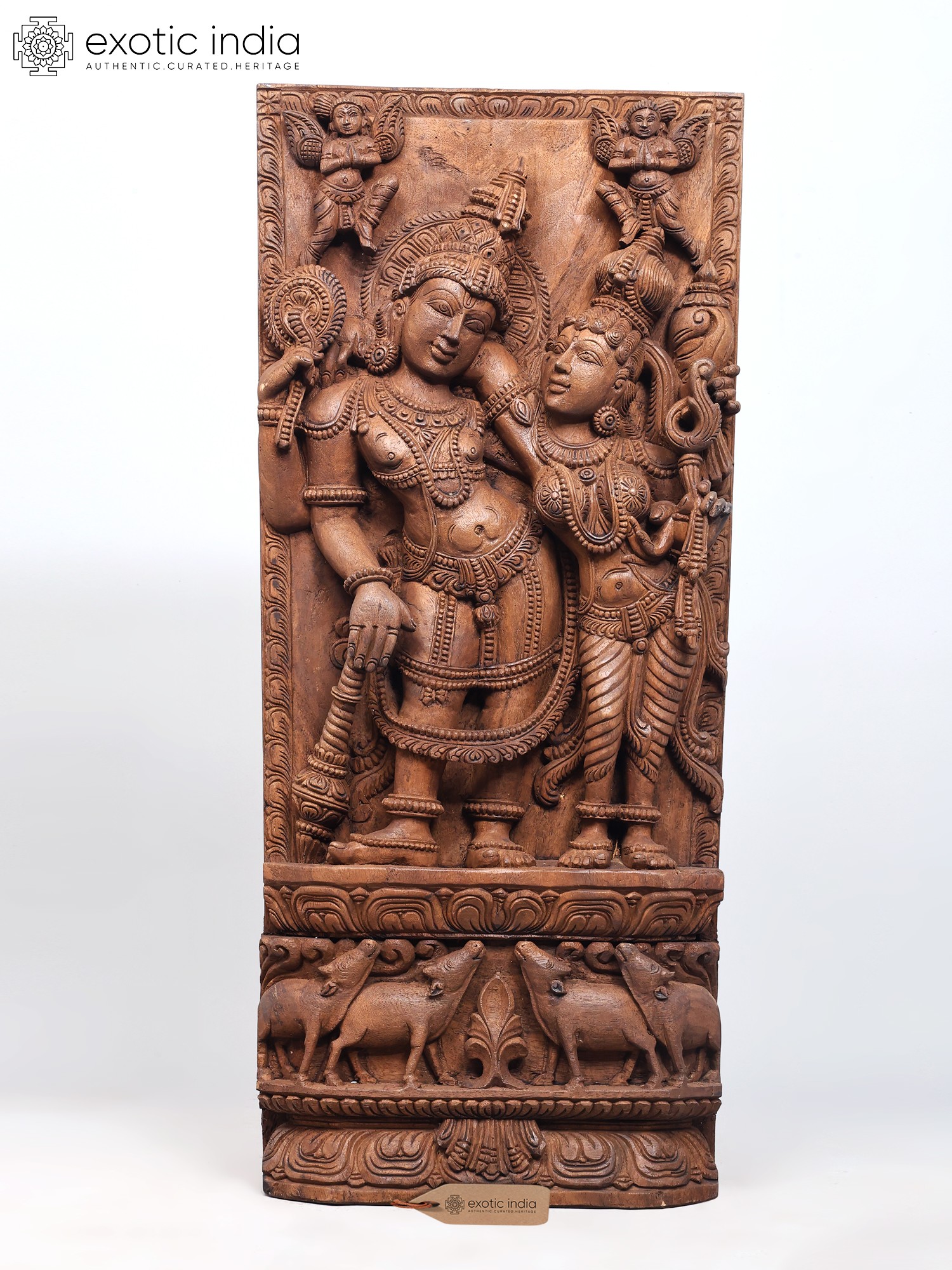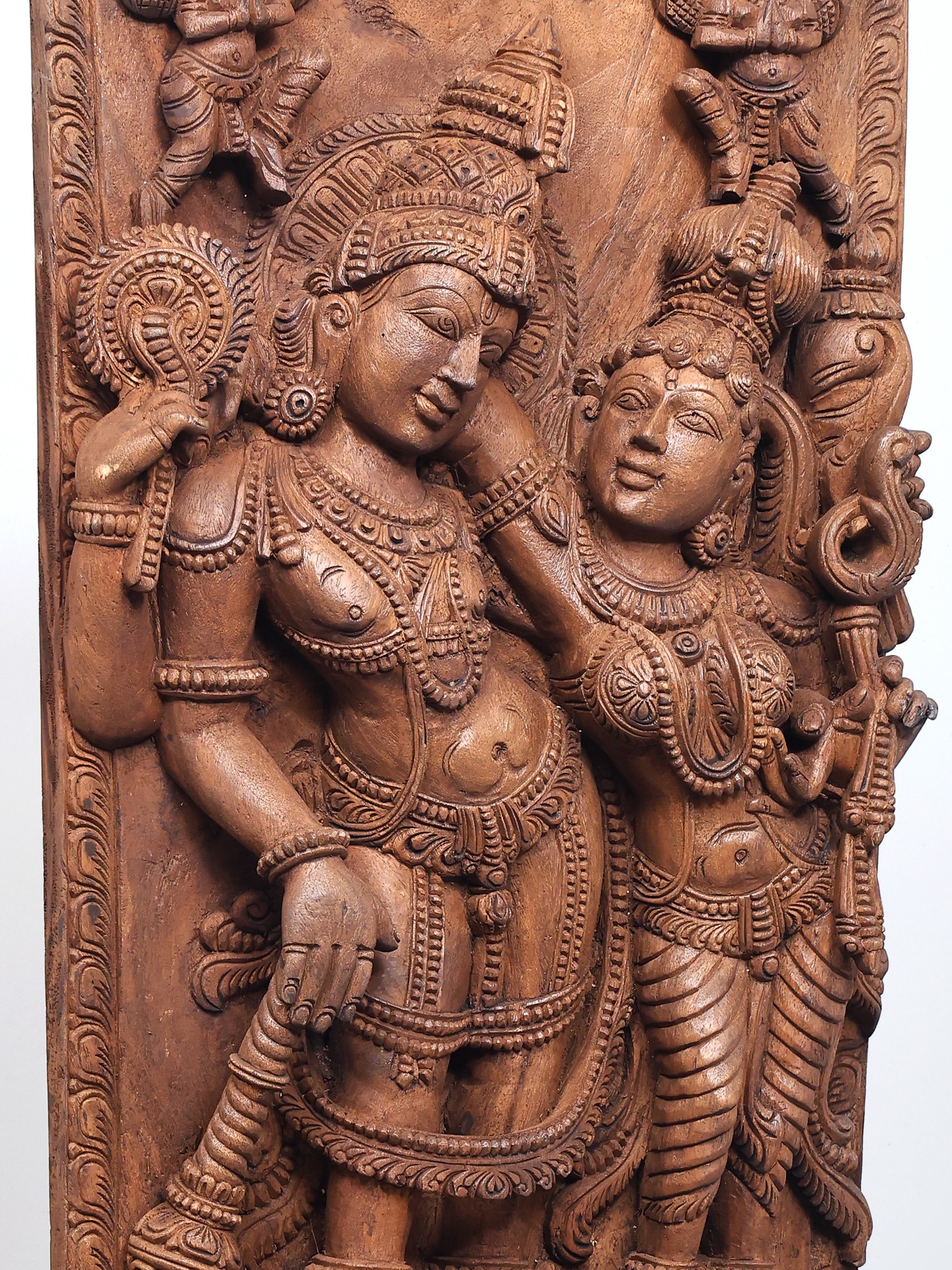 Lord Vishnu and His wife stand next to each other, on a plinth engraved with lotus petals. He tilts languidly to one side, while She leans on to Him as She stares into His eyes. Mythical winged creatures grace the upper corners of this carved wooden panel. The sheer wealth of detail in person and the shringar of the divinities make this an investment purchase.