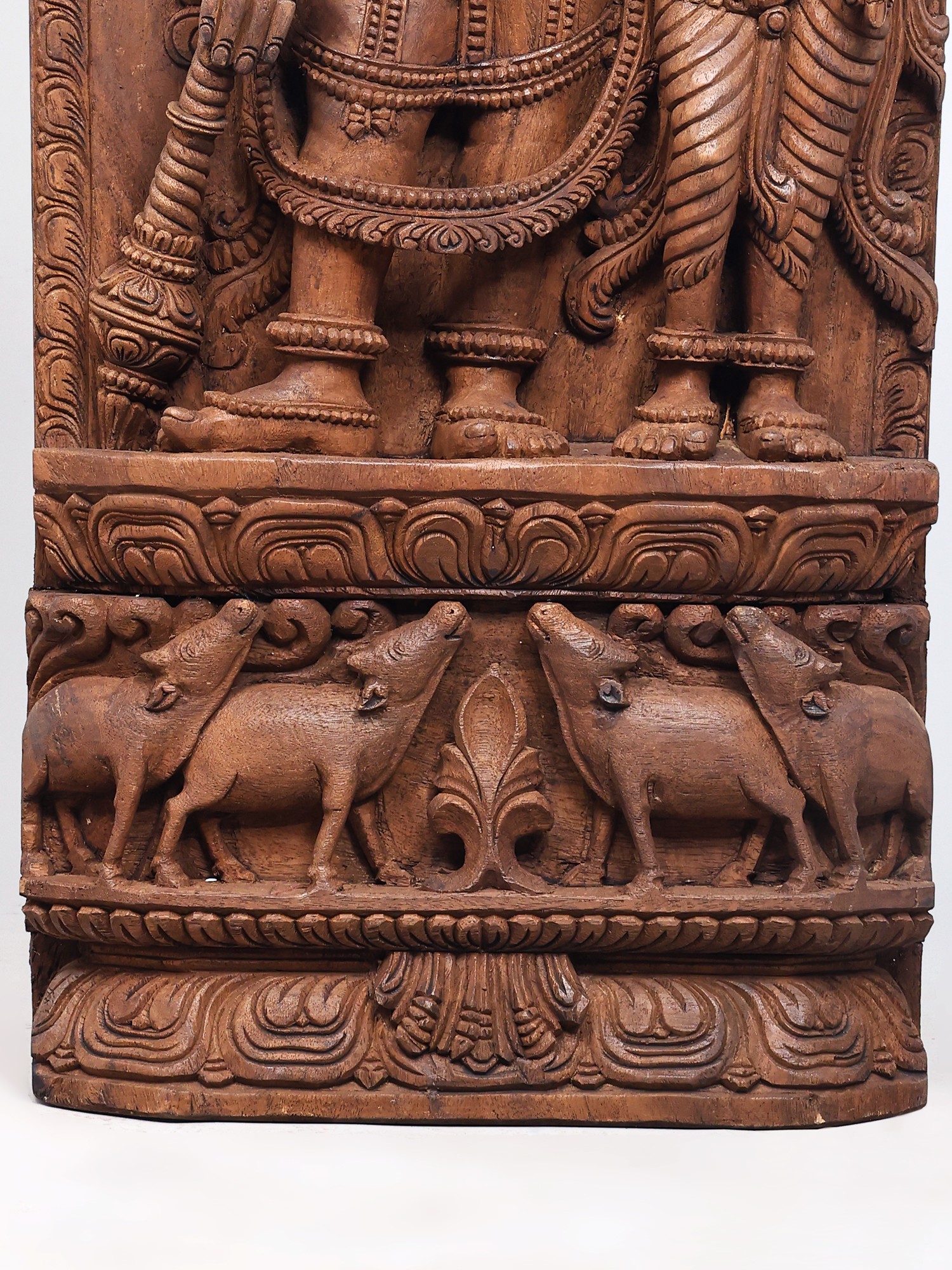 An interesting detail lies beneath the feet of Vishnu-Lakshmi. A herd of cows gather together to hold up the bed of lotuses cradling their feet. These cows are symbolic of the cowherd Krishna, one of the most widely loved Vishnu-avatara,