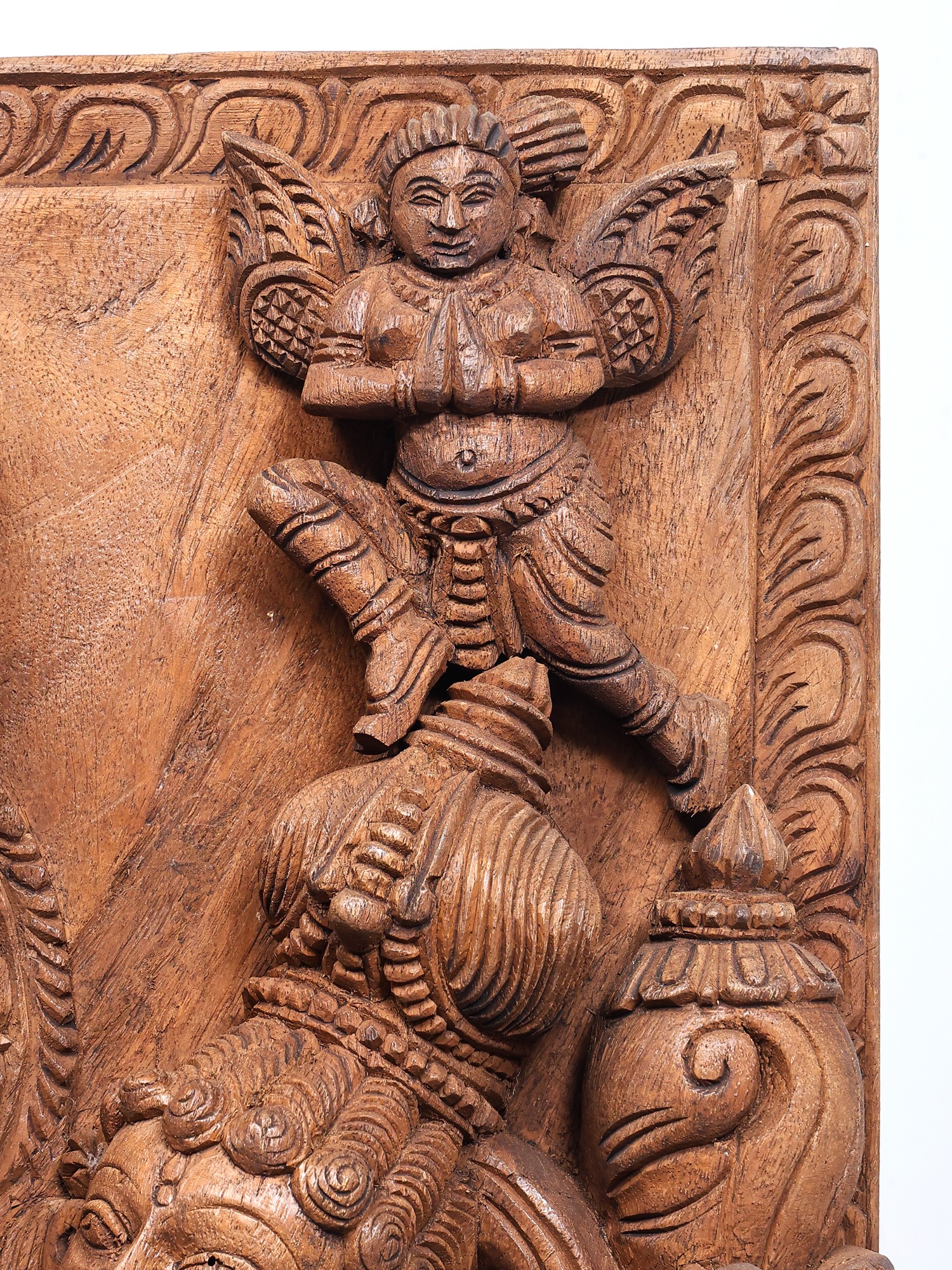 A rectangular panel of wood. Complex carvings introduced onto its surface over a prolonged period of time, by the hands of an exceptionally skilled sculptor, has projected the divine image of Vishnu and Lakshmi. Such a work would make a gorgeous addition to the home of the modern-day devotee with a deep respect for the not-so-modern.