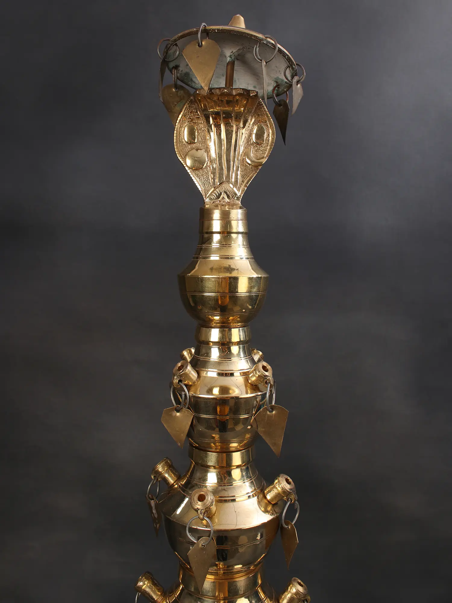 These lamps progressively decrease in size as we go upwards. At the zenith of this lamp is a raised-hooded serpent. This serpent has five hoods. The multi-hooded snake is a recurring motif of Indian spiritual art. It even has a parasol on top, a miniscule aspect of the composition that derives heavily from traditional South Indian iconographical aesthetics. Its presence adds to the auspiciousness of this lamp, which in turn would make any corner of your home or office sacred.