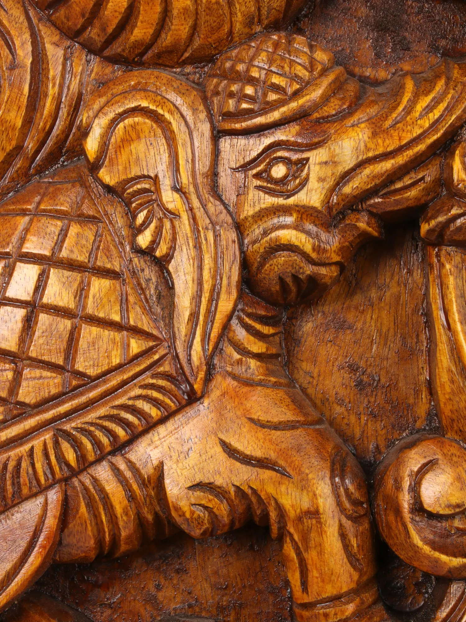 Crafted from the ancient whispers of skilled artisans, this wooden panel transcends time, etching tales of tradition and reverence. A masterpiece of traditional design, it bears the mighty “Gajanan”, Lord Ganesha, in exquisite detail. His form, a symphony of carved wood, radiates serenity, and his elephant head exudes wisdom. The animals, loyal companions to the deity, come alive—a proud peacock, its iridescent plumage unfurling in glory, and a gentle elephant, bearing the weight of the world with grace. As a wall hanging, this piece transforms any space into a sacred sanctuary, resonating with nature’s elegance and divine significance.