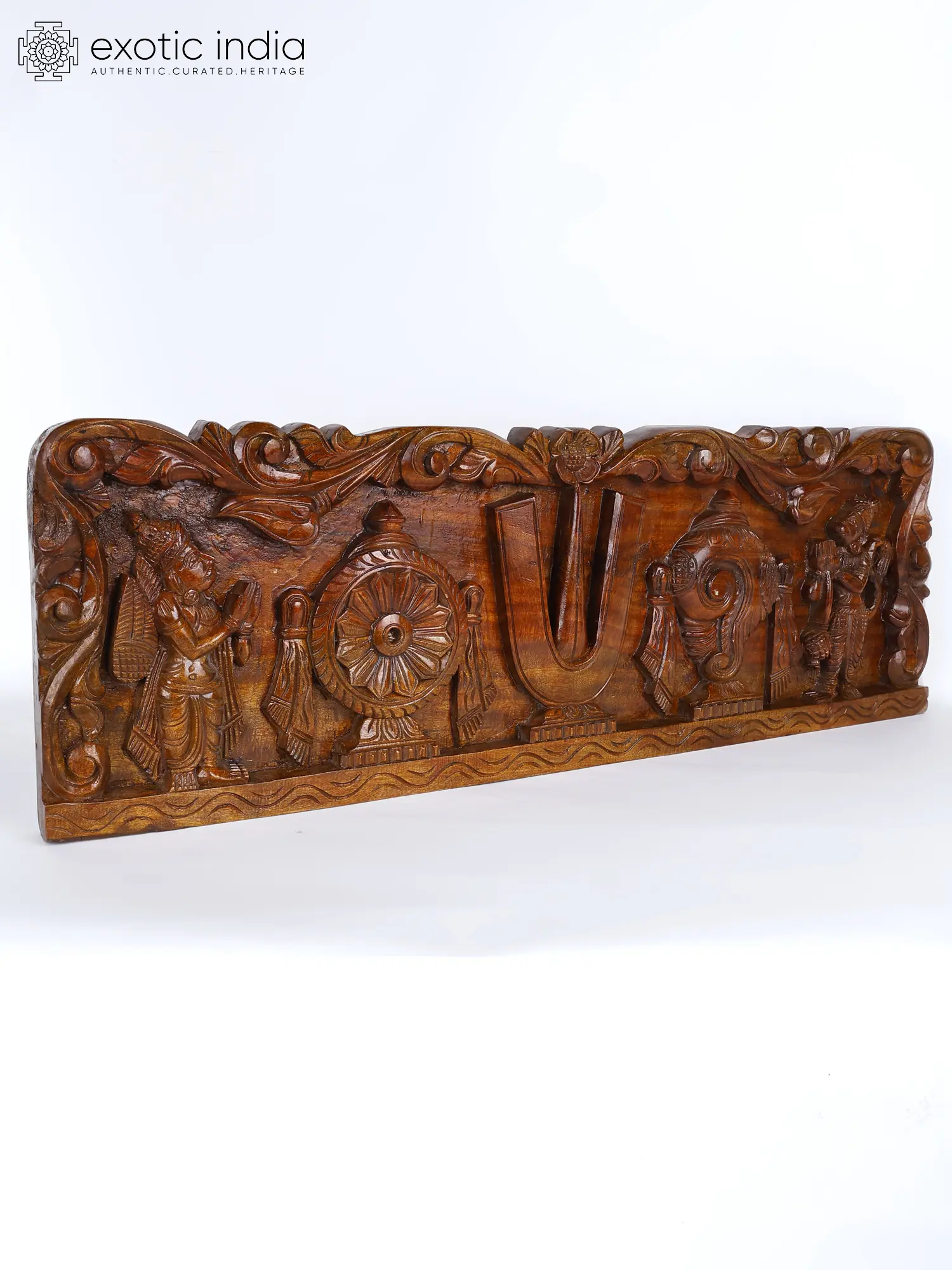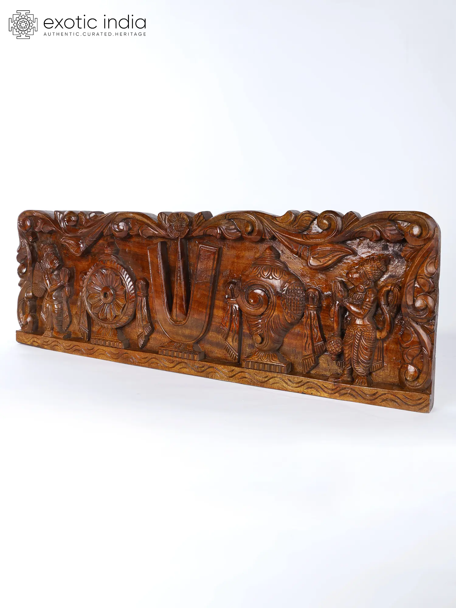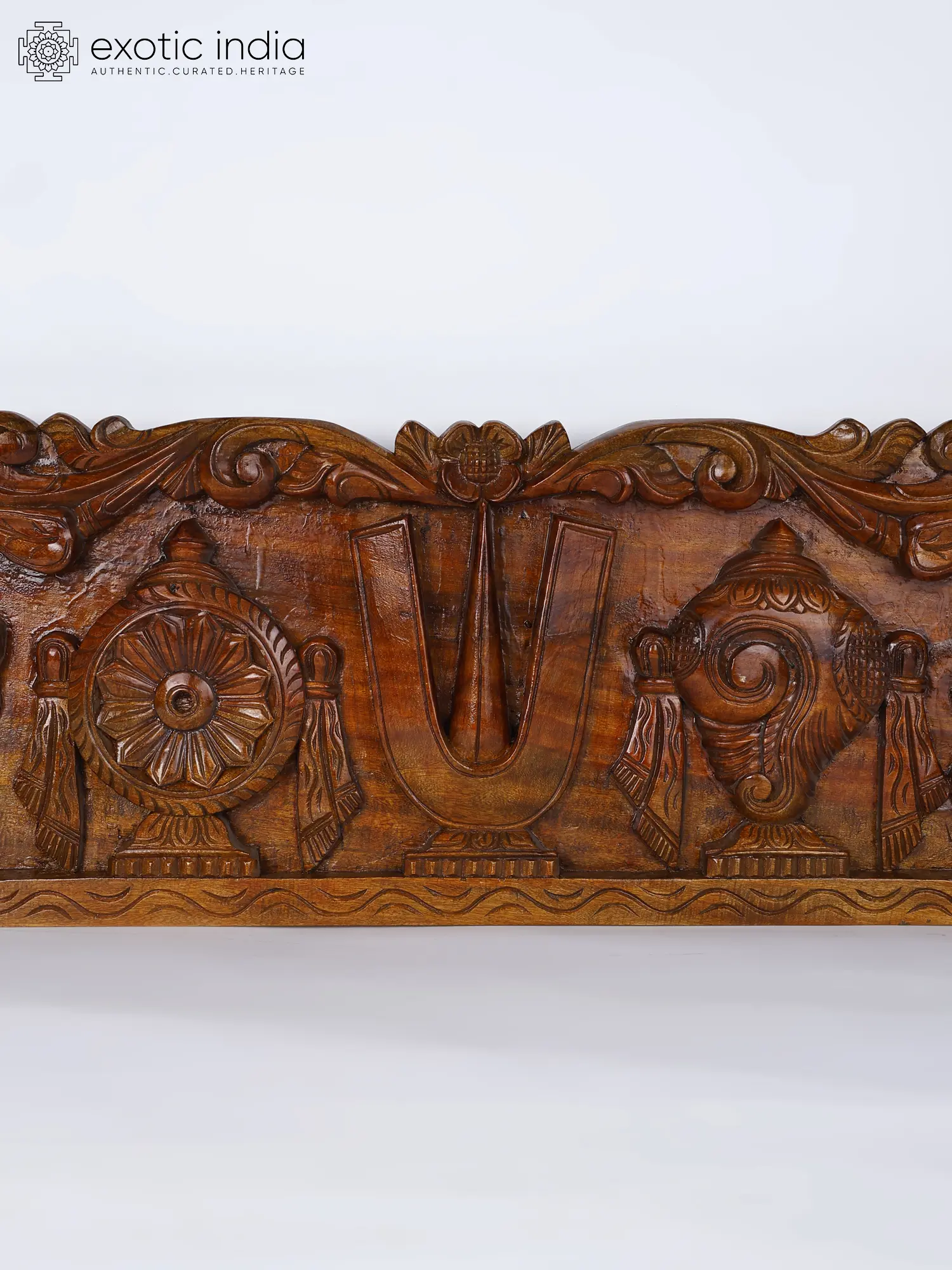 The horizontally laid wooden art is adorned with the Vaishnava tilak in the center, with Chakra and Shankha, the divine attributes of Narayana on each side.