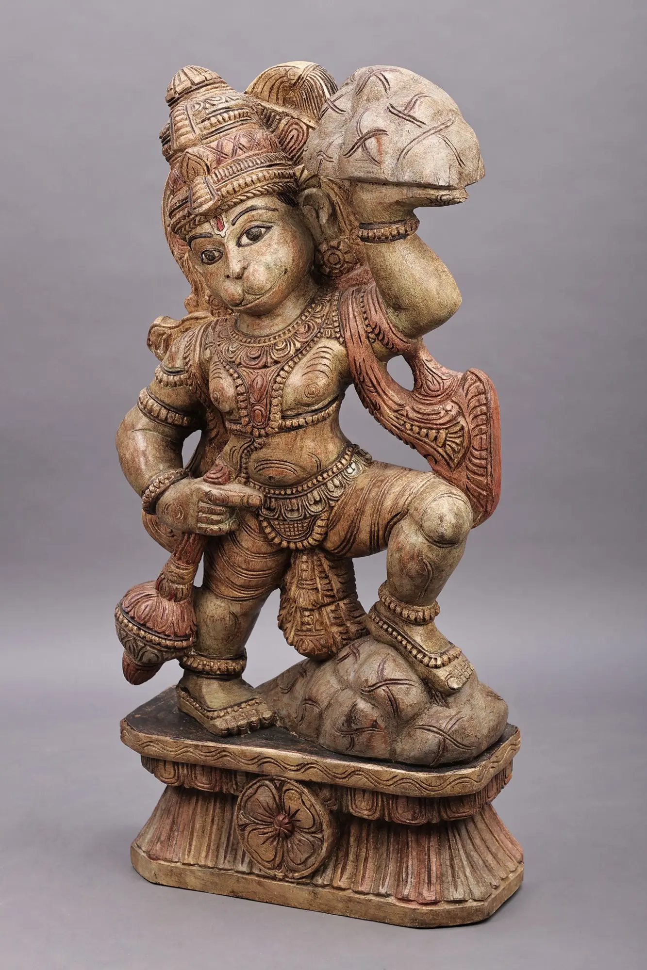 This striking rendition of Veer Hanuman showcases the intricate carving techniques passed down through generations in South India. The artist has masterfully rendered the divine monkey god in a dynamic pose, poised for action. His powerful physique is adorned with traditional ornamentation, each element finely etched into the wood. The crown, the elaborate necklaces, the armbands, and the anklets are all rendered with exceptional precision, reflecting a deep understanding of iconographic conventions. The texture of the Sanjeevani mountain, with its craggy surface and symbolic markings, further enhances the narrative power of the sculpture. The base, also carved from wood, features decorative motifs that complement the grandeur of the central figure, providing a stable and aesthetically pleasing foundation. This artwork is more than just a decorative object; it is a spiritual artifact. Hanuman is revered as a symbol of strength, courage, and selfless service. Invoking his image is believed to bestow protection, overcome obstacles, and foster unwavering devotion. Placing this sculpture in your home or sacred space can serve as a constant reminder of these virtues, inspiring perseverance and unwavering faith in the face of adversity. It is a piece that not only enriches your surroundings with its artistic merit but also imbues your environment with a sense of divine energy and profound storytelling.