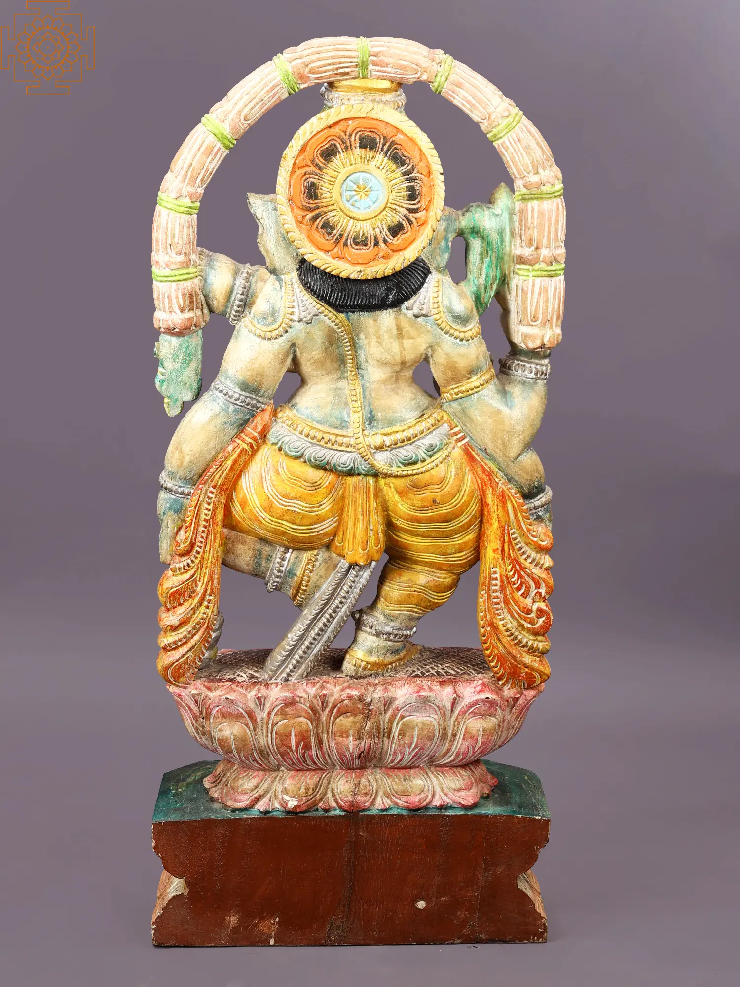 This impressive 35-inch tall statue is meticulously handcrafted from teak wood, prized for its durability and rich grain. The wood itself adds a grounding element to the divine form it embodies. Notice the details that reveal the artisan's skill: the flowing lines of Ganesha's trunk, the folds of his garments, and the intricate lotus base upon which he stands. Ganesha's dance posture (Nritta Ganapati) symbolizes his joyous nature and mastery over the universe. It is a dynamic representation of the divine in motion, expressing both power and grace. His four arms hold symbolic objects: generally an axe to cut off attachments, a noose to capture desires, a sweet (laddu) representing the sweetness of liberation and a hand in blessing. Every element is carefully considered and imbued with meaning, making this statue a potent reminder of the divine presence in our lives.
