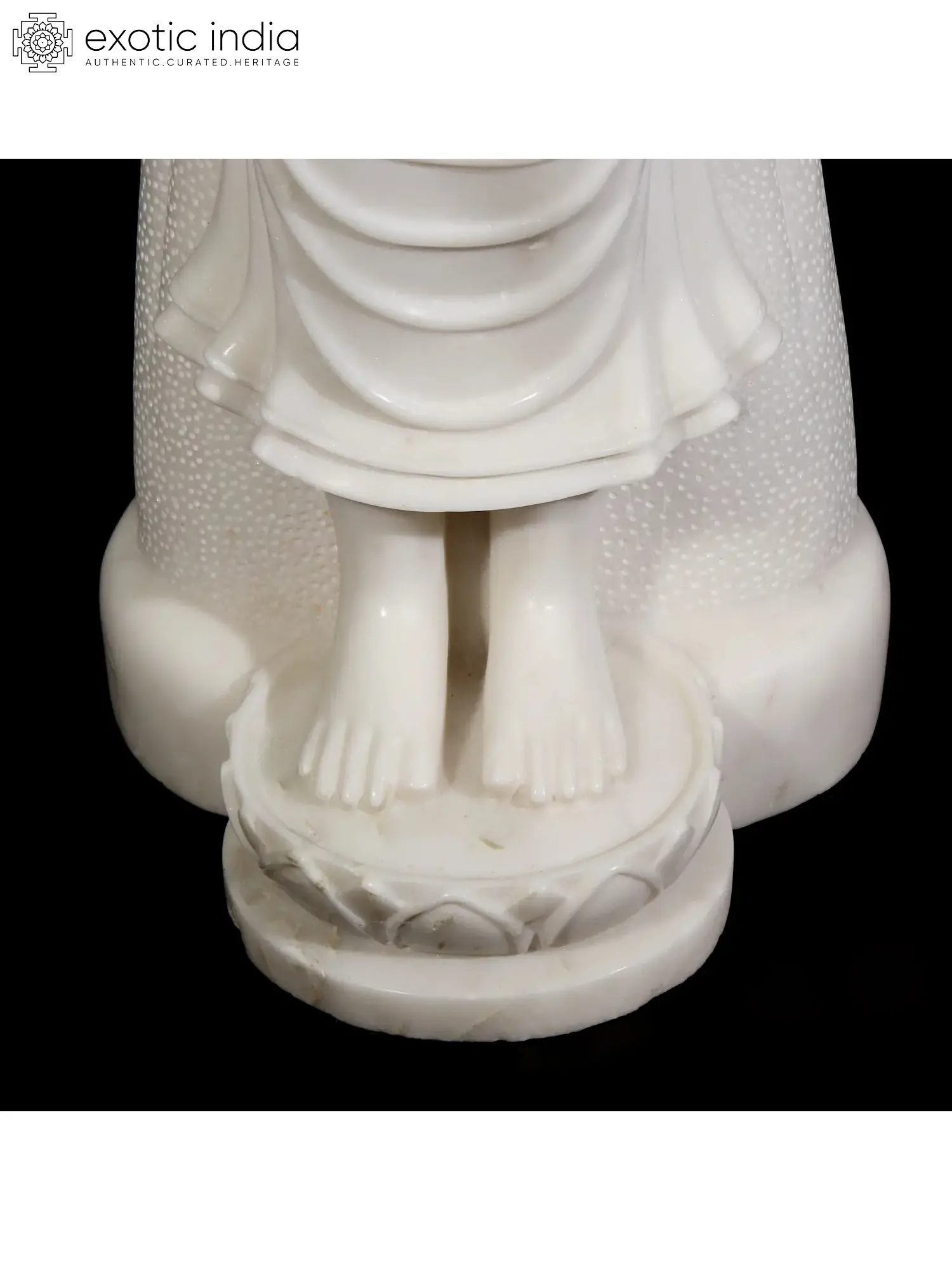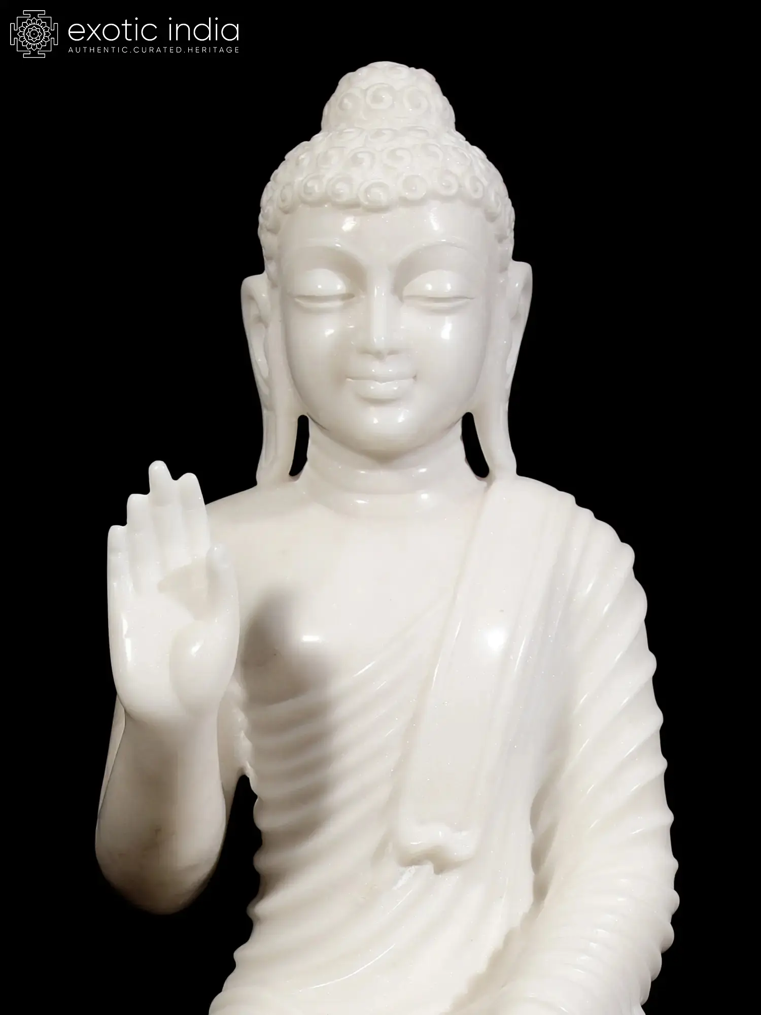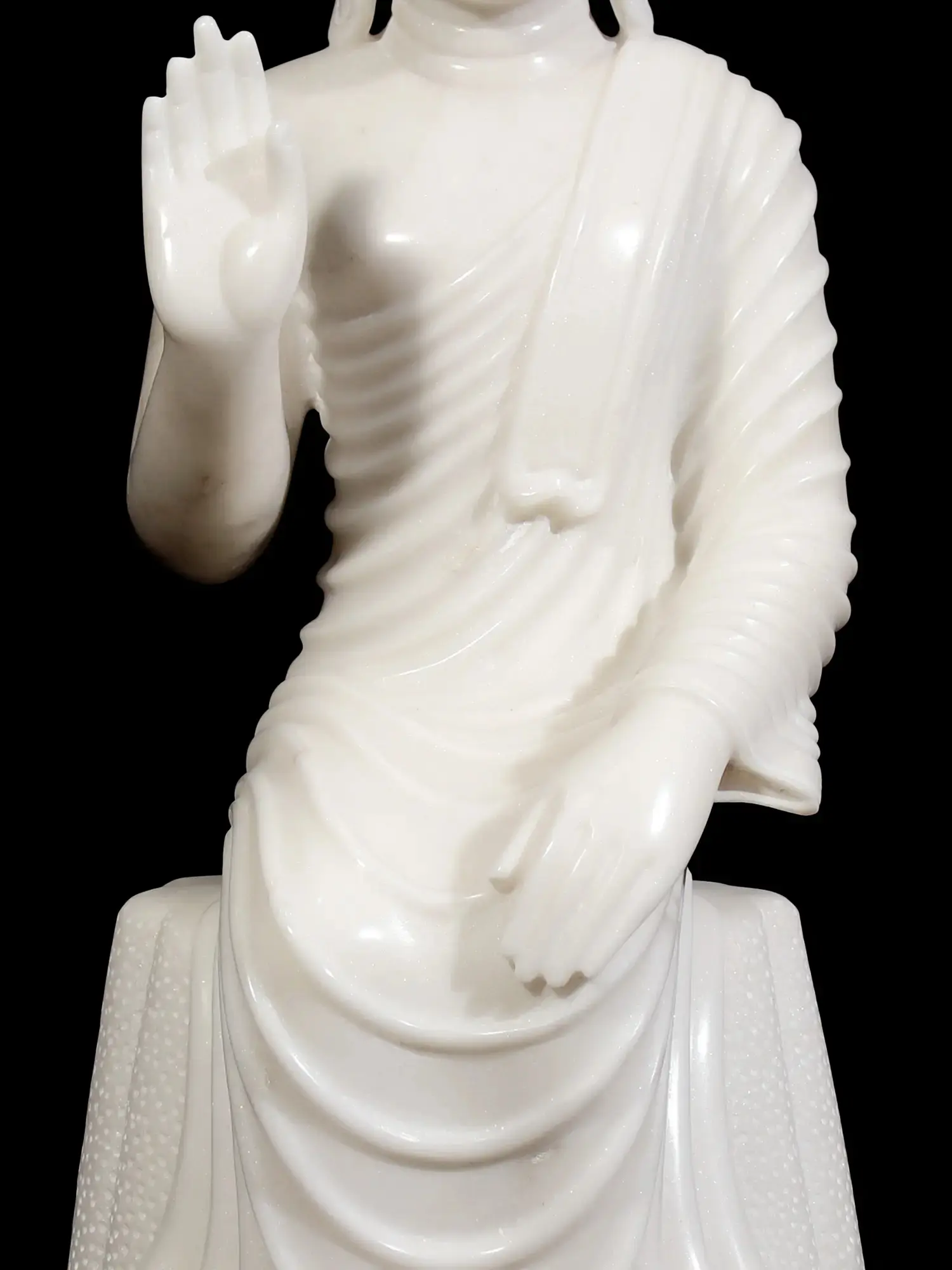 This white marble statue depicting Buddha in a seated position and blessing his devotees is full of symbolism and spiritual significance. The seated posture represents the confidence that arises from inner wisdom and self-realization. The pristine look of the white marble enhances the statue's tranquillity, making it an ideal addition to create a peaceful ambiance. The meticulous depiction of Buddha's curls and clothing lines reflects the attention to detail and the reverence for the sacred figure. The lotus pedestal on which Buddha stands symbolizes his role as a patron of knowledge and enlightenment. This statue serves as a reminder of the transformative power of wisdom, inner peace, and the compassionate blessings that Buddha bestows upon his devotees.