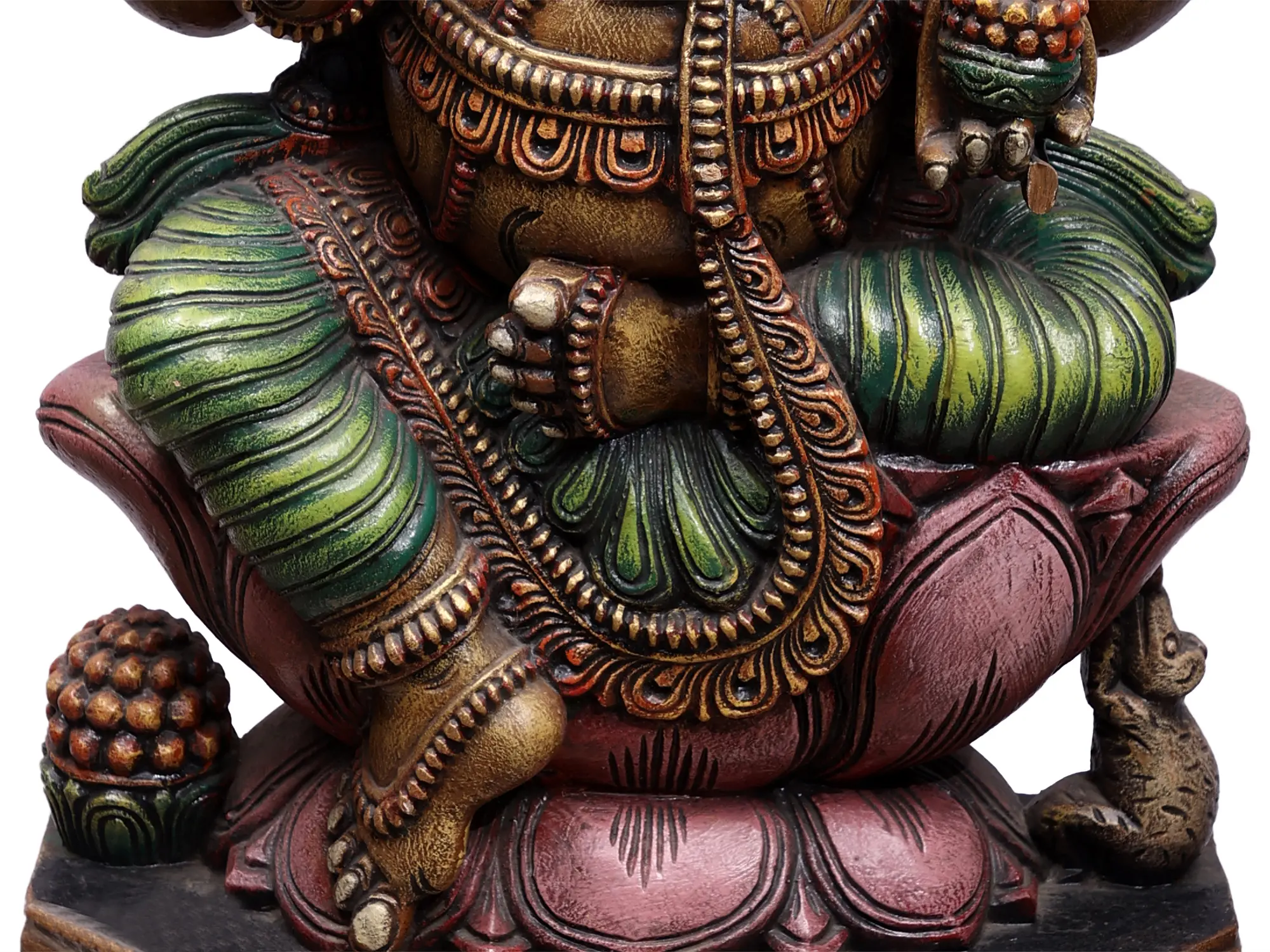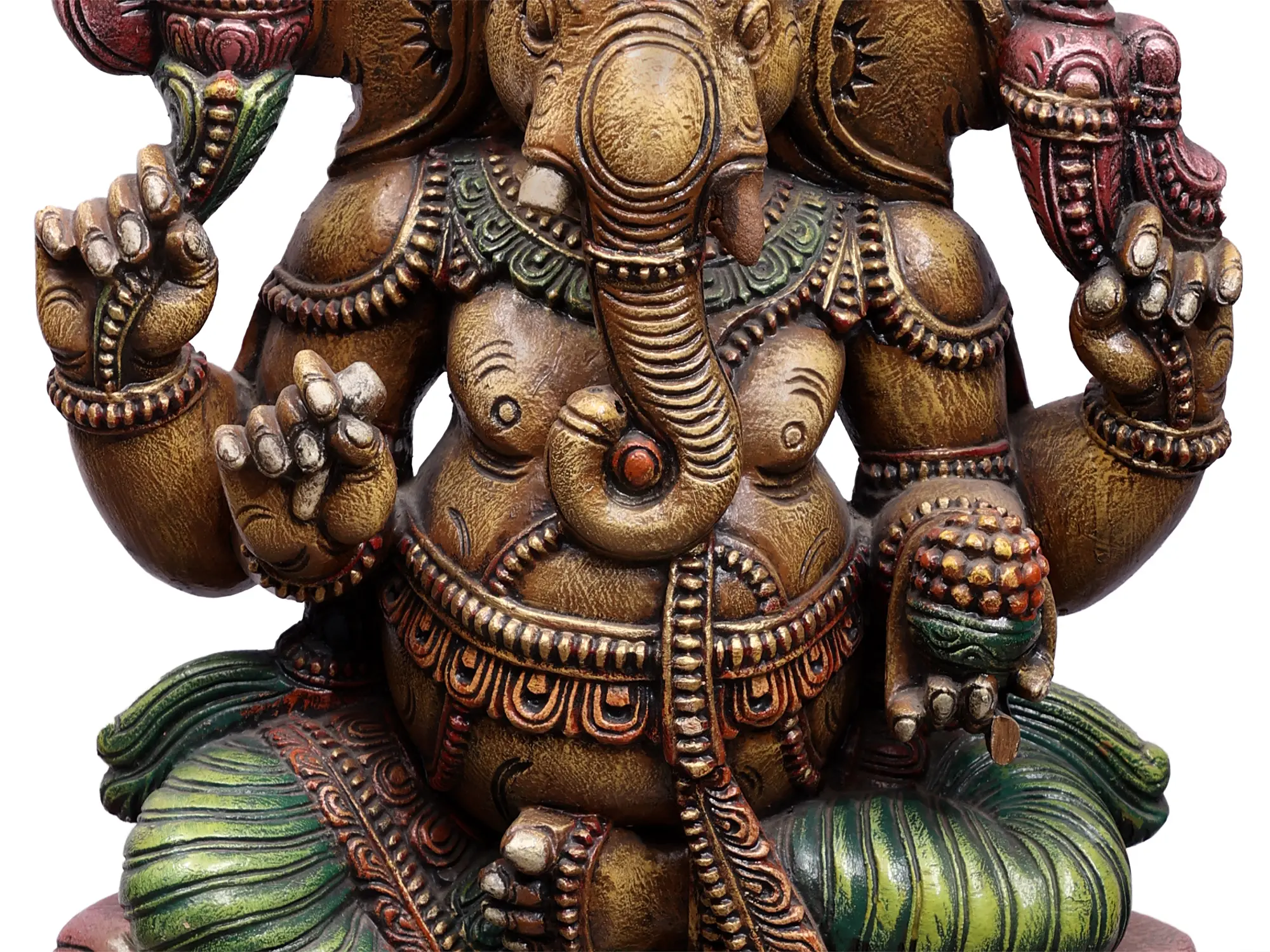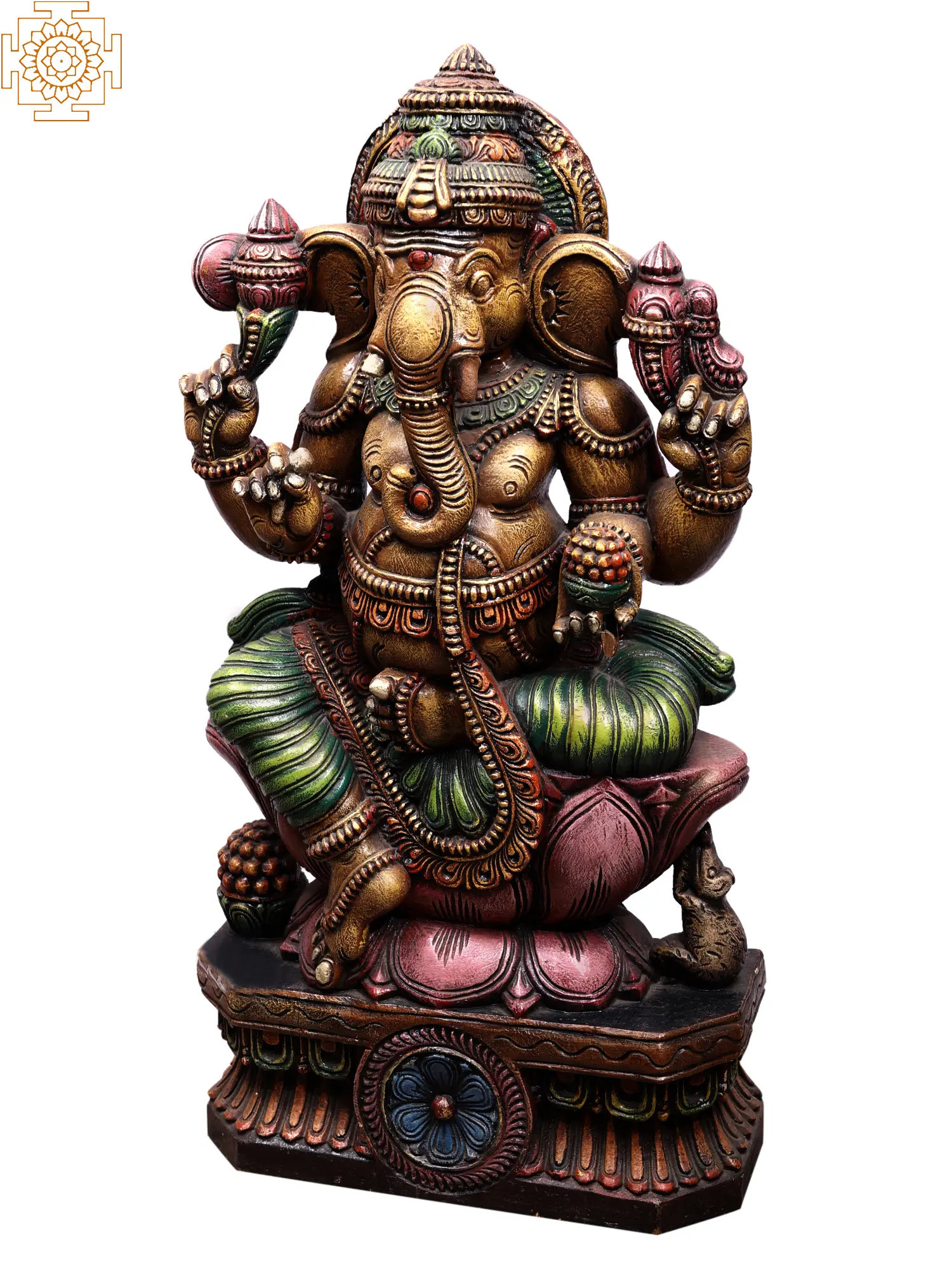 Crafted from rich, resonant wood, this Ganesha statue showcases exceptional artistry and attention to detail. The wood has been expertly carved and finished to highlight the deity's features, from the intricate patterns on his garments to the gentle curve of his trunk. The vibrant yet harmonious coloration adds depth and life to the sculpture, further enhancing its devotional appeal. The statue is seated upon an elaborate lotus, a symbol of purity and spiritual growth, and a sturdy, decorative base, all meticulously rendered to create a truly majestic presence. This piece is not merely an idol but a testament to the skill of the artisans and a conduit for spiritual connection, designed to bring blessings, prosperity, and peace into your home. It serves as a constant reminder of the divine presence that guides and protects, embodying the very essence of auspiciousness.