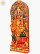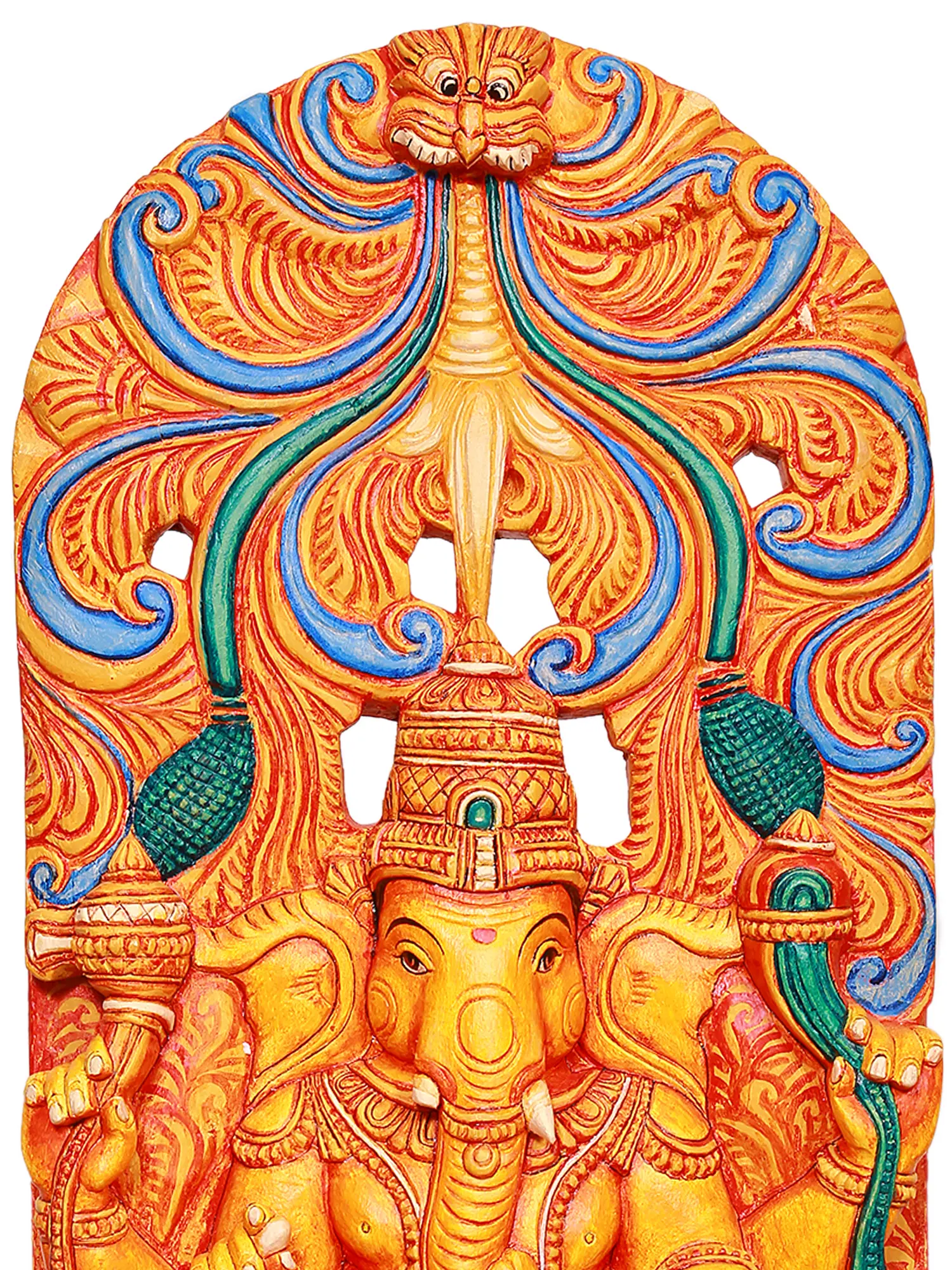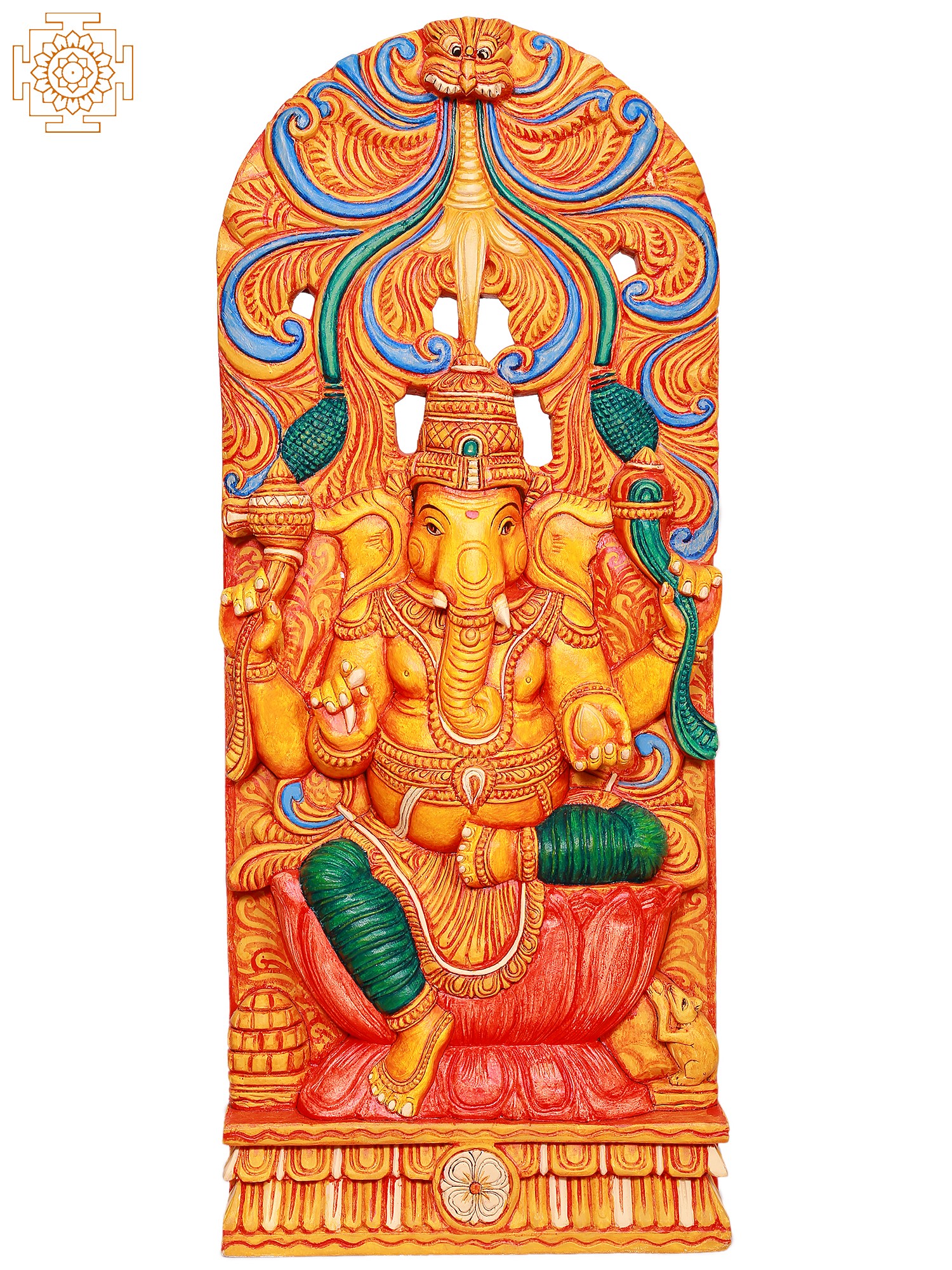 Invite the presence of wisdom, prosperity, and good fortune into your home with this magnificent wooden carving of Lord Ganesha. Seated majestically upon a vibrant, blooming lotus, this Chaturbhuja (four-armed) representation of the beloved elephant-headed deity is a testament to intricate craftsmanship and spiritual devotion. The rich, warm tones of the wood, highlighted by a playful yet reverent palette of colors, bring this divine form to life, creating a focal point that is both visually stunning and spiritually uplifting. Each detail, from the delicate ornamentation adorning Ganesha's form to the flowing, ornate archway behind him, has been meticulously carved, showcasing the skill of the artisan and the sacred imagery of Hindu tradition.