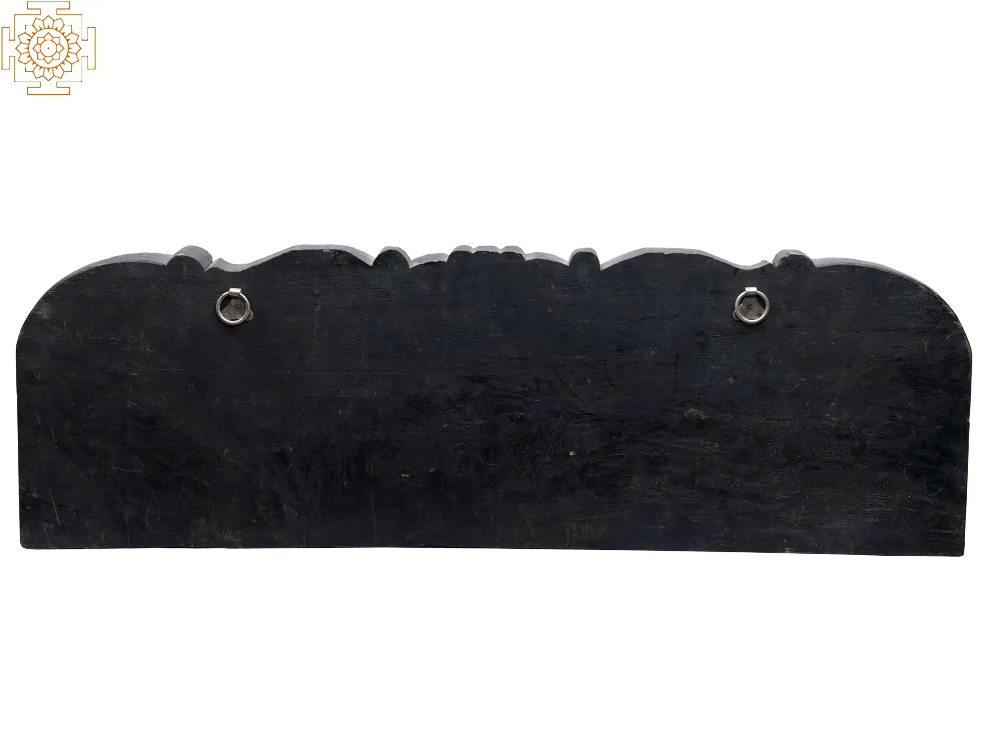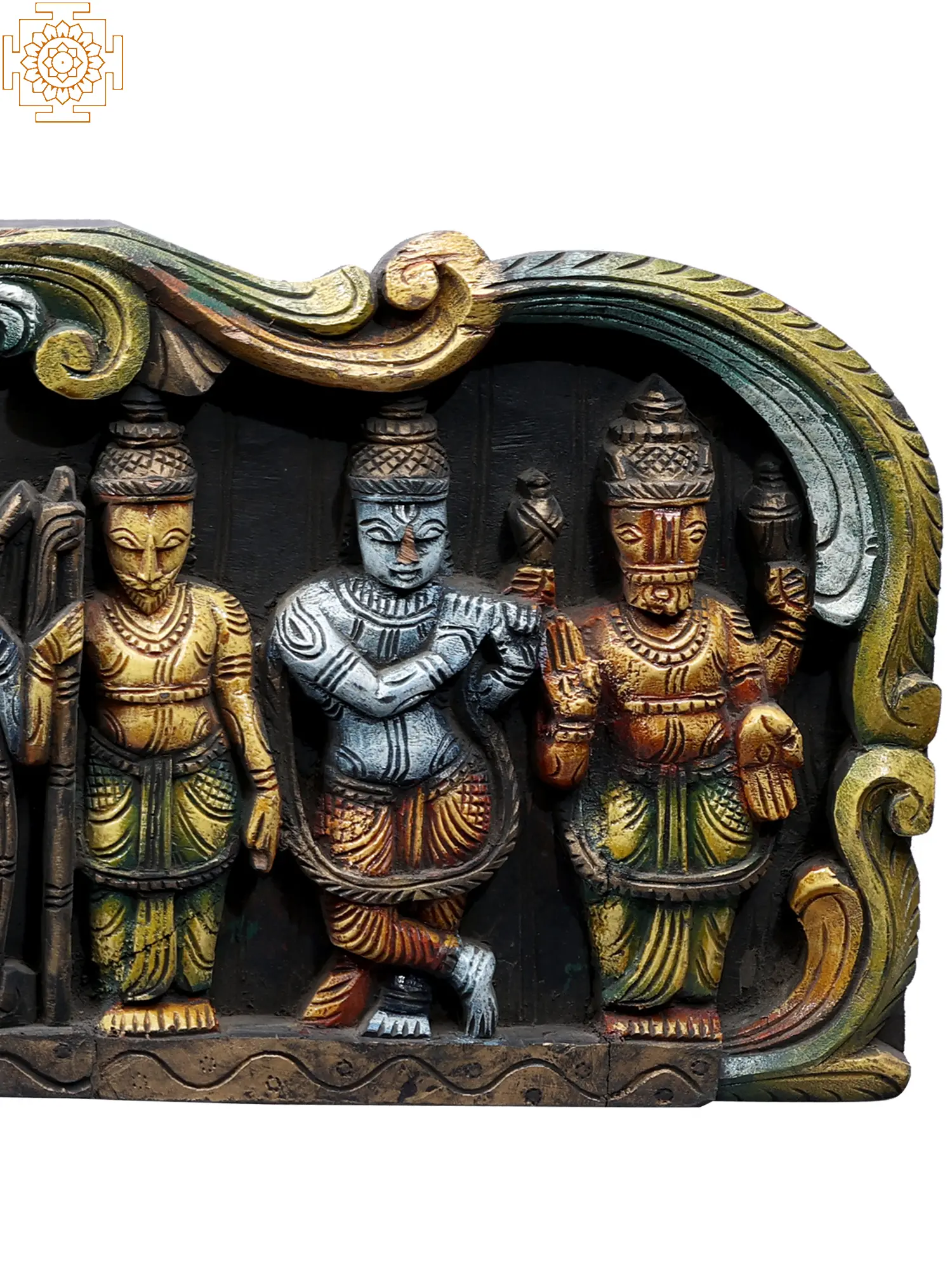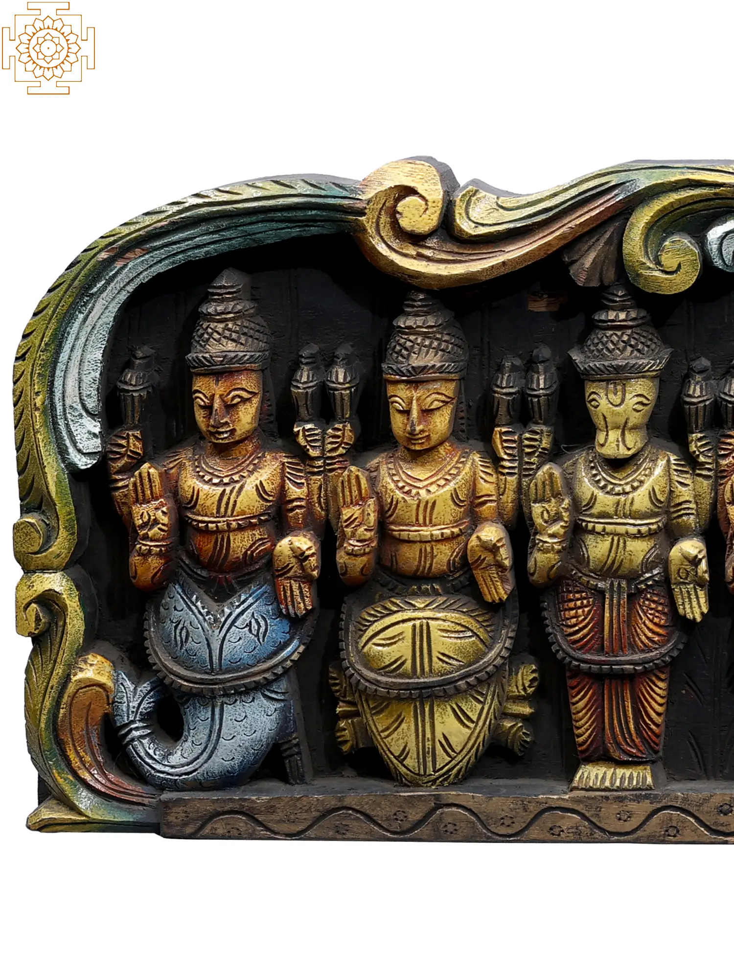 This wooden panel shows Lord Vishnu's dashavatara, illustrating the preserver deity's incarnations and divine evolution. From Kalki, the future warrior, to Matsya, the fish, each avatar represents various aspects of Vishnu's cosmic role in upholding justice and order in the universe. The panel's elaborate paintings or carvings describe each avatar's unique appearance and accompanying legends.