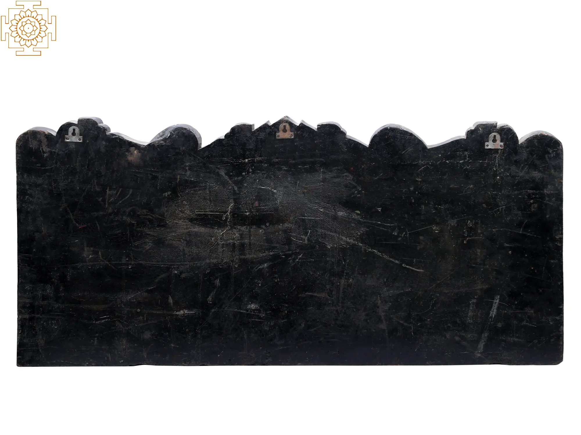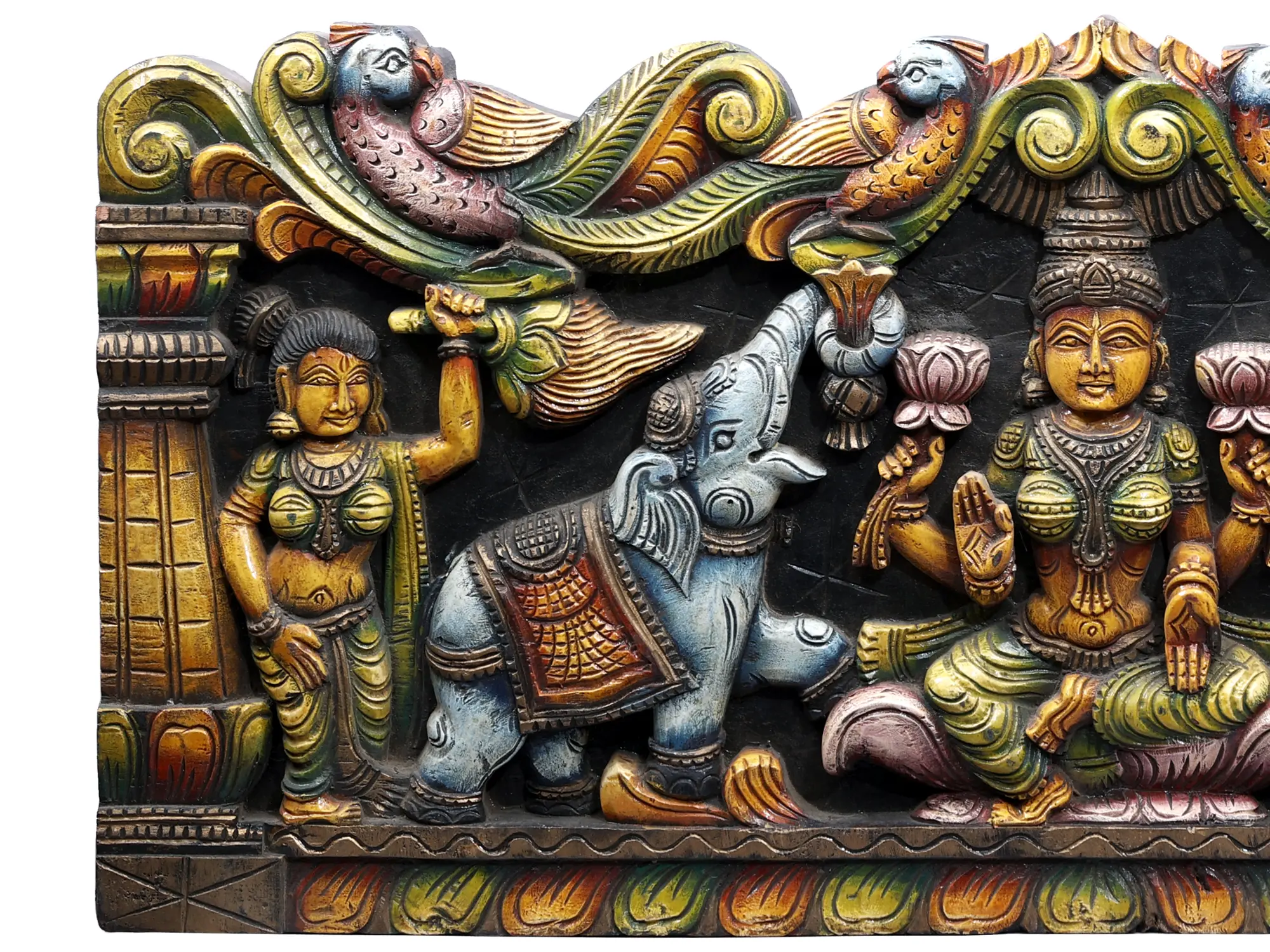 Each element of this panel has been painstakingly carved from wood, showcasing the skill and dedication of the artisan. The rich, earthy tones of the wood are brought to life with a palette of vibrant colors, each hue carefully chosen to accentuate the form and convey symbolic meaning. The intricate carvings of the goddess's jewelry, the detailed textures of the elephants' skin, and the delicate rendering of the lotus petals all speak to a profound understanding of both form and spirit. This piece is not merely carved; it is brought to life through its artistry, inviting contemplation and admiration. Its substantial size ensures it becomes a focal point, a statement piece that commands attention and inspires a sense of awe.