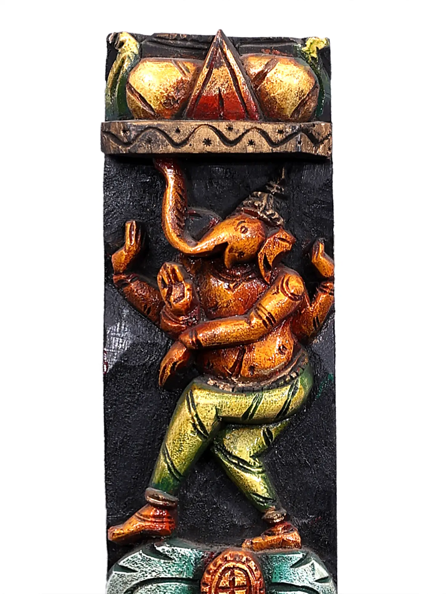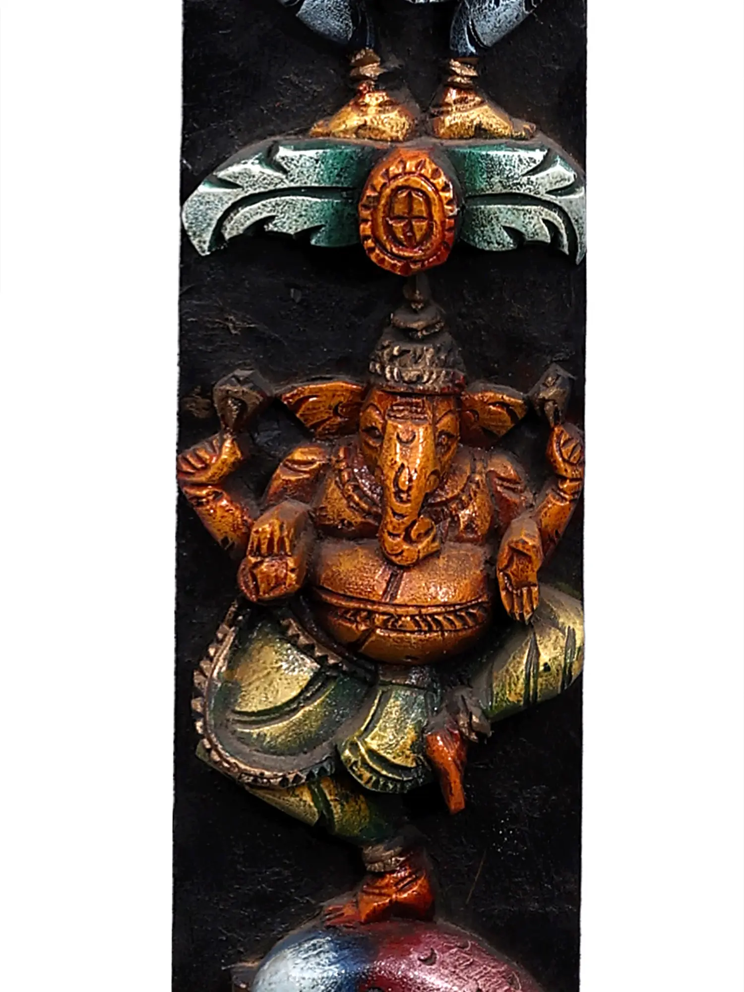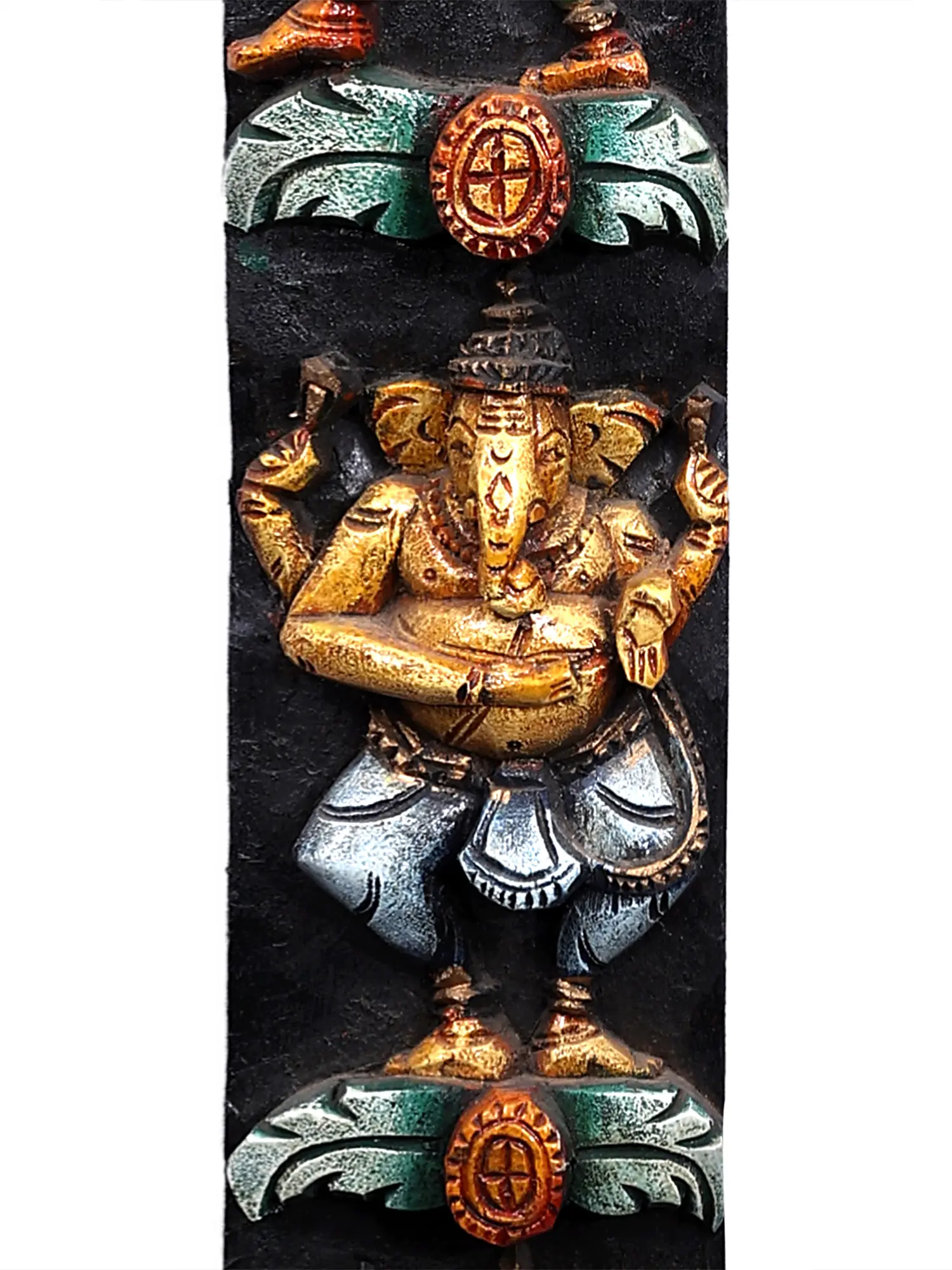 This panel is more than just a decorative piece; it's a gateway to ancient tales and spiritual narratives. The depiction of Ganesha often includes his celestial vehicle, the mouse, and symbols such as the modak (a sweet delicacy) and the discus. While not all these elements are explicitly visible in every section of this specific panel, the overall essence of Ganesha's divine play and his connection to the natural world, perhaps hinted at by the decorative elements at the base, resonates throughout the carving. The top section, with Ganesha in a lively dance pose, evokes the stories of his ecstatic celebrations and his joyous spirit that inspires devotion.