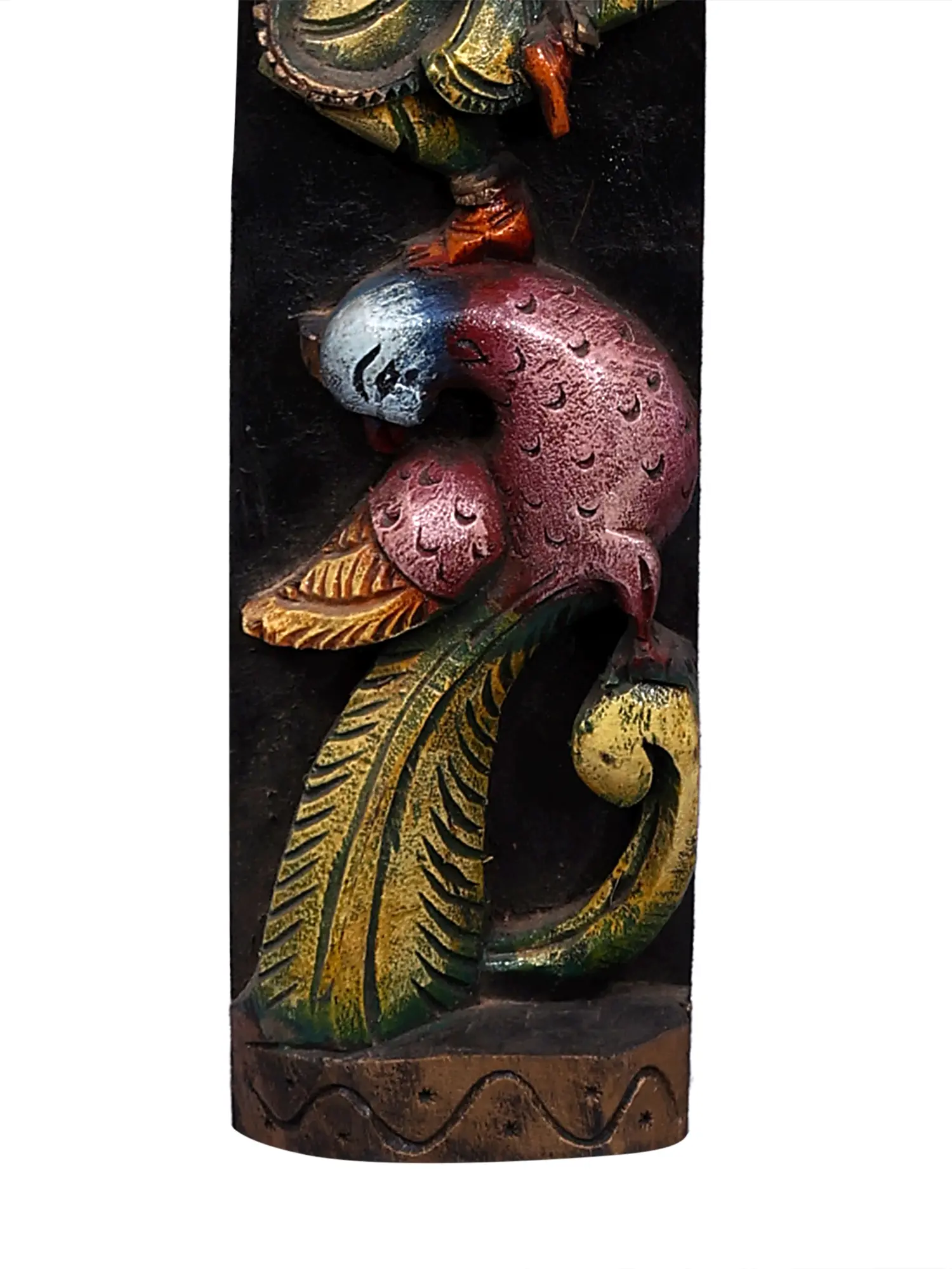 The vibrant hues adorning this wooden sculpture bring the divine figures to life. The rich tones of orange, gold, green, and hints of pink and blue create a visually captivating experience. Ganesha's garments are rendered with meticulous attention to detail, reflecting the opulence and grandeur associated with divinity. The craftsmanship is evident in every curve and contour, showcasing the skill of the artisans who have poured their devotion into this creation. The contrasting dark background serves to accentuate the illuminated figures, making them stand out with profound presence.
