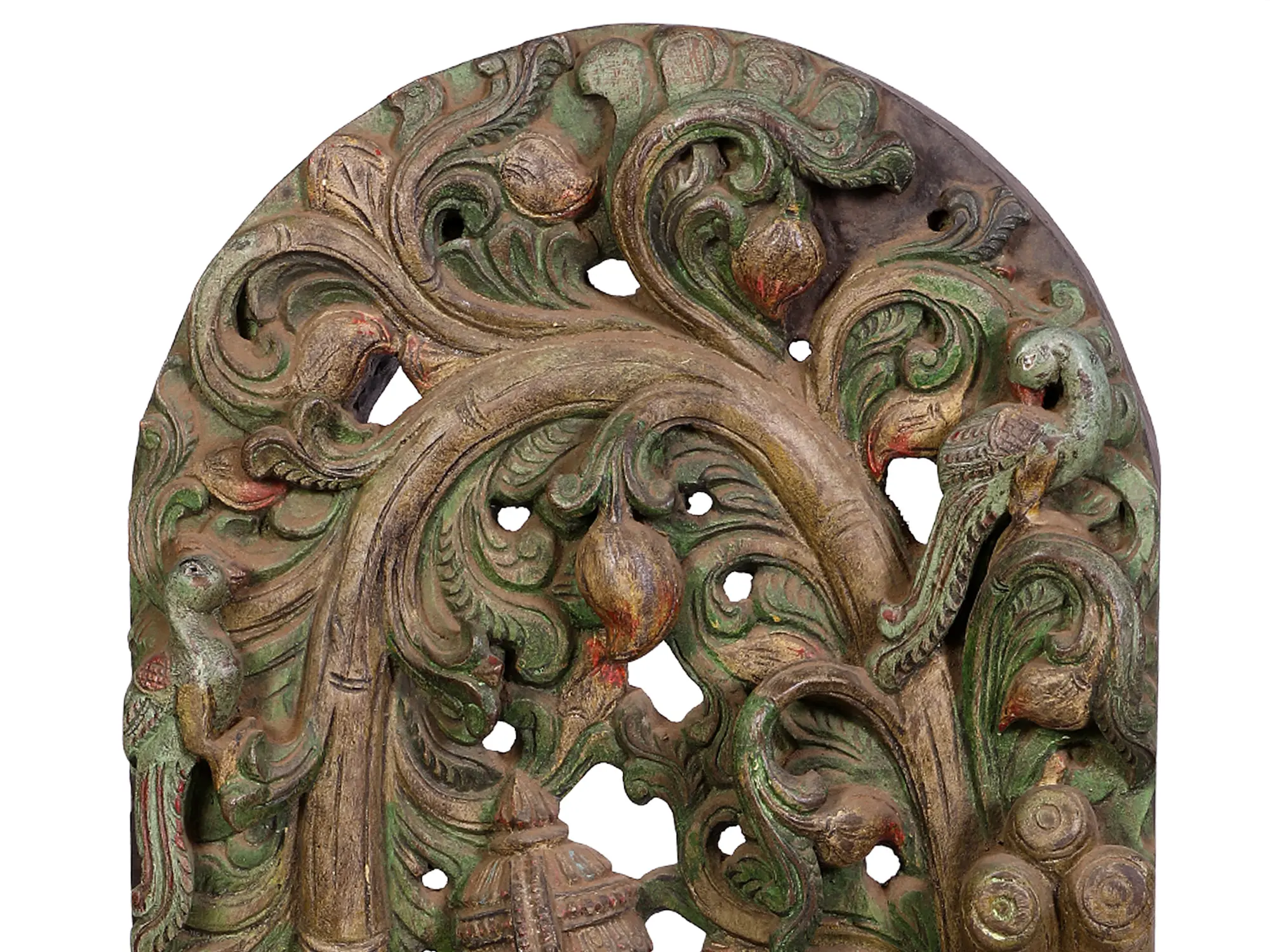 The backdrop of this Ganesha carving is a testament to the harmonious relationship between the divine and the natural world. Intricately carved foliage, reminiscent of lush tropical trees and blossoming flowers, frames the dancing deity. This natural setting underscores Ganesha's role as a deity associated with abundance and the fertility of the earth. Birds are often depicted in proximity to Ganesha, symbolizing his connection to all living beings and his role as a protector of nature. The detailed carving of these elements adds depth and complexity to the artwork, inviting closer inspection and contemplation. The aged finish, with its hints of verdigris and muted tones, suggests a piece that has been cherished and admired for generations, imbued with the prayers and devotion of countless individuals. This piece serves as a powerful reminder of the blessings that Ganesha bestows – wisdom, good fortune, and success in all endeavors. ––––––––––